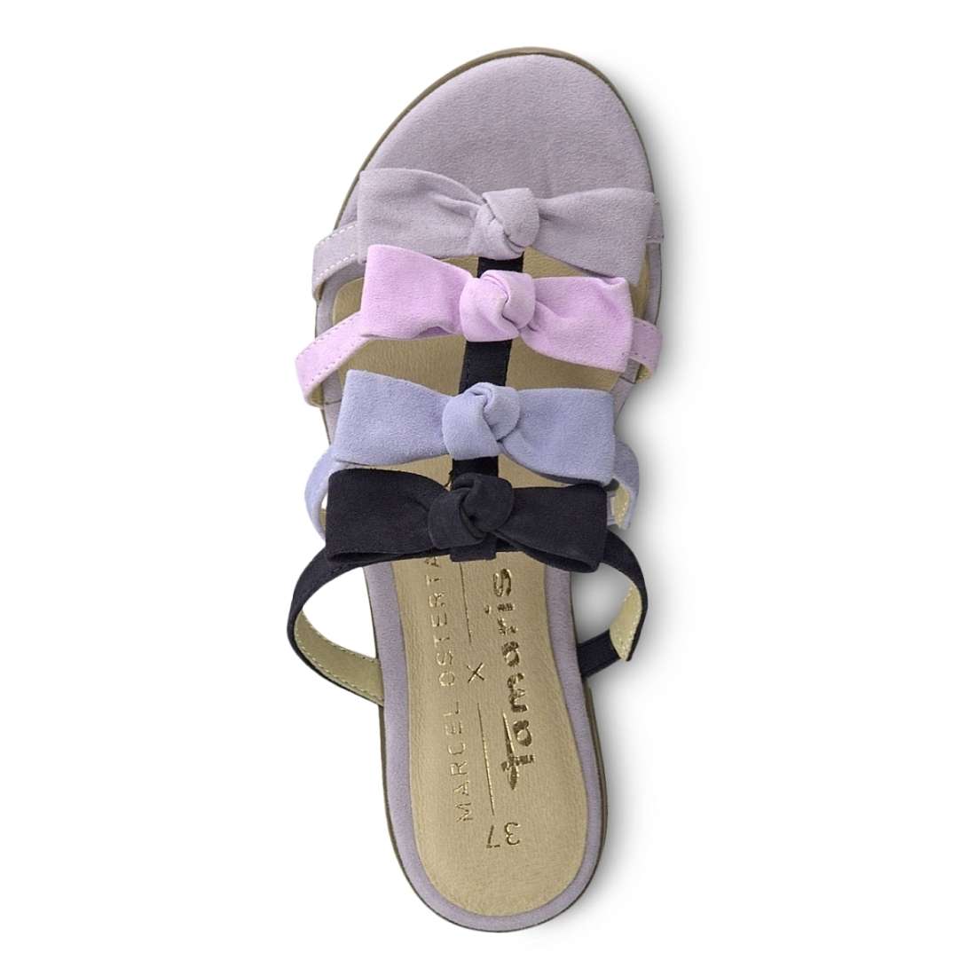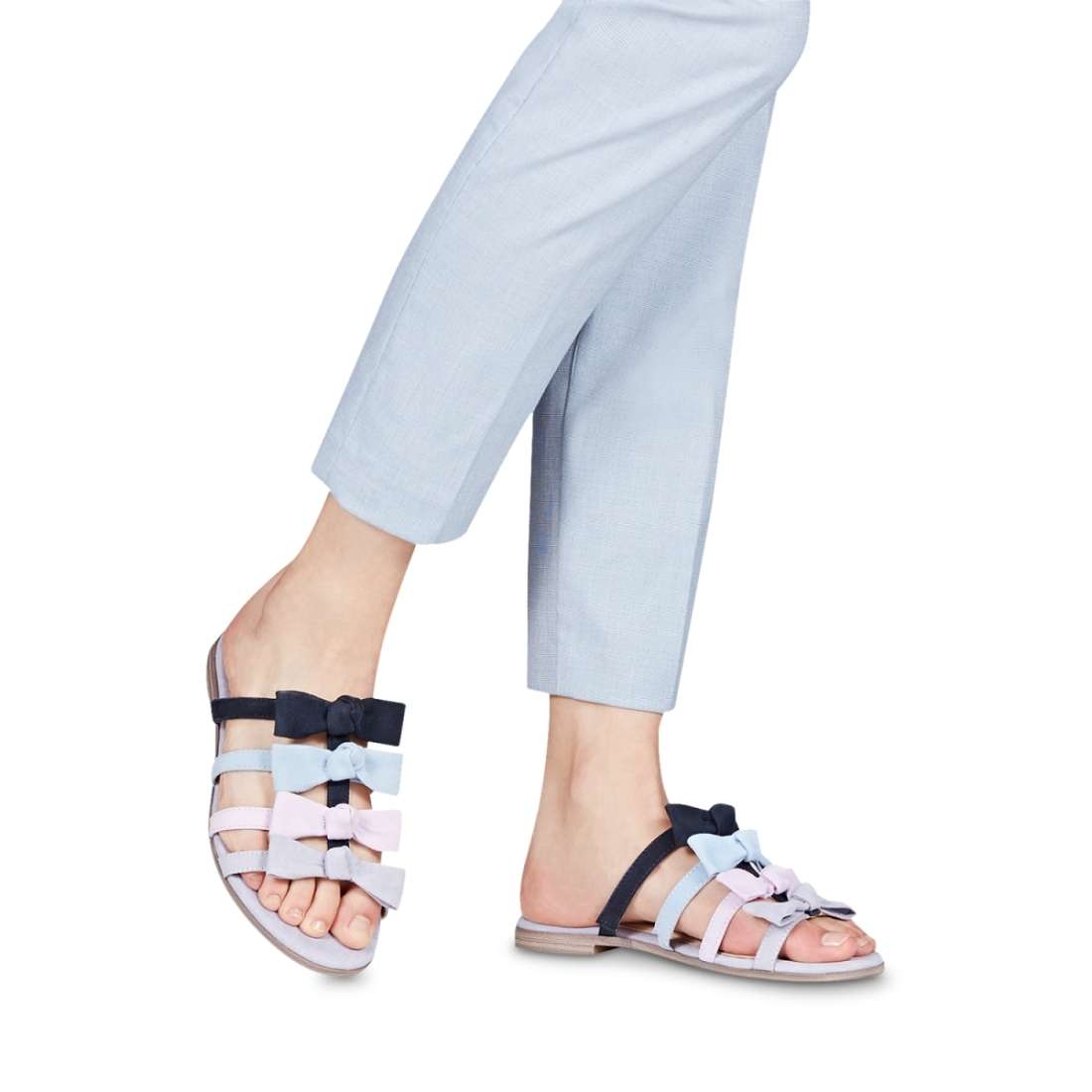 Nazouváky jejichž svršek nabízí čtyři rozličné odstíny barev v kombinaci s ozdobnými mašličkami. Tato obuv již na první pohled působí velmi roztomilým dojmem a skvěle ozvláštní Váš letní outfit.