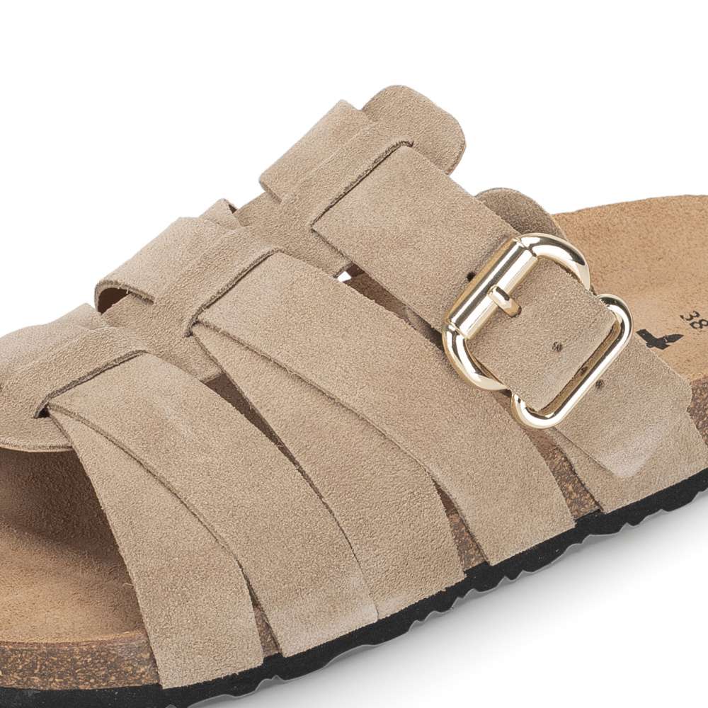 Objevte kožené nazouváky, které spojují nadčasový styl a pohodlí, na které si rychle zvyknete. Tento model je navržen s precizně poskládaných pásků, které vytvářejí stabilní oporu chodidla, zatímco samostatný pásek s kovovou přezkou umožňuje přesné přizpůsobení šířky. Díky tomu botu snadno upravíte tak, aby perfektně seděla právě vám. Celokožené provedení doplňuje kožená stélka, která poskytuje příjemný došlap i během celodenního nošení. Podešev v korkovém vzhledu dodává nazouvákům lehce přírodní, letní charakter a zároveň působí moderně a svěže. Pohodlí, které si zamilujete — a design, který jen tak neomrzí. To jsou boty značky Tamaris.