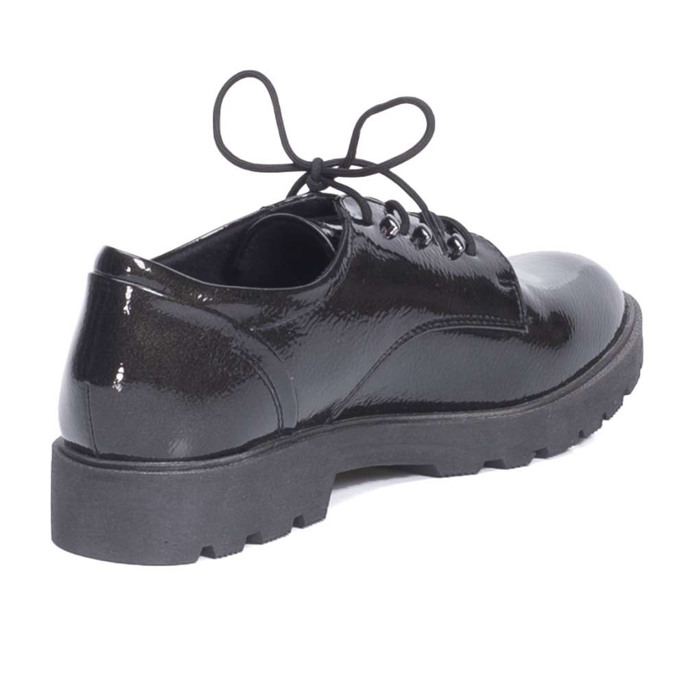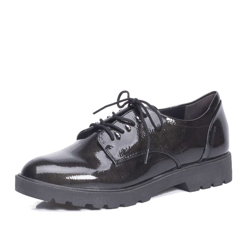 Úžasné dámské polobotky antracitové barvy zdobené lesklým povrchem svršku. Mají kulatou špičku, designové šití a šněrování, kterým si obuv upravíte přímo k vlastní noze. Tento elegantní model má mnoho využití. Můžete si je vzít na procházku s přáteli nebo do práce.