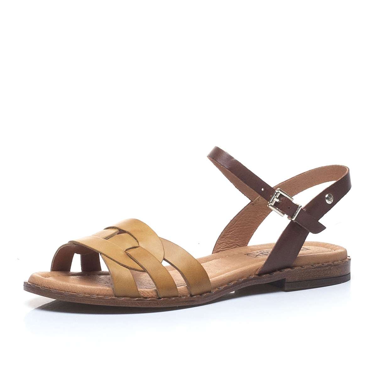 Dámské kožené sandálky značky PIKOLINOS, zdobené propletenými pásky v oblasti nártu a barevně doladěným páskem kolem paty.