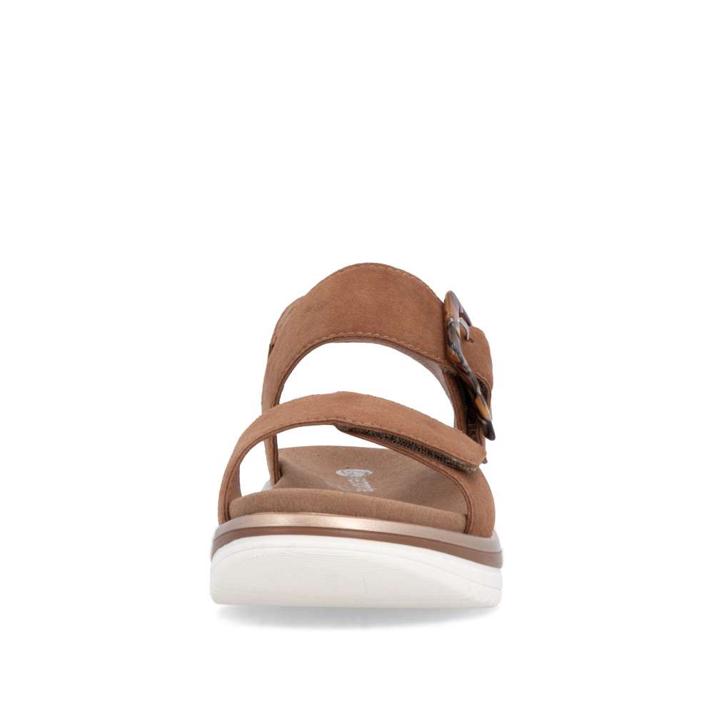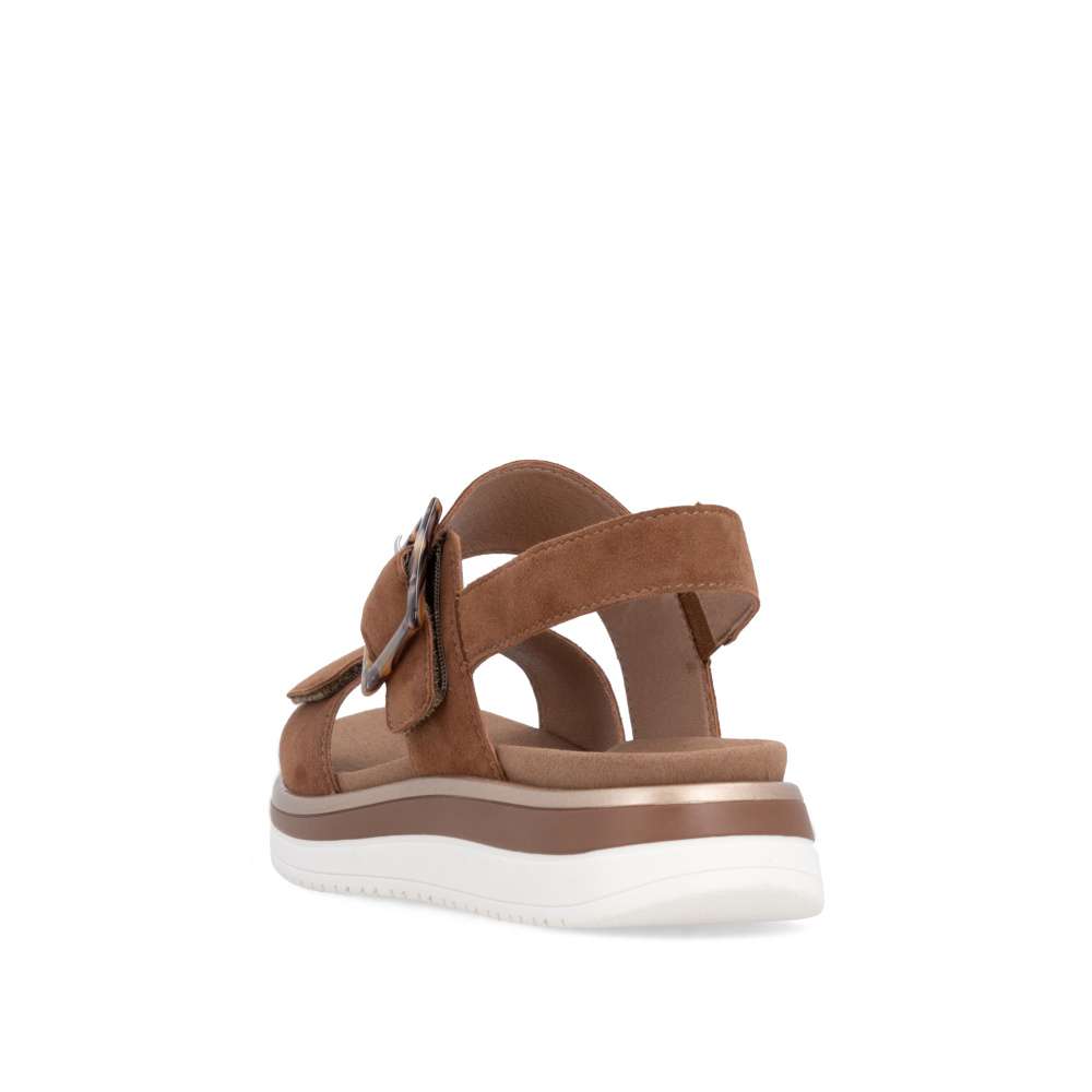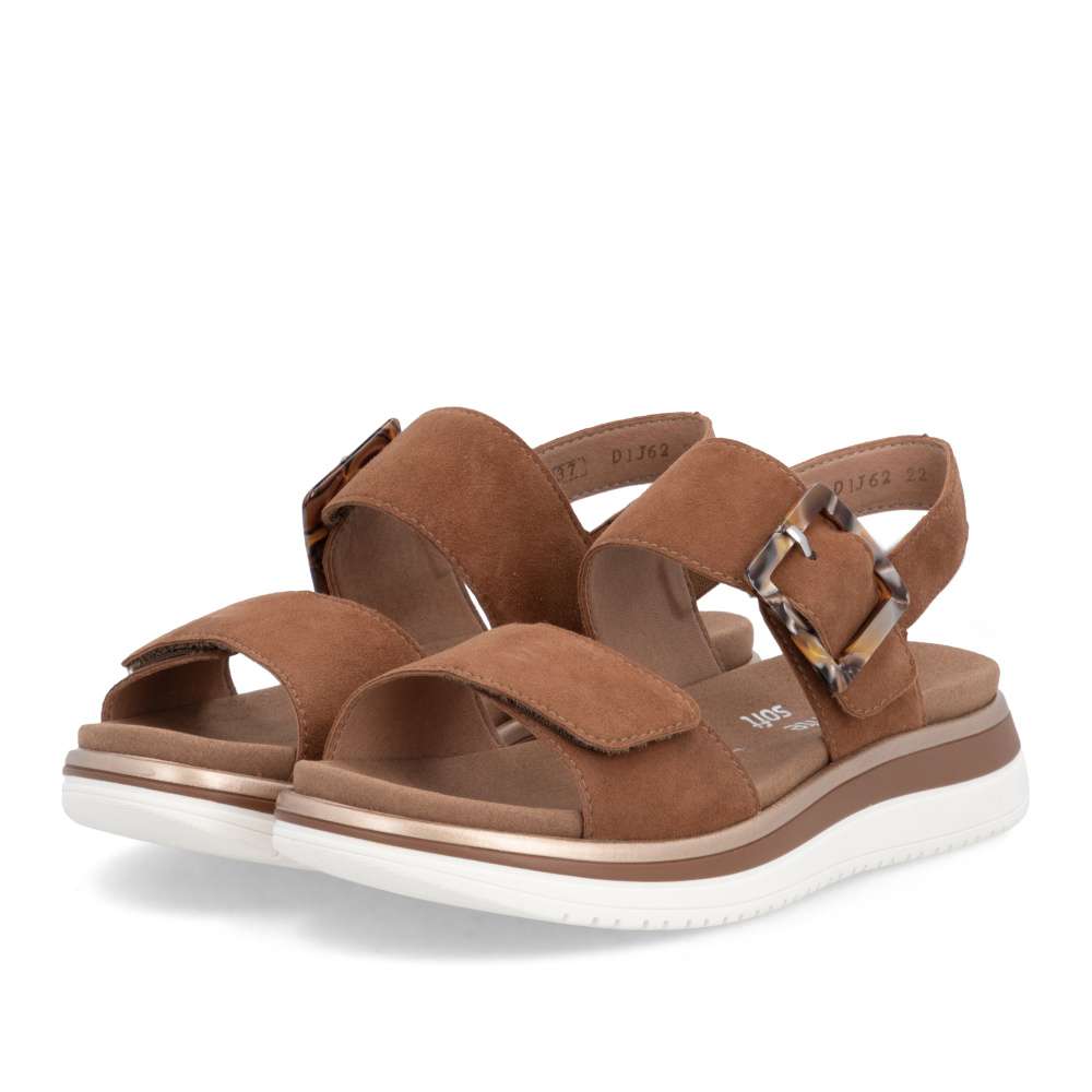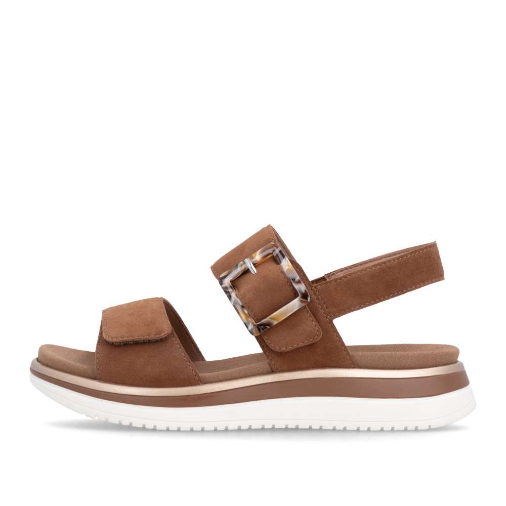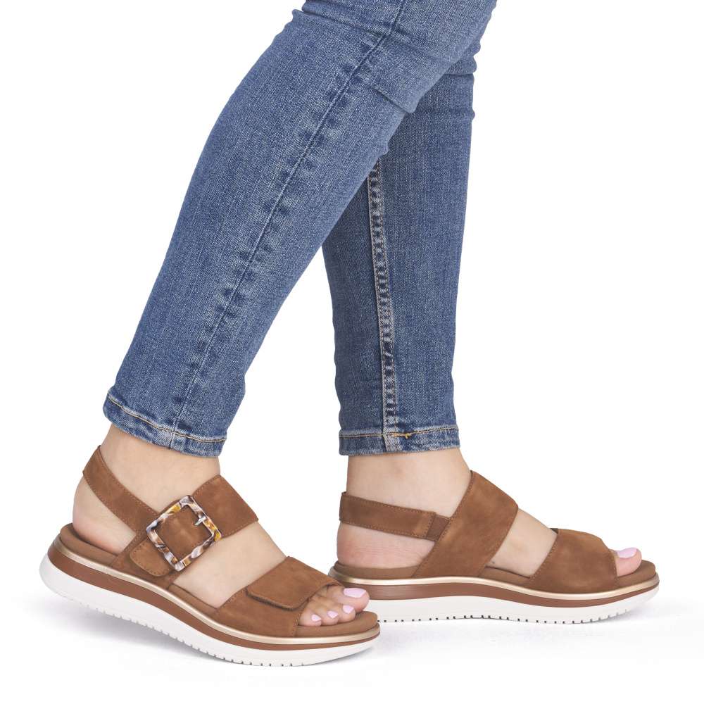 Obuv REMONTE představuje prémiovou řadu značky RIEKER, která se vyznačuje vysokou kvalitou použitých materiálů a precizním zpracováním. Tyto sandály RIEKER zaujmou již na první pohled svým stylovým designem a následně poskytovaným výjimečným komfortem, který oceníte při každém kroku. Hnědý kožený svršek působí elegantně a nadčasově, díky čemuž sandály snadno zkombinujete s různými letními outfity. Jedinečným detailem, který okamžitě upoutá pozornost, je výrazná spona na pásku u kotníku, která dodává obuvi osobitý charakter. Oba pásky jsou vybaveny praktickým suchým zipem, který umožňuje rychlé a pohodlné obouvání, a zároveň zajišťuje optimální přizpůsobení noze. Díky tomu se sandály příjemně přizpůsobí tvaru chodidla a nabídnou maximální pohodlí při celodenním nošení. Vyjímatelná textilní stélka poskytuje nejen komfort při každém došlapu, ale také mimořádnou praktičnost. Možnost snadného vyjmutí a očištění zajišťuje, že obuv zůstává svěží, hygienická a připravená k dalšímu nošení – což oceníte zejména v horkých letních dnech. Vyšší podešev s atraktivním, moderním designem dodává sandálům stabilitu, přičemž esteticky zvýrazňuje jejich elegantní vzhled. Tyto sandály RIEKER představují dokonale vyváženou kombinaci esteticky přitažlivého designu, promyšlených praktických detailů a vysoké úrovně pohodlí. Jsou ideální volbou pro každodenní nošení, volnočasové aktivity io něco elegantnější příležitosti, kde se chcete cítit stylově a zároveň pohodlně.
