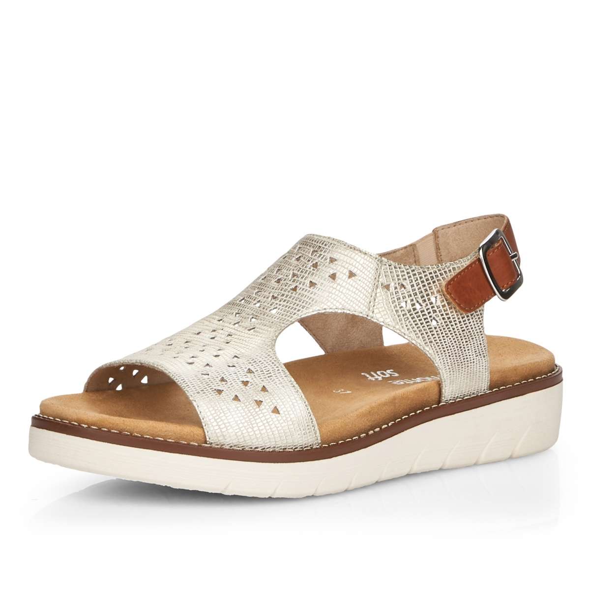Dámské sandály REMONTE (vyšší řada značky RIEKER) s perforovaným svrškem ve zlaté metalické barvě a hnědým detailem pásku. Obuv se zapíná zadním kotníkovým páskem, díky kterému si je můžete utáhnout podle představ. Model určený každé ženě, co má ráda styl ale zároveň svoje pohodlí.