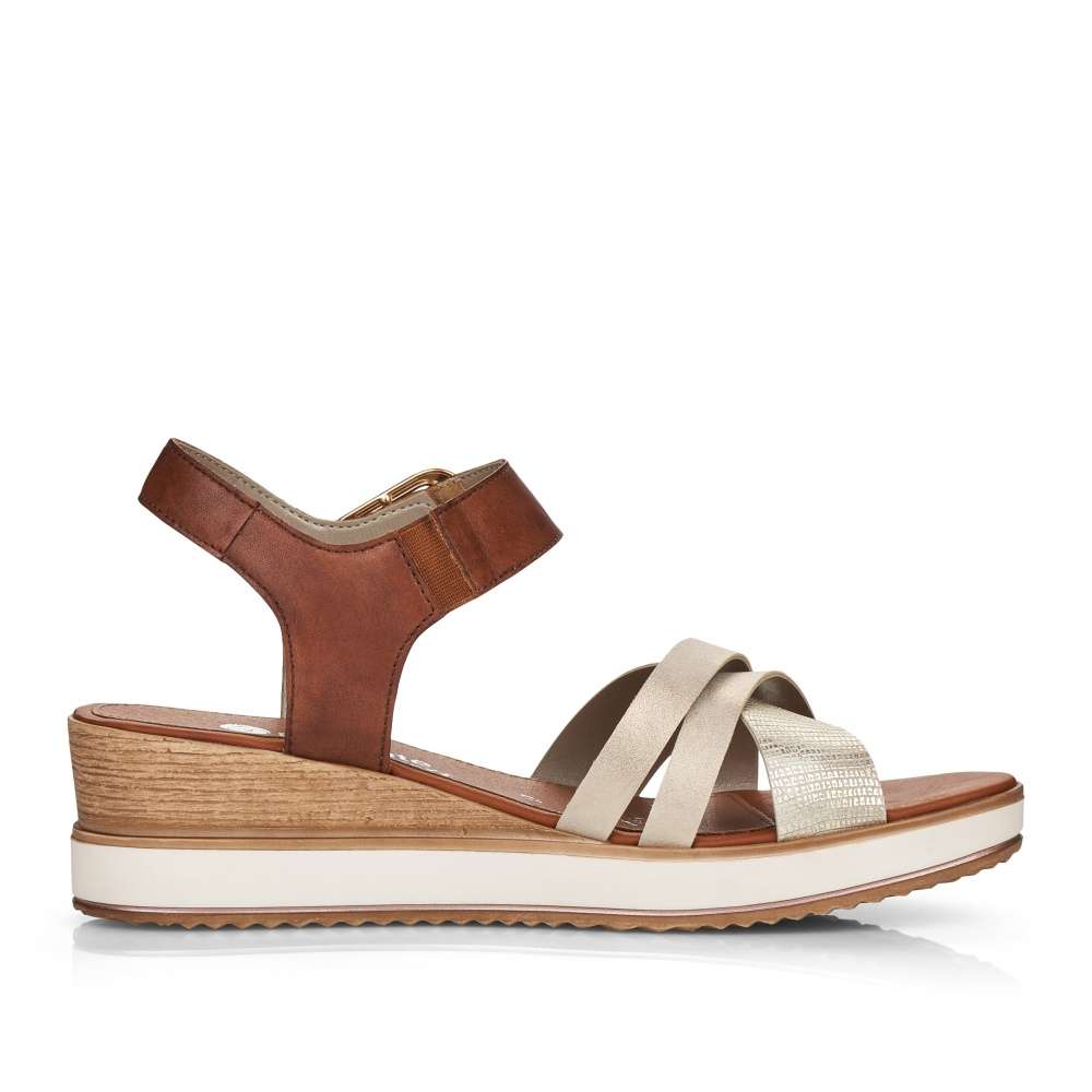 Obuv REMONTE – jedná se o vyšší řadu značky RIEKER, tato obuv se vyznačuje vynikající kombinací svrchních materiálů. Pásky přes nárt připomínají hadí kůži, a tak sandálky upoutají pozornost na první pohled. Pro upevnění chodidla je zde suchý zip, pro ozdobu slouží přezka s logem značky. Kožená stélka je vyrobena z paměťové pěny, a spolu s jemnou podšívkou budou věrné společnice na dlouhé dny i večery. Tento kousek si můžete vzít do kavárny, do kina, nebo na procházky do parku.