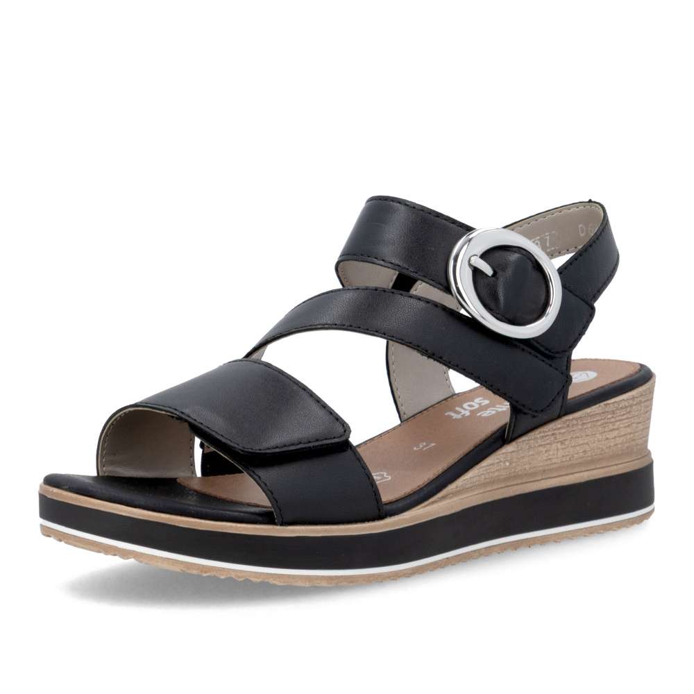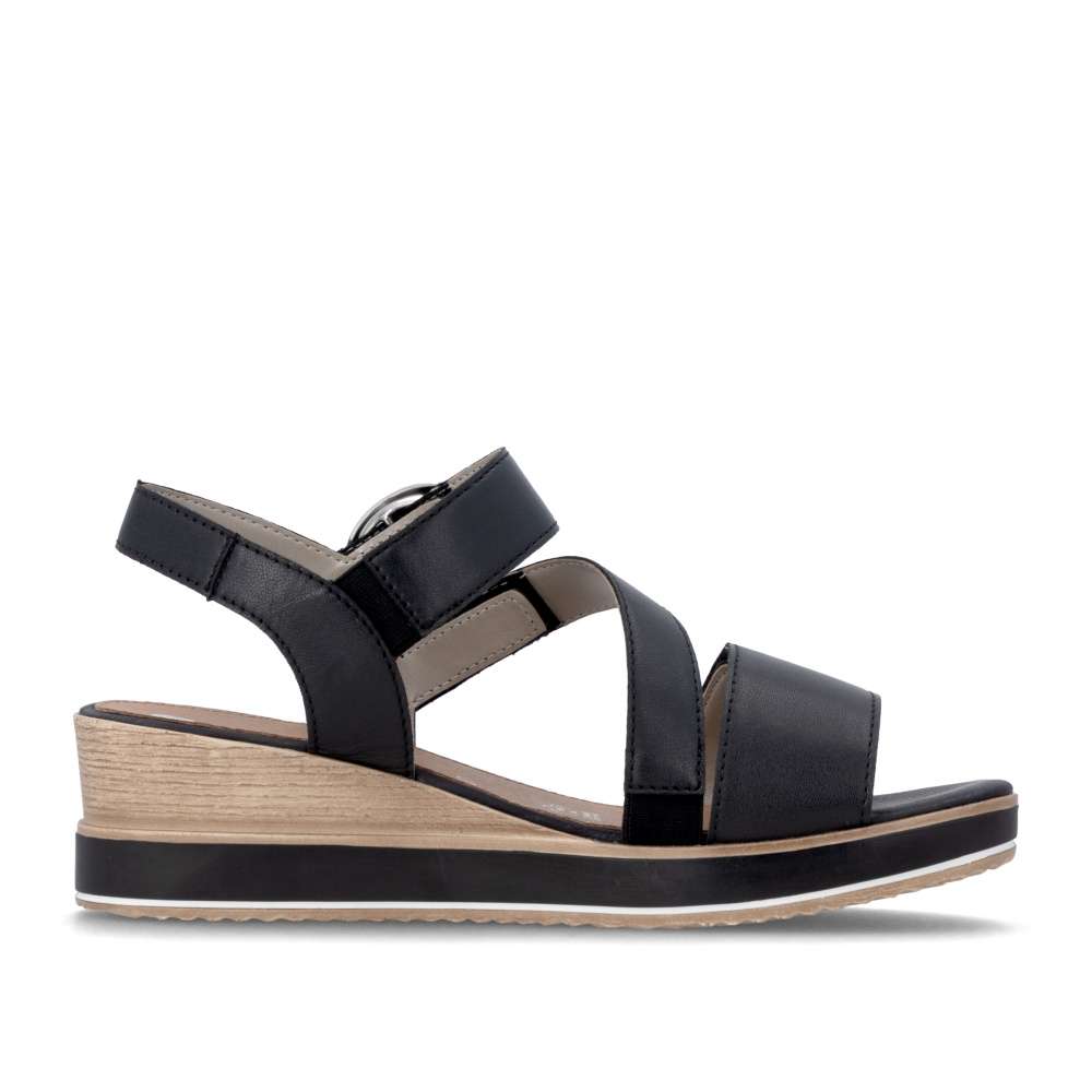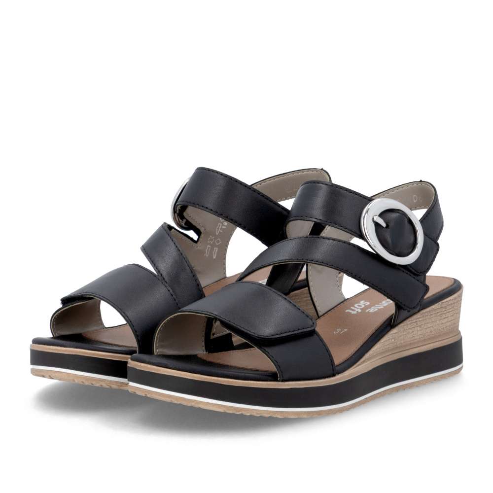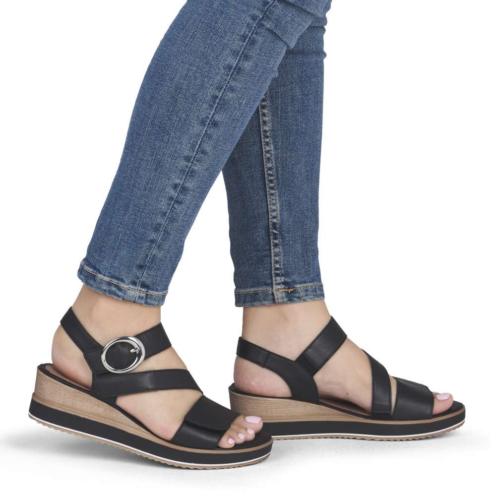 Obuv REMONTE představuje prémiovou řadu značky RIEKER, která se vyznačuje vysokou kvalitou použitých materiálů a precizním zpracováním. Tyto kožené sandály RIEKER v nadčasové černé barvě jsou ideálním spojením elegantního designu a praktické funkčnosti. Svršek je tvořen pásky vytvářejícími vizuálně zajímavý a působivý vzhled, který okamžitě přitáhne pozornost. Pásek u kotníku je doplněn výraznou stříbrnou sponou, která dodává sandálům luxusní detail. Praktické suché zipy umožňují snadné obouvání a zároveň zajišťuje, že sandály perfektně padnou na nohu. Komfortní stélka poskytuje příjemný došlap každým krokem a vyšší podešev jemně zvýrazní ženský půvab. Sandály RIEKER jsou skvělou volbou pro různé příležitosti – od procházek městem, přes každodenní nošení do práce, až po elegantní letní večery.