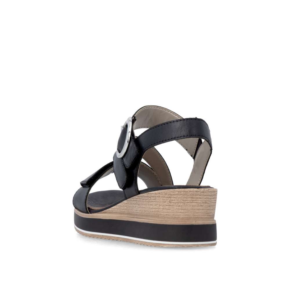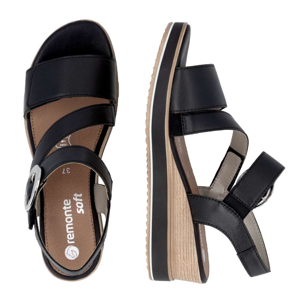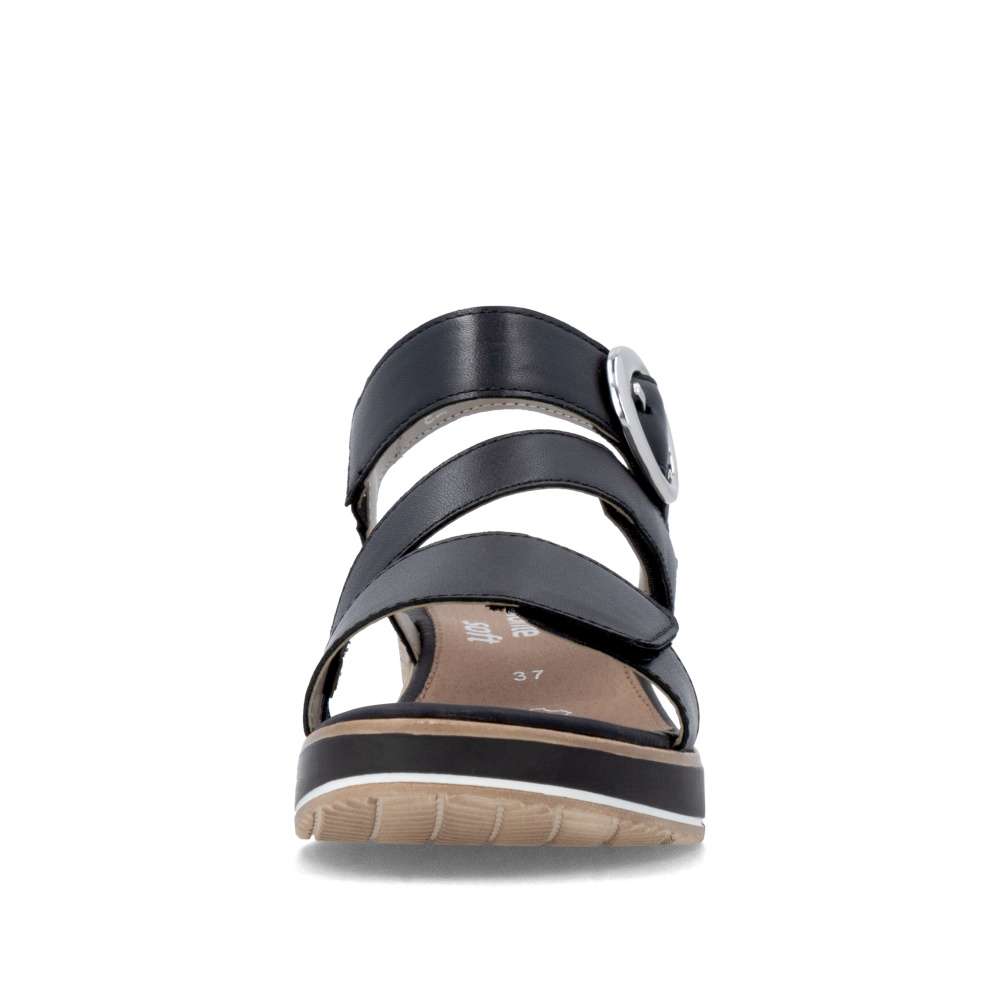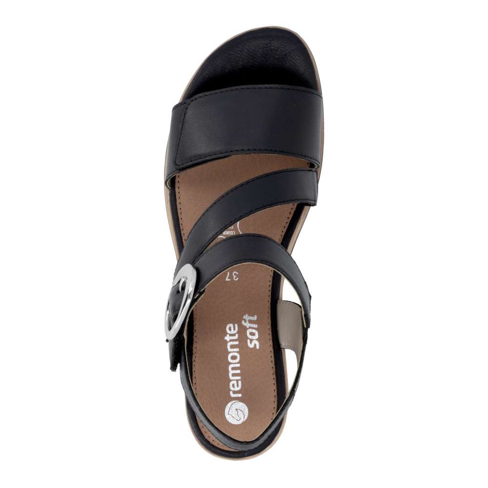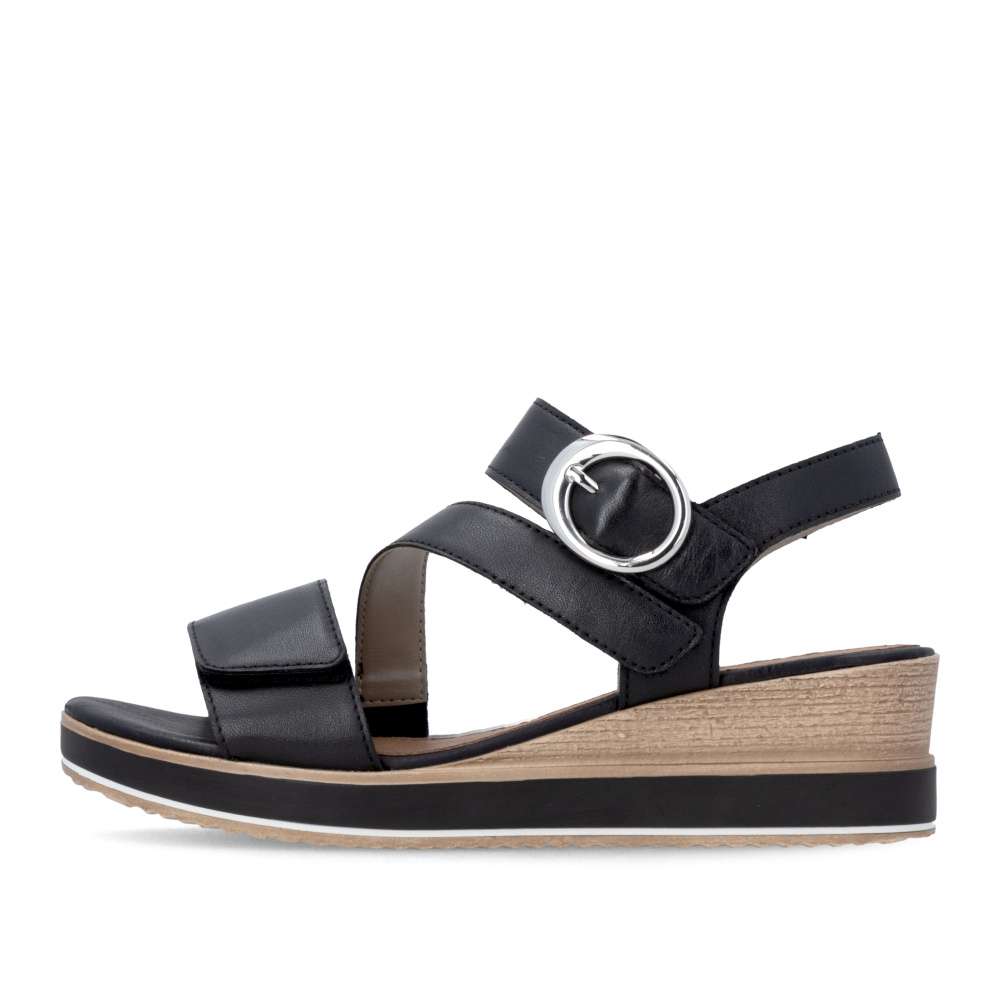 Obuv REMONTE představuje prémiovou řadu značky RIEKER, která se vyznačuje vysokou kvalitou použitých materiálů a precizním zpracováním. Tyto kožené sandály RIEKER v nadčasové černé barvě jsou ideálním spojením elegantního designu a praktické funkčnosti. Svršek je tvořen pásky vytvářejícími vizuálně zajímavý a působivý vzhled, který okamžitě přitáhne pozornost. Pásek u kotníku je doplněn výraznou stříbrnou sponou, která dodává sandálům luxusní detail. Praktické suché zipy umožňují snadné obouvání a zároveň zajišťuje, že sandály perfektně padnou na nohu. Komfortní stélka poskytuje příjemný došlap každým krokem a vyšší podešev jemně zvýrazní ženský půvab. Sandály RIEKER jsou skvělou volbou pro různé příležitosti – od procházek městem, přes každodenní nošení do práce, až po elegantní letní večery.