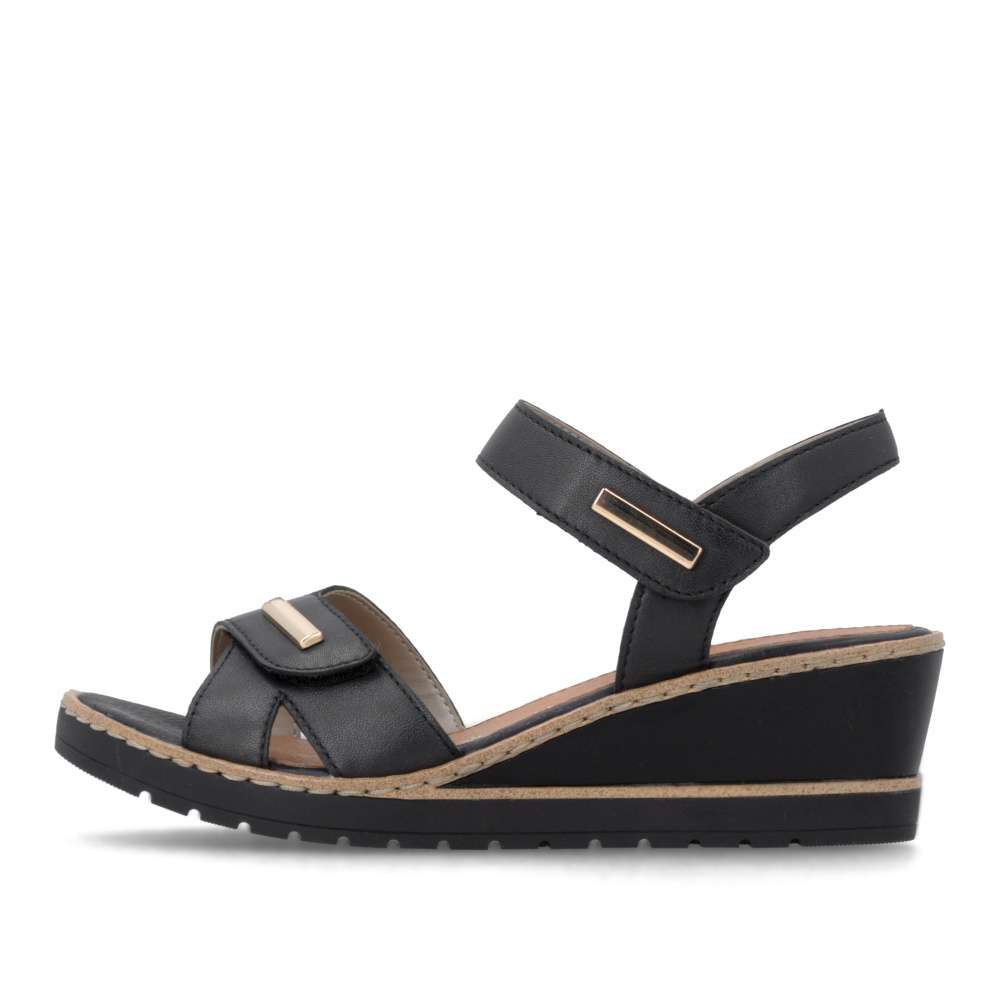 Obuv REMONTE představuje prémiovou řadu značky RIEKER, která se vyznačuje vysokou kvalitou použitých materiálů a precizním zpracováním. Černé kožené sandály RIEKER s jemnými zlatými aplikacemi působí elegantně a dokonale podtrhnou letní atmosféru. Jejich nadčasový design snadno zkombinujete s jakýmkoli outfitem. Praktické pásky se suchým zipem zajistí rychlé obutí a perfektní přizpůsobení tvaru chodidla, díky čemuž se budete cítit pohodlně po celý den. Klínový podpatek decentně zvýrazní ženskou siluetu, opticky prodlouží nohy a zároveň poskytne stabilitu při chůzi. O maximální komfort se postará kožená stélka, která je příjemná i při celodenním nošení. Tyto sandály jsou ideální volbou pro ženy, které hledají spojení elegance a pohodlí – skvěle vás budou doprovázet do práce, na městské procházky i na letní společenské příležitosti.
