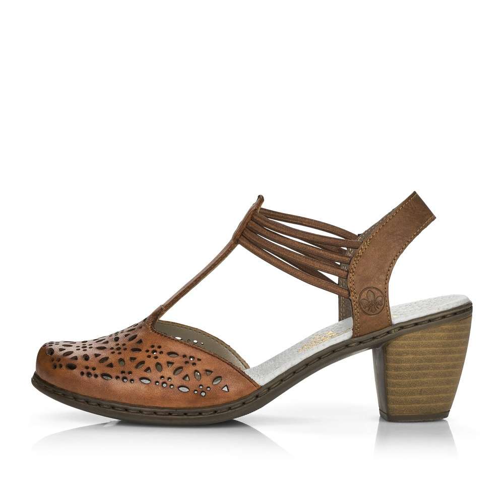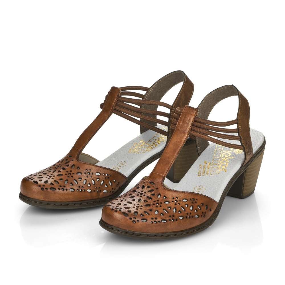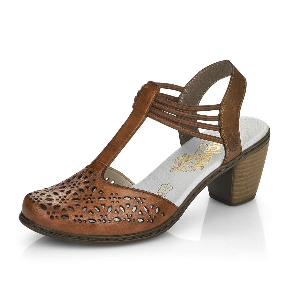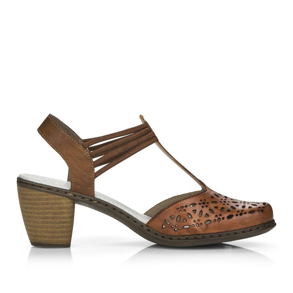 Detailní informace Dámský sandál značky RIEKER unosíte během horkých letních dnů. Svršek je zdobený designovou perforací, která zajistí prodyšnost obuvi. Pro snadné obutí slouží gumičky kolem kotníku. Měkká stélka a podešev vybavená technologií Antistress na nízkém podpatku zajistí pohodlnou a elegantní chůzi. Tento model je skvělou volbou k letním outfitům do města, do kina i do práce.