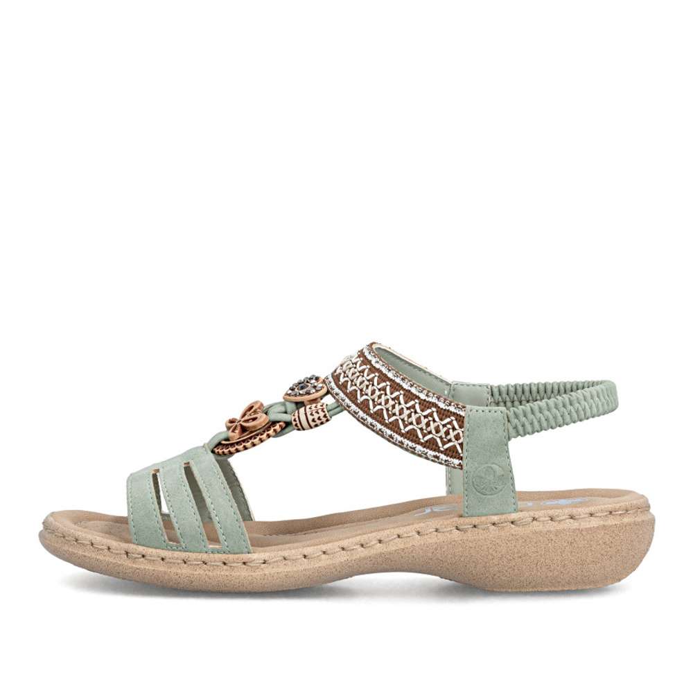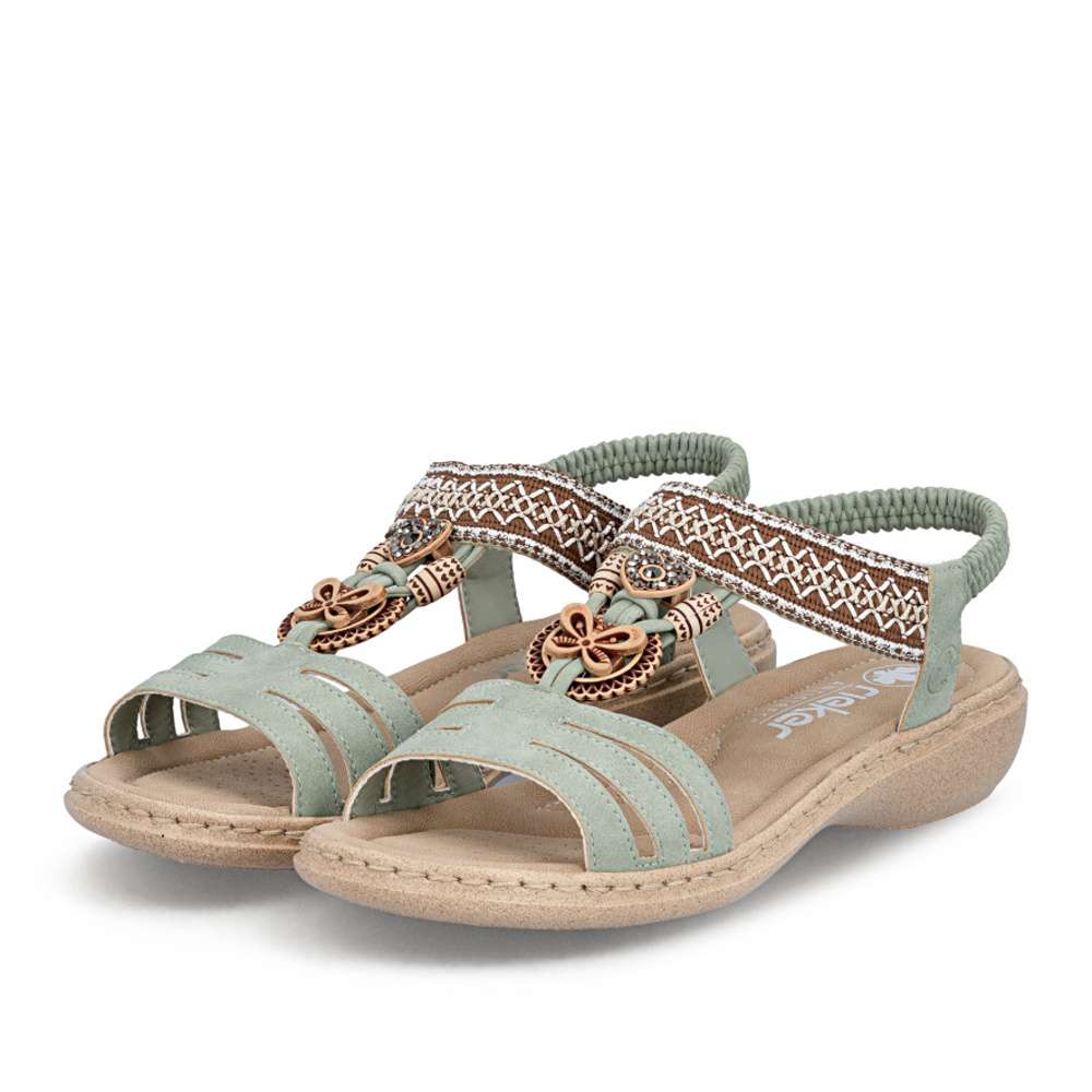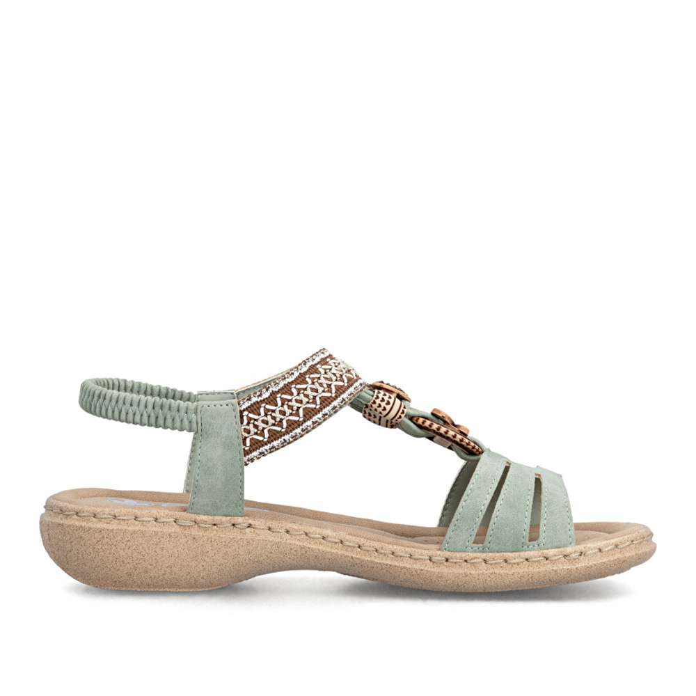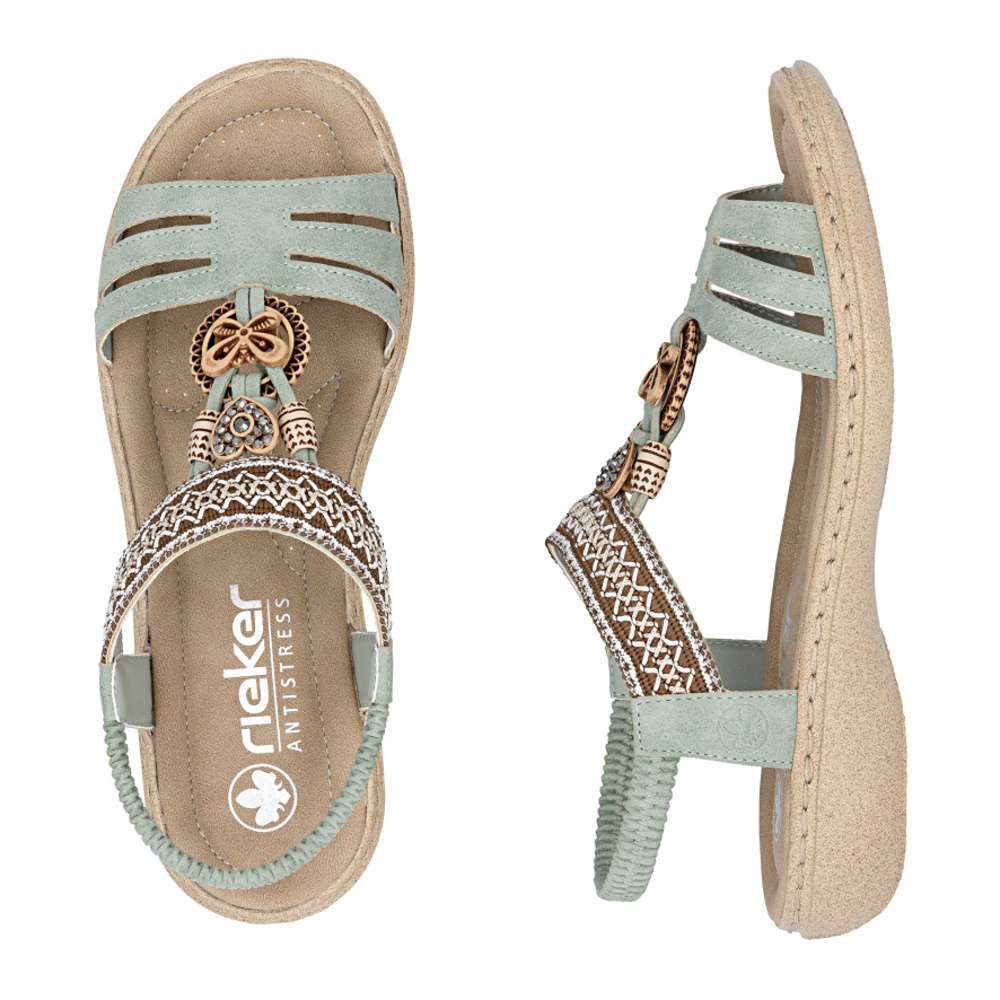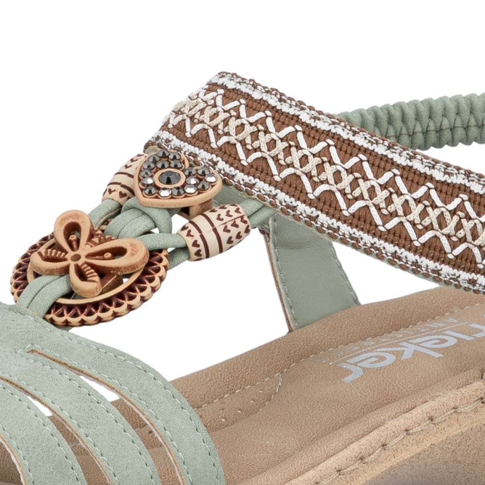 Sandály RIEKER se vyznačují jedinečným stylem, který vzniká kombinací materiálů a půvabných ozdobných aplikací. Nártový pásek je unikátní svým detailním zdobením, které okamžitě upoutá pozornost a dodává sandálům jedinečný charakter. Pružný zadní pásek umožňuje snadné nazutí a dokonalé přizpůsobení noze, zatímco příjemná stélka zajišťuje komfort při každém kroku. Flexibilní podrážka s tlumením nárazů zajišťuje přirozený pohyb a stabilitu, takže se budete cítit pohodlně a lehce při každém kroku. Tyto sandály RIEKER spojují styl, komfort a praktičnost, čímž se stávají ideální volbou pro ženy, které chtějí vyniknout a zároveň si užívat pohodlí při každodenním nošení.