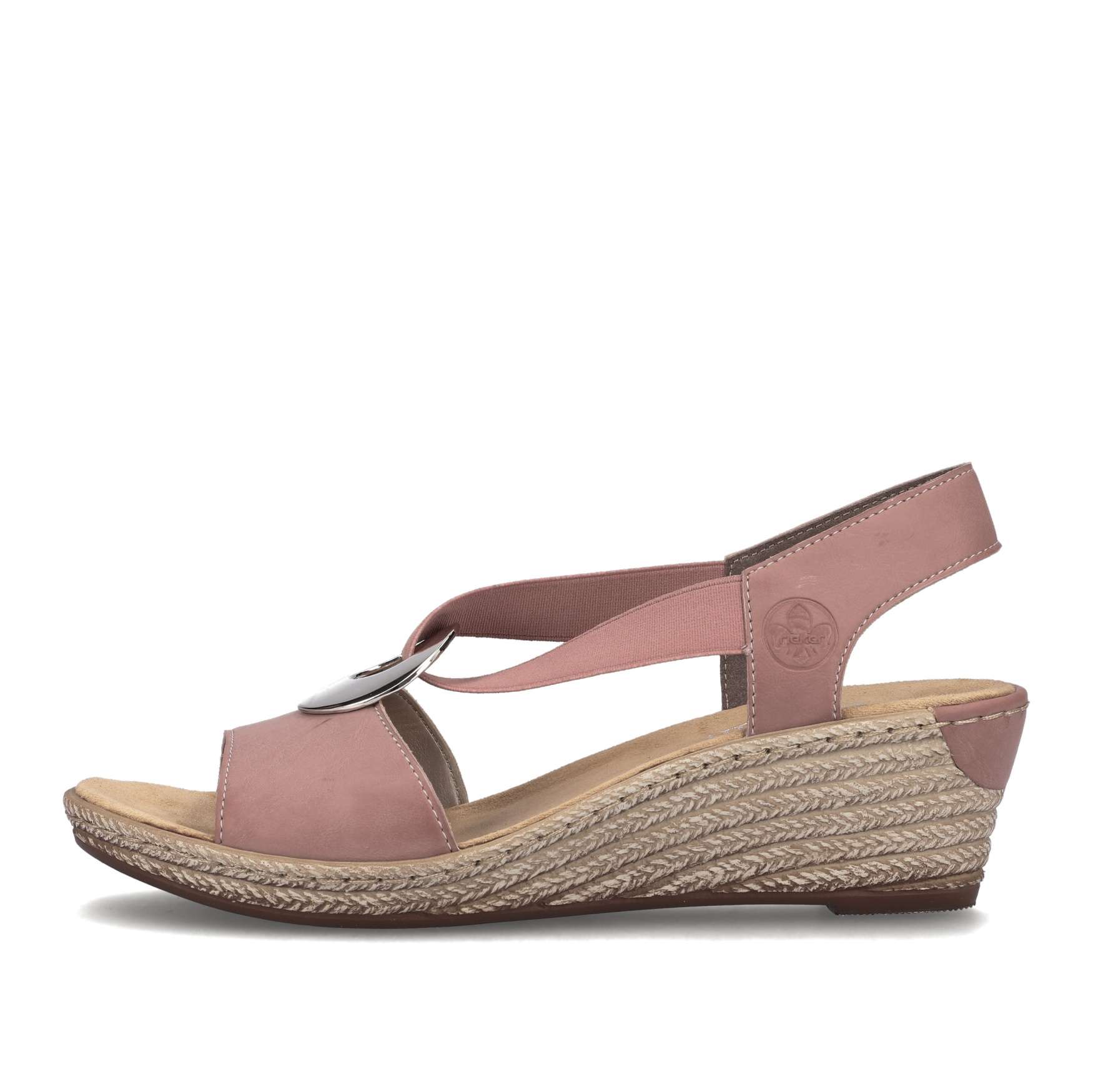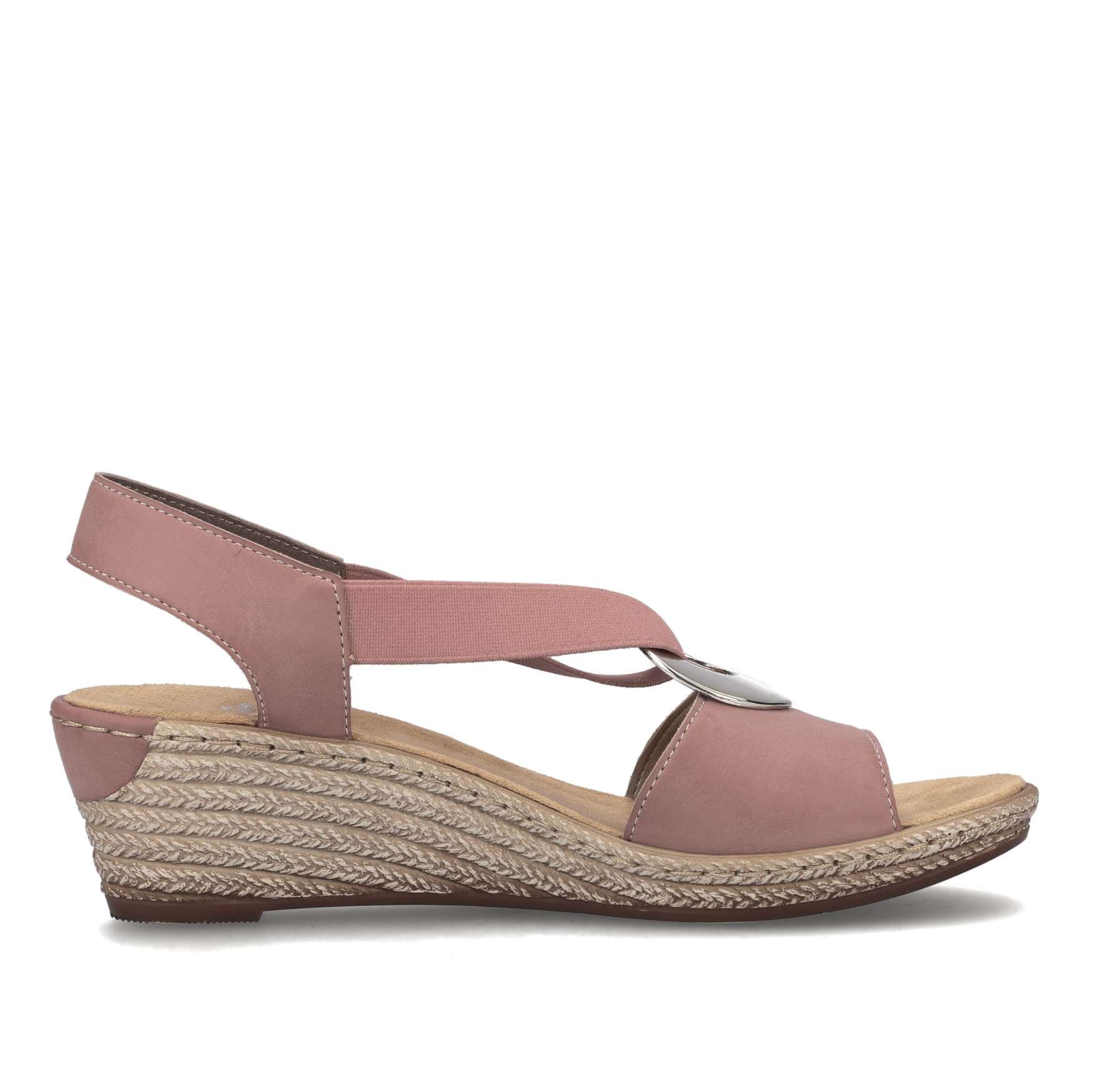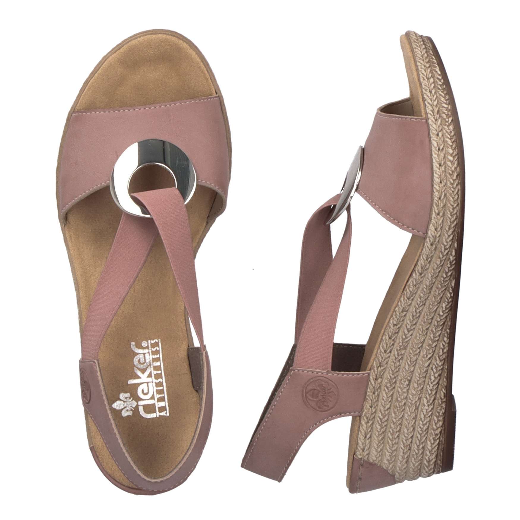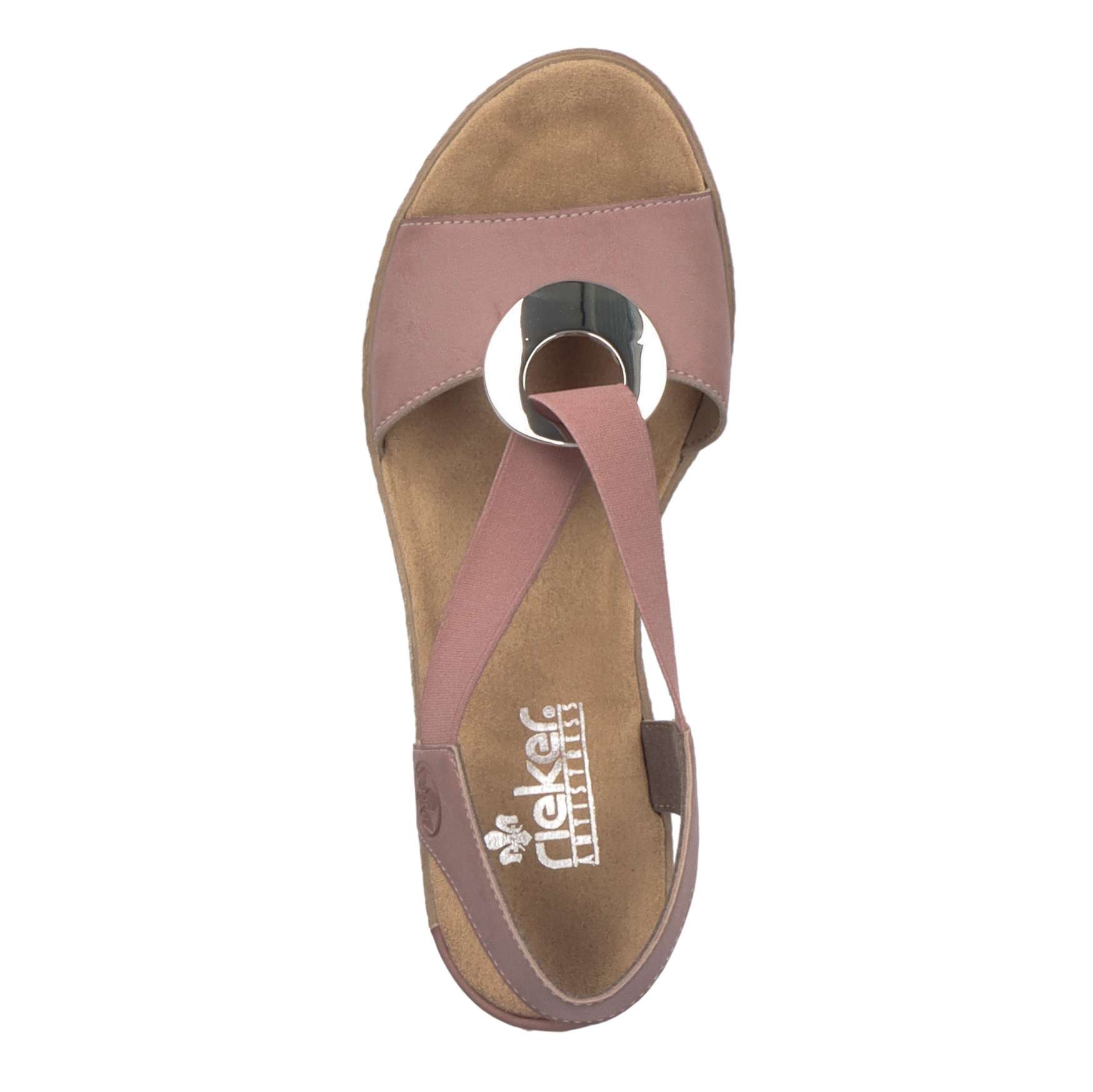 Hledáte ideální obuv na horké letní dny? Pak jste tady správně, s tímto modelem rozhodně nebudete litovat. Ozdobná kovová aplikace je spojena s pružnou gumou, která Vám zaručí snadné a rychlé obouvání. Měkká a pohodlná stélka Vám zajistí, že se budete cítit skvěle po celý den. Podešev na klínku vysoká cca 5,5 cm má technologii Antistress, díky niž se snadno přizpůsobí každé noze. Tyto dámské sandály od značky RIEKER si oblíbíte už na první pohled, jelikož s tímto modelem sladíte úplně cokoliv. Technologie: Antistress – podešev je díky této technologii lehká, flexibilní, absorbuje nárazy při došlapu a snadno se přizpůsobí každé noze.