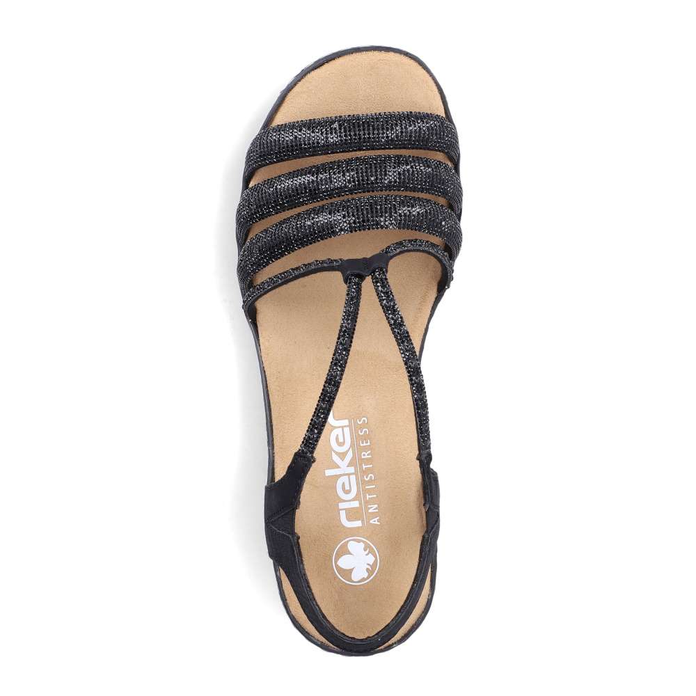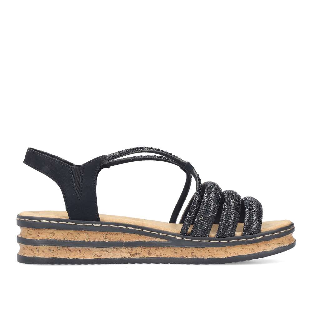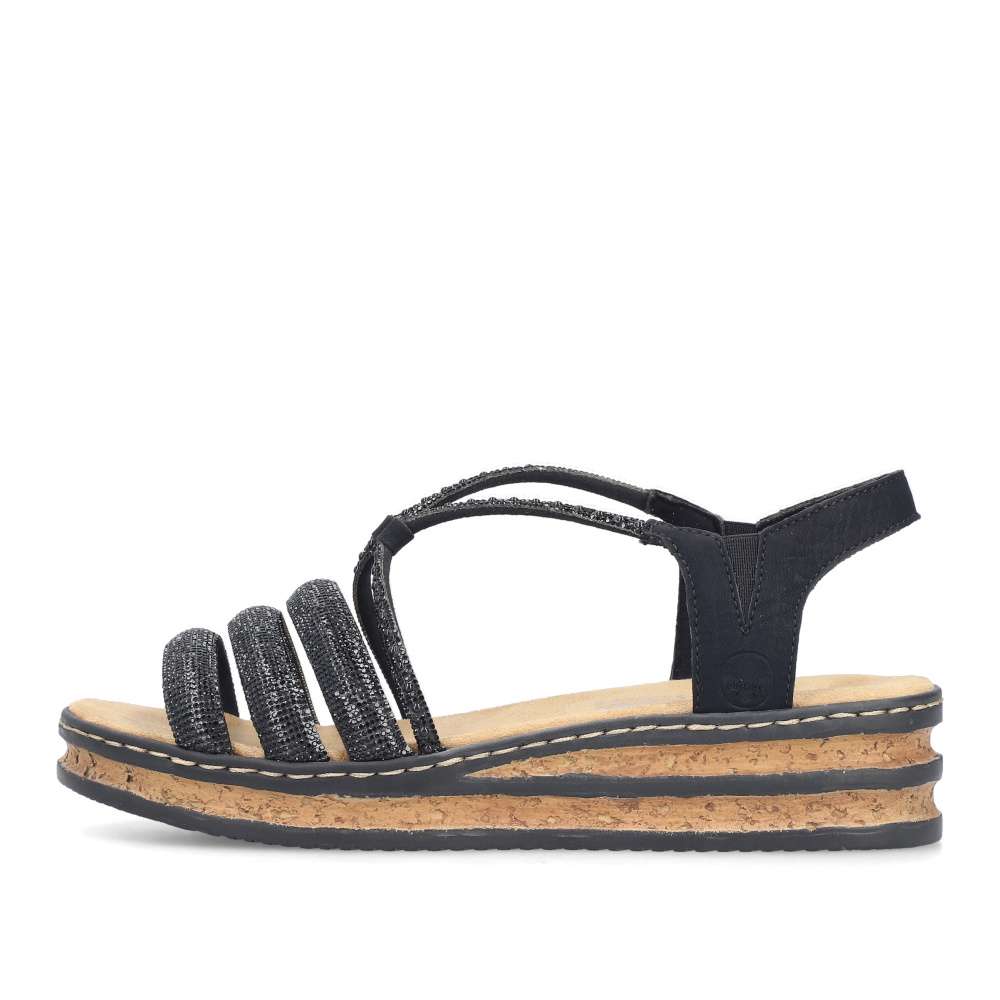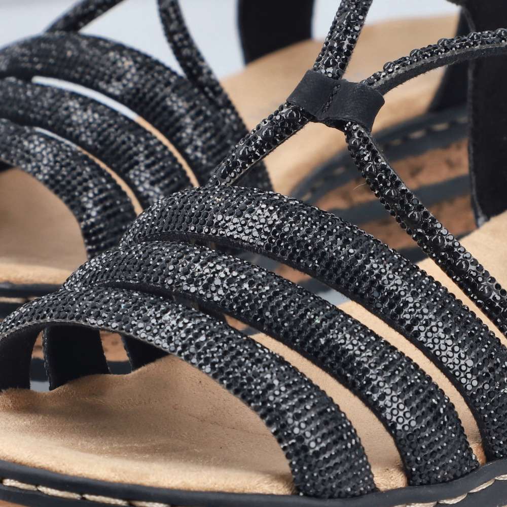Tyto sandály RIEKER jsou jako stvořené pro ženy, které chtějí každý svůj krok přežít s půvabem a elegancí. Černé pásky svršku poseté drobnými třpytivými kamínky vytvářejí okouzlující efekt, který podtrhuje ženský šarm. Pružné gumičky po stranách kotníku zajišťují snadné nazutí a dokonalé obepnutí nohy, zatímco měkká textilní stélka přináší pocit komfortu při každém kroku. Klínový podpatek ve stylovém provedení tlumí nárazy a poskytuje stabilitu, takže se budete cítit elegantně bez kompromisu v pohodlí. Tyto sandály RIEKER nejsou jen obuví – jsou projevem ženského šarmu a elegance, které vás budou doprovázet každý den.