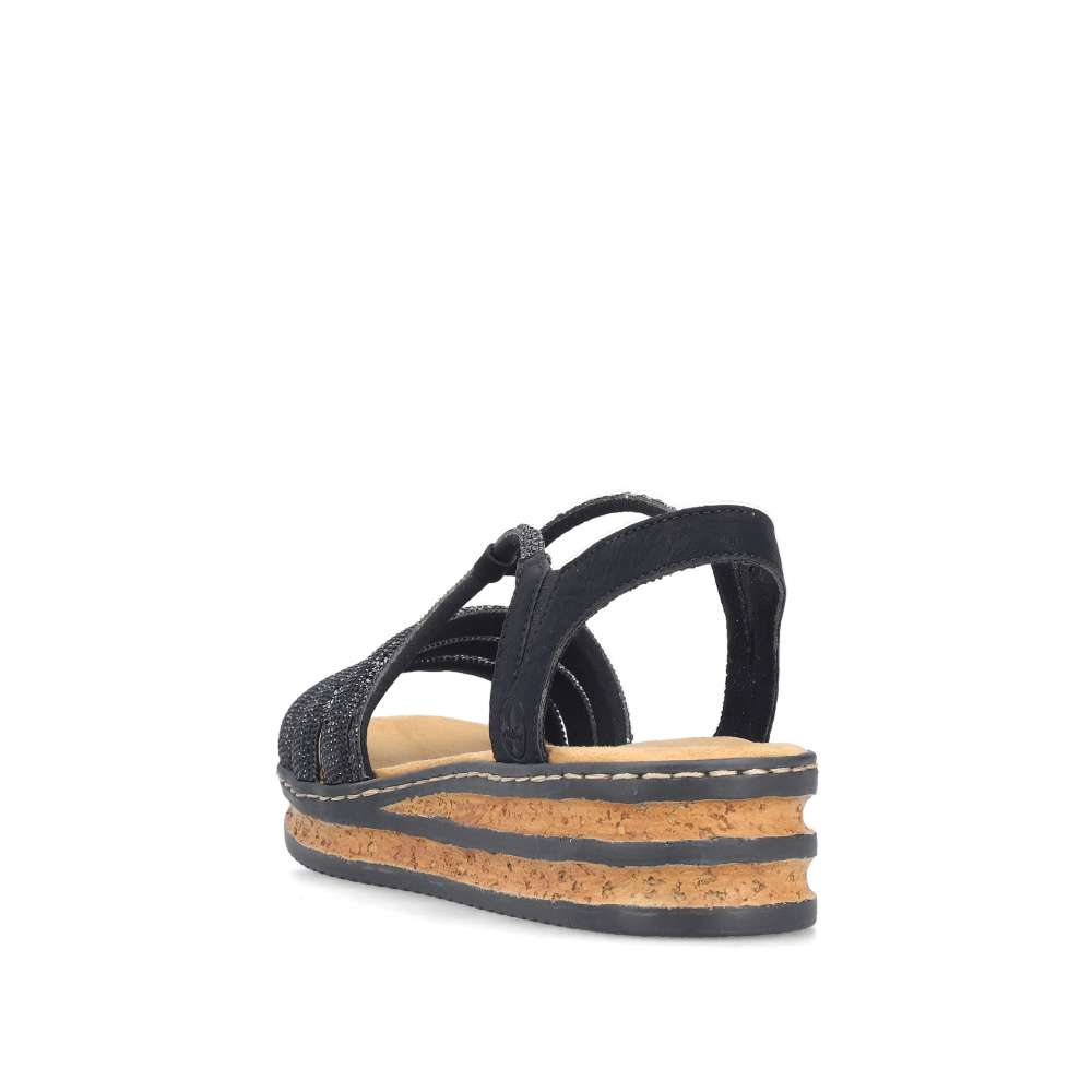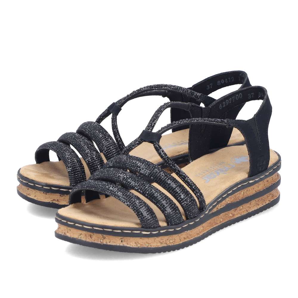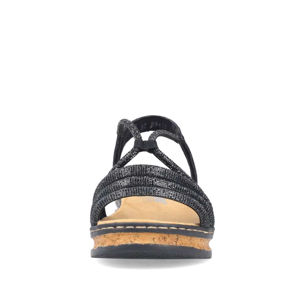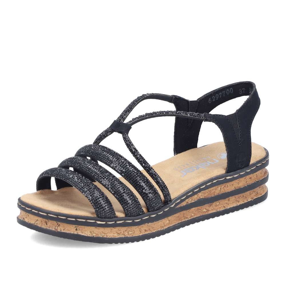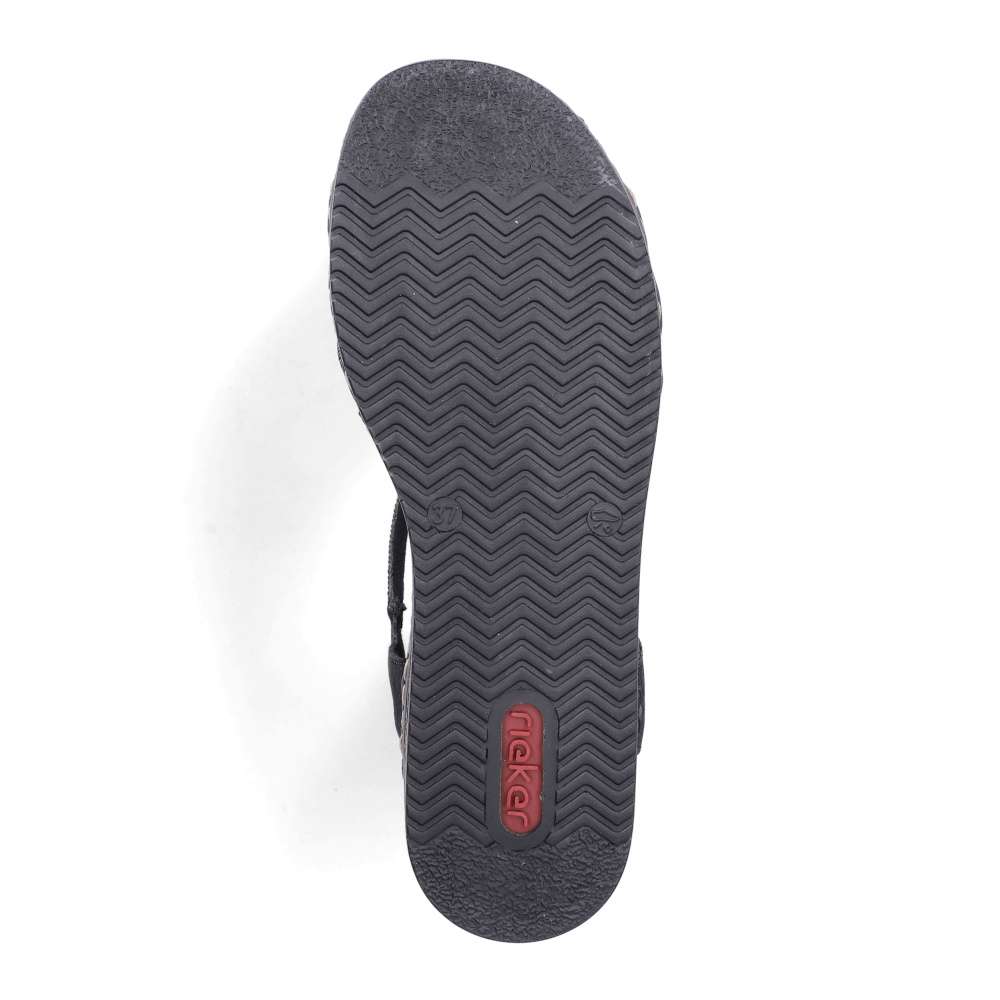 Tyto sandály RIEKER jsou jako stvořené pro ženy, které chtějí každý svůj krok přežít s půvabem a elegancí. Černé pásky svršku poseté drobnými třpytivými kamínky vytvářejí okouzlující efekt, který podtrhuje ženský šarm. Pružné gumičky po stranách kotníku zajišťují snadné nazutí a dokonalé obepnutí nohy, zatímco měkká textilní stélka přináší pocit komfortu při každém kroku. Klínový podpatek ve stylovém provedení tlumí nárazy a poskytuje stabilitu, takže se budete cítit elegantně bez kompromisu v pohodlí. Tyto sandály RIEKER nejsou jen obuví – jsou projevem ženského šarmu a elegance, které vás budou doprovázet každý den.