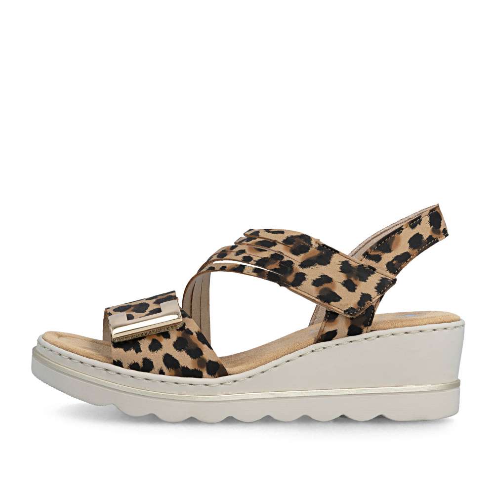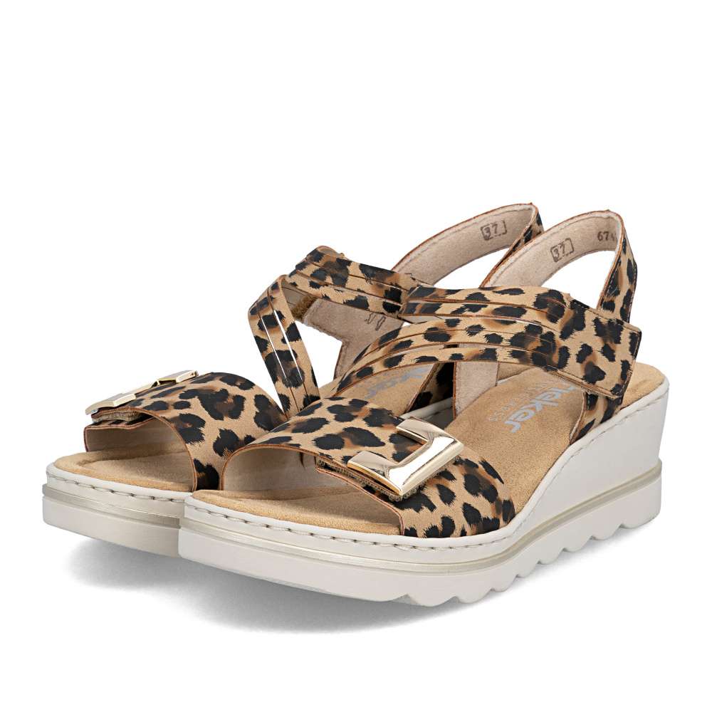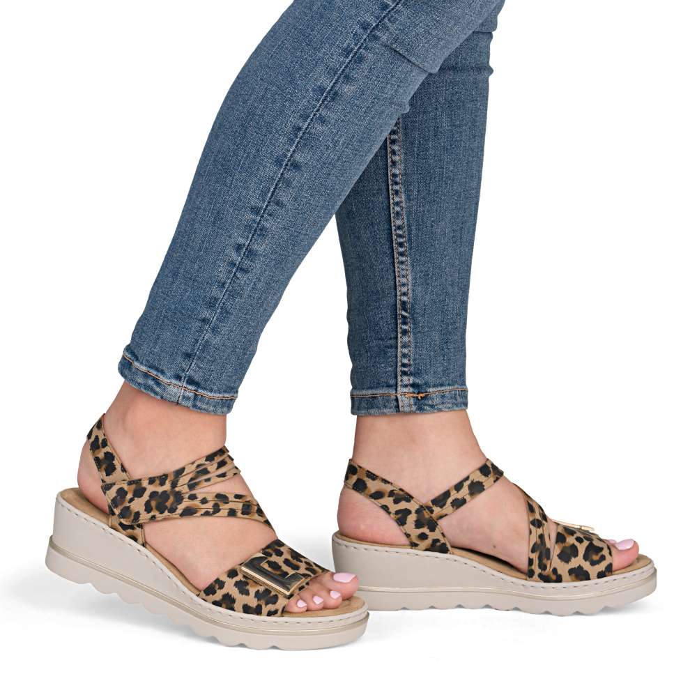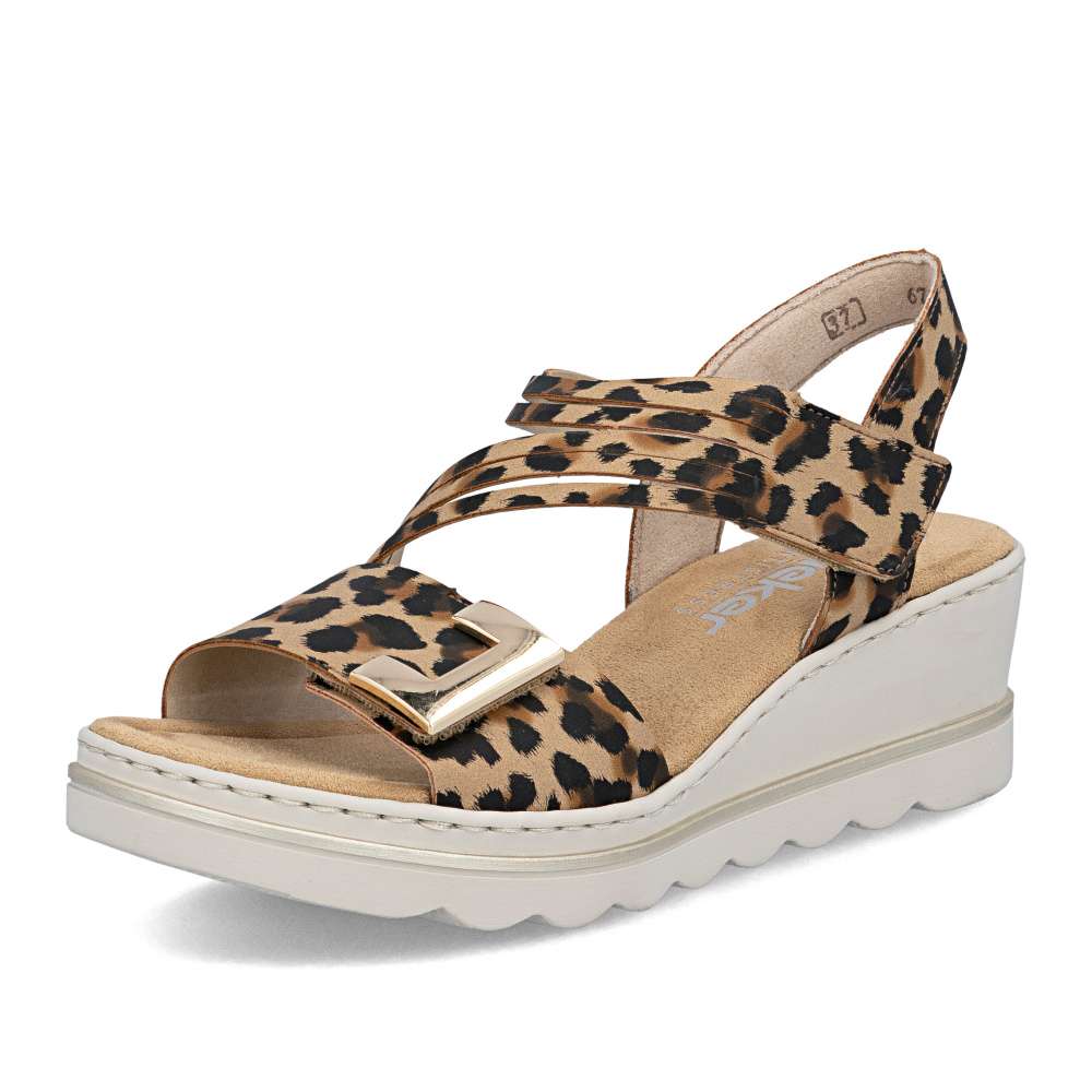 Módní výraz těchto sandálů RIEKER je jasně dána zvířecím motivem pásků svršku, jehož atraktivní skladba působí vizuálně atraktivně. Jejich vzhled krásně doplňuje výrazná dekorativní aplikace na předním pásku, která dodává modelu jemný módní akcent. Díky suchým zipům se sandály snadno obouvají a dokonale se přizpůsobí tvaru nohy, čímž poskytují pocit jistoty a pohodlí během celého dne. Příjemná textilní stélka se postará o měkký došlap, zatímco klínový podpatek jemně zvýrazní ženskou siluetu, dodá eleganci lemováním s odlesky a zároveň zachová komfort a stabilitu při chůzi. Tyto sandály RIEKER jsou ideálním společníkem pro letní dny, kdy toužíte po stylu a pohodlí v dokonalé harmonii.