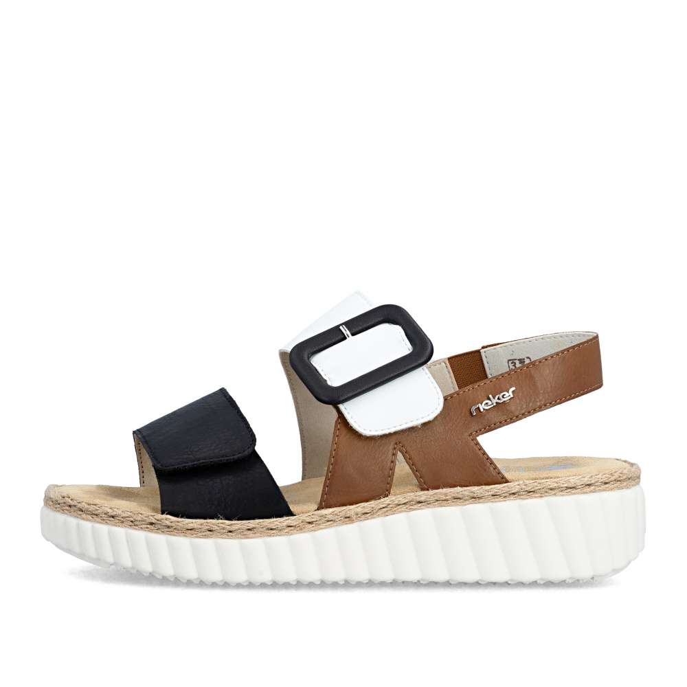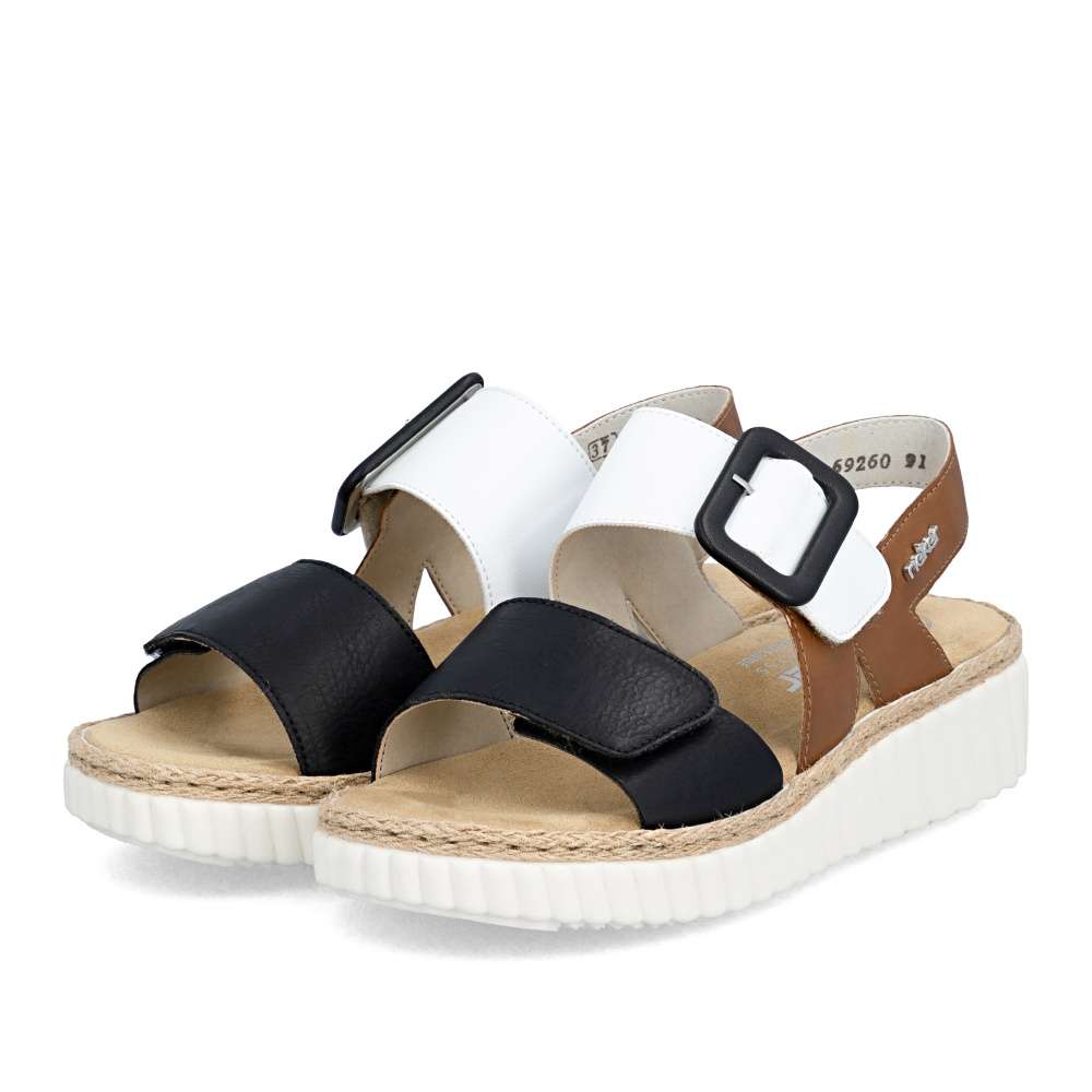 Detailní informace Tyto sandály RIEKER na klínovém podpatku jsou ideální pro každý den a každou příležitost. Zaujmou svojí barevnou kombinací kontrastních barev a výraznou sponou na nártovém pásku. Pro snadné nazutí a upravení individuálním potřebám jsou boty vybaveny páskem na patě a širokými pásky se suchým zipem přes nárt. Lehká podrážka tlumící nárazy a měkká stélka zajišťují příjemný pocit z nošení, navíc mají širší střih pro dostatečný prostor širšímu chodidlu. Toto jsou ty dokonalé boty pro letní dny.