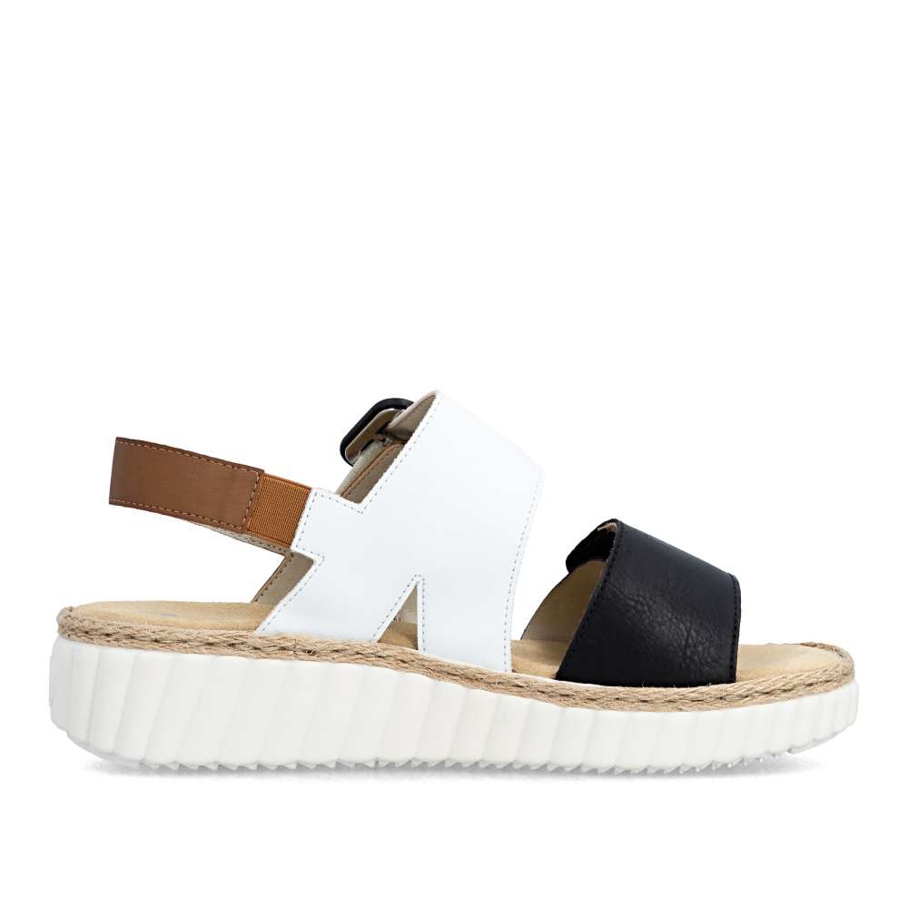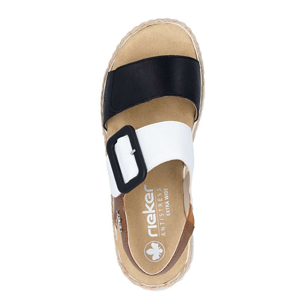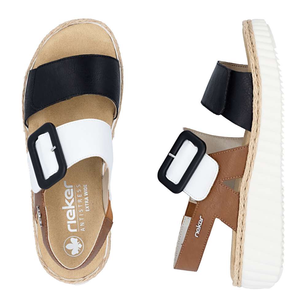 Tyto sandály RIEKER na klínovém podpatku jsou ideální pro každý den a každou příležitost. Zaujmou svojí barevnou kombinací kontrastních barev a výraznou sponou na nártovém pásku. Pro snadné nazutí a upravení individuálním potřebám jsou boty vybaveny páskem na patě a širokými pásky se suchým zipem přes nárt. Lehká podrážka tlumící nárazy a měkká stélka zajišťují příjemný pocit z nošení, navíc mají širší střih pro dostatečný prostor širšímu chodidlu. Toto jsou ty dokonalé boty pro letní dny. Technologie: Antistress – díky čtyřem antistresovým vlastnostem – lehkosti, pružnosti, prostornosti a vynikající absorpci nárazů – vám boty RIEKER nabídnou komfortnější chůzi. EXTRA WIDE – boty jsou širšího střihu, tvar boty je přizpůsoben chodidlu pro vytvoření dostatečného prostoru v oblasti přední části chodidla.