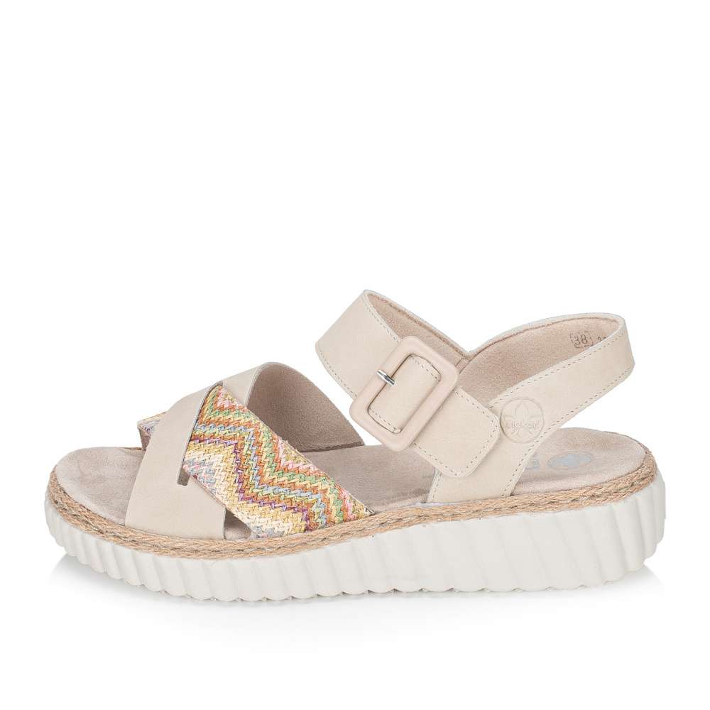 Dámské sandály RIEKER jsou stvořeny pro ženy, které chtějí spojit pohodlí s výrazným stylem. Béžový svršek je tvořen elegantně poskládanými pásky, které vytváří zajímavý a ženský design. Přední část navíc oživuje barevný vzorovaný proužek, který dodává sandálům svěžest a činí z nich nepřehlédnutelný módní doplněk letního outfitu. O komfort při každém kroku se postará měkká textilní stélka, která poskytuje chodidlu příjemnou oporu i během celodenního nošení. Pásek přes nárt je doplněn sponou a praktickým suchým zipem, díky čemuž si sandály jednoduše přizpůsobíte přesně podle tvaru vaší nohy. Vyšší podešev nejen zvýrazňuje moderní vzhled obuvi, ale zároveň tlumí nárazy a zvyšuje stabilitu při chůzi, takže se budete cítit pohodlně i během aktivního dne. Tyto sandály jsou ideální volbou pro ženy, které chtějí vypadat stylově, cítit se komfortně a užívat si každý krok s lehkostí - ať už ve městě, na dovolené nebo během letních procházek.
