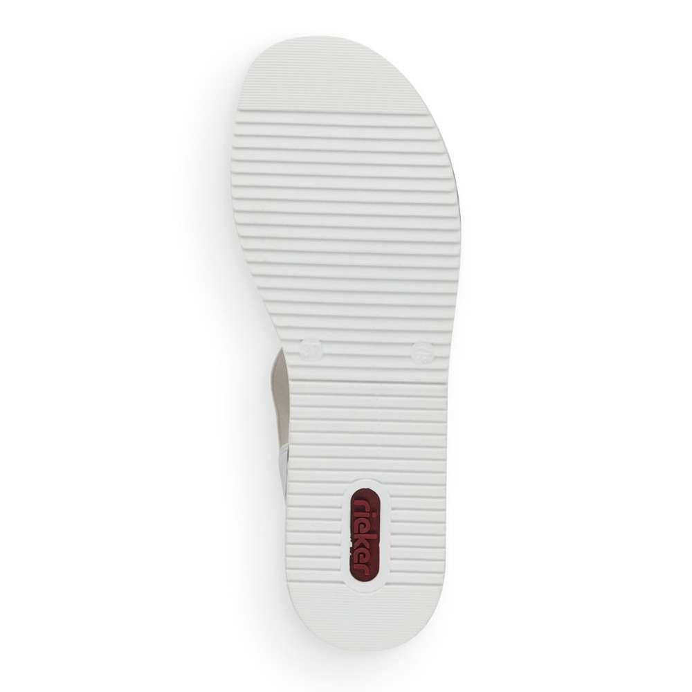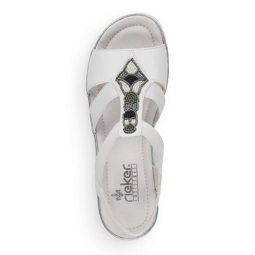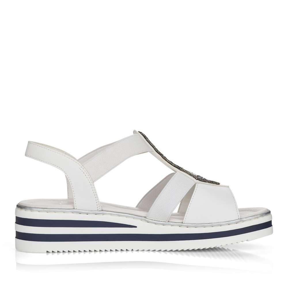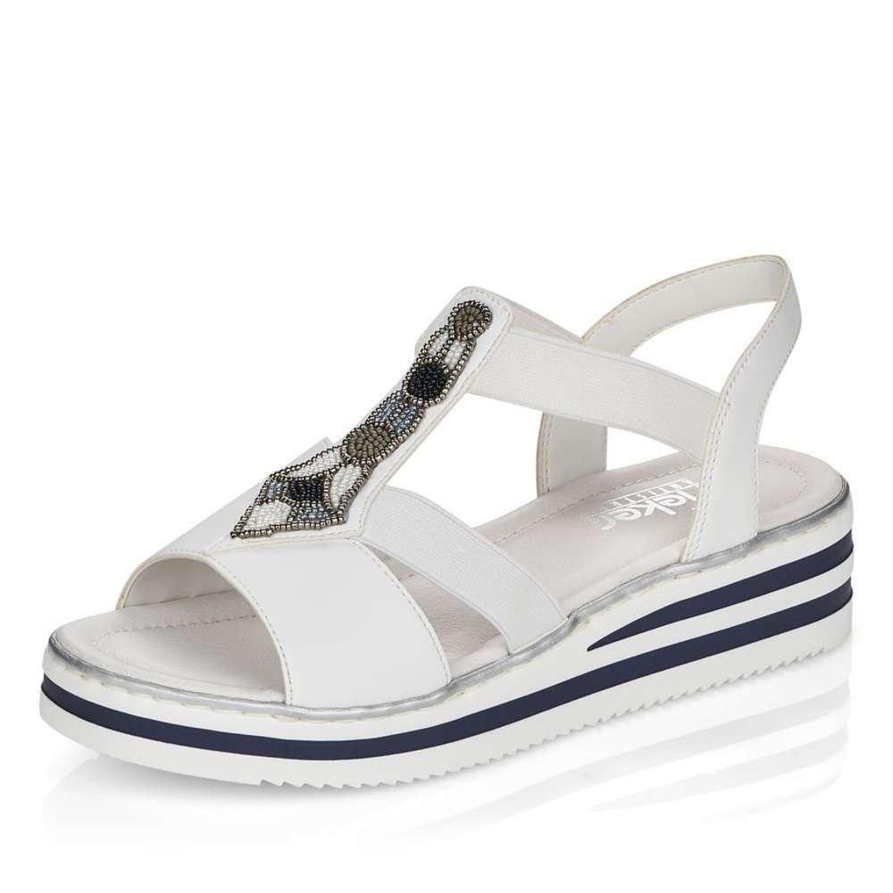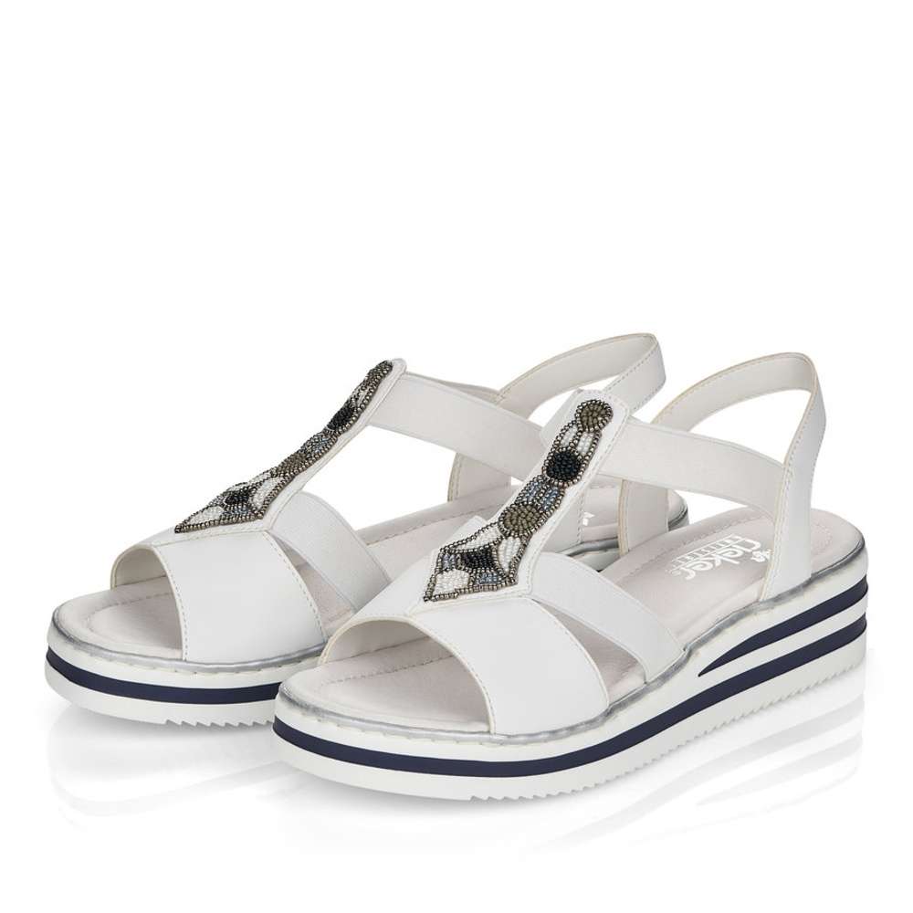 Exkluzivní vyvýšený model od značky Rieker s páskami a zdobným spojovacím prvkem v podobě malých kamínků. Obuv má po stranách pružné gumičky, díky nimž bude obutí obzvlášť jednoduché.