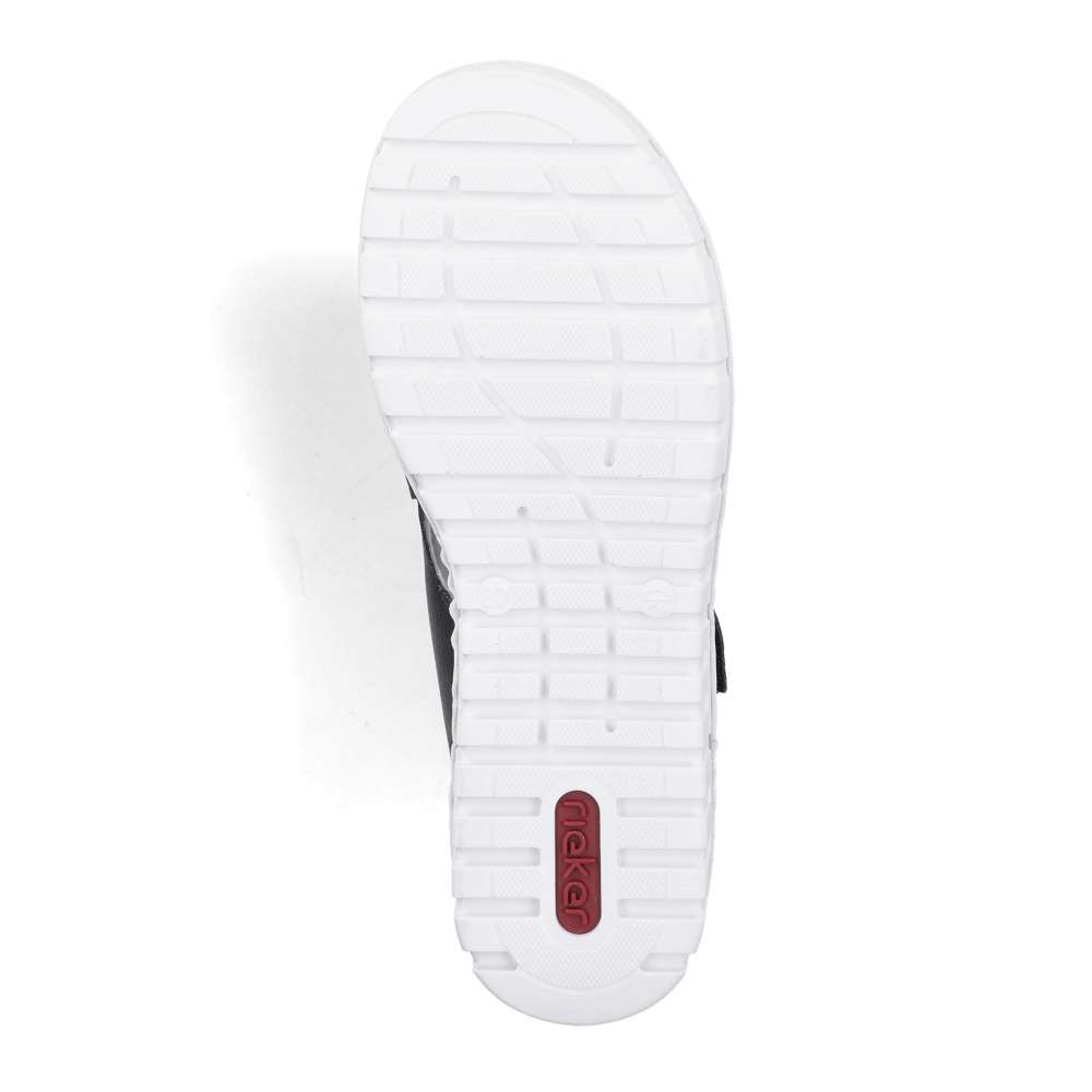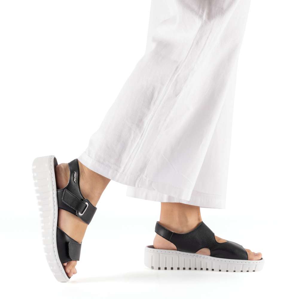 Kožené sandály RIEKER v černé barvě představují dokonalé spojení nadčasového designu a špičkového komfortu. Třpytivé stříbrné logo značky jemně podtrhuje exkluzivní charakter tohoto modelu a individuální pohodlí zajišťují nastavitelné pásky se suchým zipem, díky kterým se sandály dokonale přizpůsobí chodidlu. Měkká textilní stélka hýčká nohu při každém kroku a spolu s vyšší, stabilní podešví s technologií tlumení nárazů poskytuje výjimečný komfort při nošení. Tyto sandály RIEKER jsou ideální volbou pro letní dny strávené ve městě, na procházkách i při pracovních povinnostech. Technologie: Antistress – díky čtyřem antistresovým vlastnostem – lehkosti, pružnosti, prostornosti a vynikající absorpci nárazů – vám boty RIEKER nabídnou komfortnější chůzi. ŠÍŘKA H – širší střih bot, který vytvoří dostatečný prostor Vašemu chodidlu a zajistí dokonalý komfort při nošení.