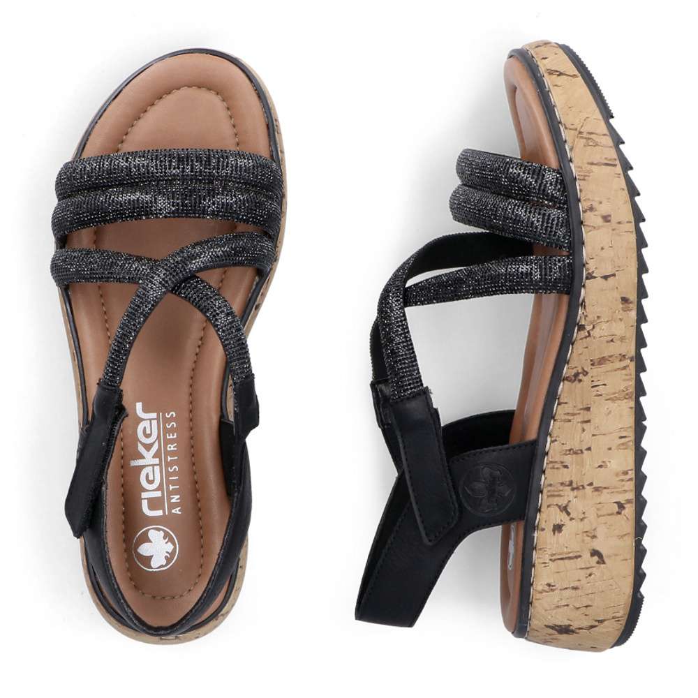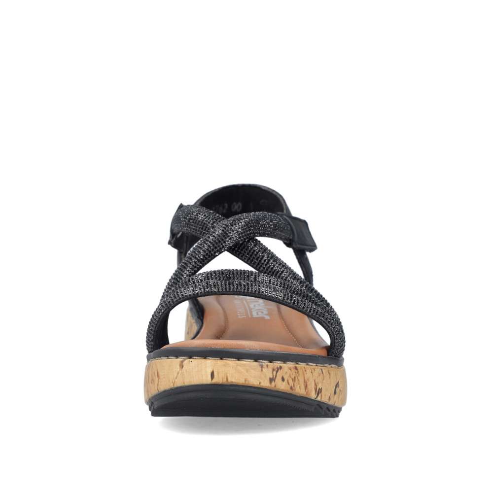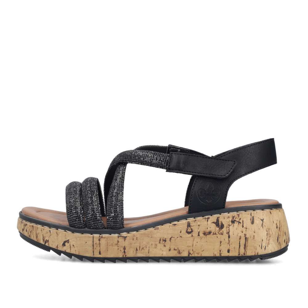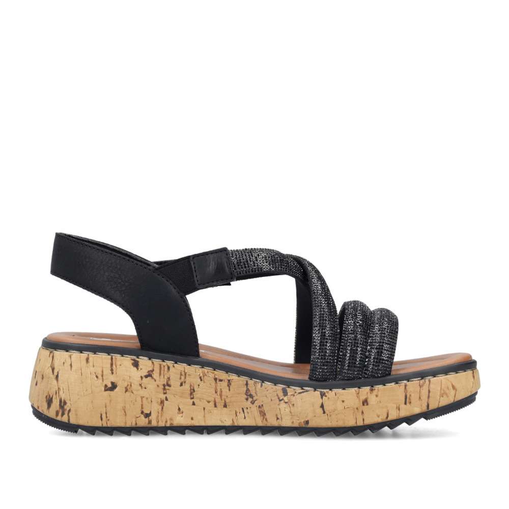 Tyto dámské sandály značky RIEKER okouzlí na první pohled půvabnými odlesky kamínků, které jsou vkusně rozmístěny na efektně poskládaných páskech černého svršku. Jejich elegantní design působí žensky a dodá každému outfitu nádech výjimečnosti. Pásek kolem kotníku je prakticky řešen pomocí suchého zipu a doplněn pružnou gumičkou z vnitřní strany, díky čemuž se sandály snadno obouvají a dokonale přizpůsobí tvaru nohy. Měkká stélka vás bude hýčkat příjemným došlapem i během celého dne, zatímco klínový podpatek v moderním provedení jemně tlumí nárazy a zároveň dodává stabilitu i ženskou eleganci. Tyto sandály nejsou jen obuví – jsou šperkem pro vaše nohy, který rozzáří každý krok a dodá vám sebevědomí, styl a lehkost během celých letních dnů.