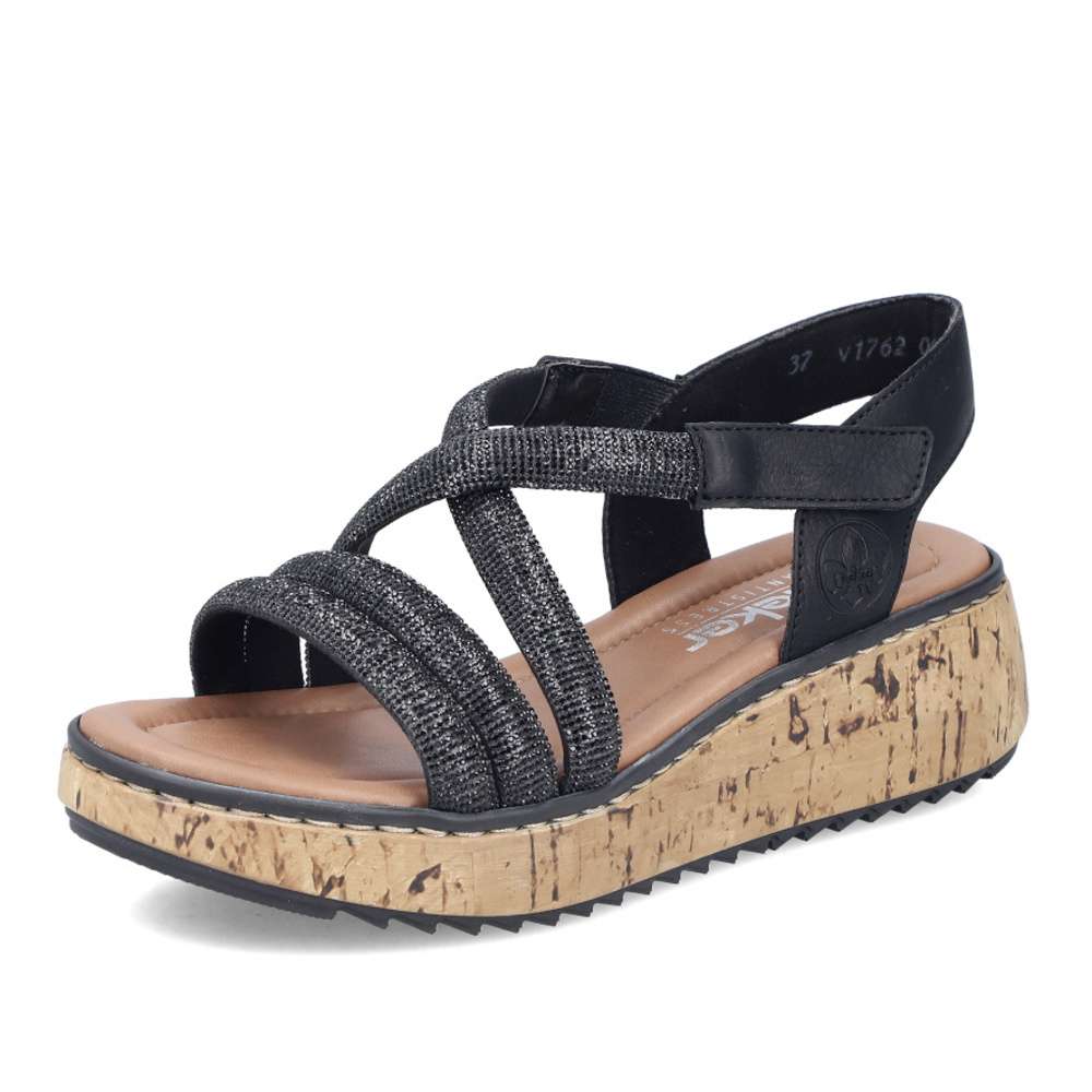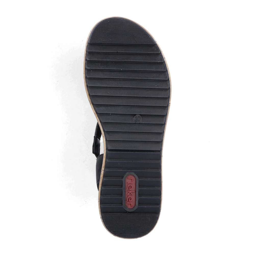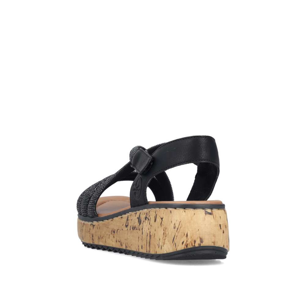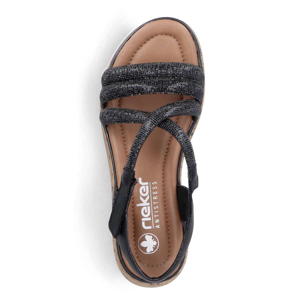 Tyto dámské sandály značky RIEKER okouzlí na první pohled půvabnými odlesky kamínků, které jsou vkusně rozmístěny na efektně poskládaných páskech černého svršku. Jejich elegantní design působí žensky a dodá každému outfitu nádech výjimečnosti. Pásek kolem kotníku je prakticky řešen pomocí suchého zipu a doplněn pružnou gumičkou z vnitřní strany, díky čemuž se sandály snadno obouvají a dokonale přizpůsobí tvaru nohy. Měkká stélka vás bude hýčkat příjemným došlapem i během celého dne, zatímco klínový podpatek v moderním provedení jemně tlumí nárazy a zároveň dodává stabilitu i ženskou eleganci. Tyto sandály nejsou jen obuví – jsou šperkem pro vaše nohy, který rozzáří každý krok a dodá vám sebevědomí, styl a lehkost během celých letních dnů.
