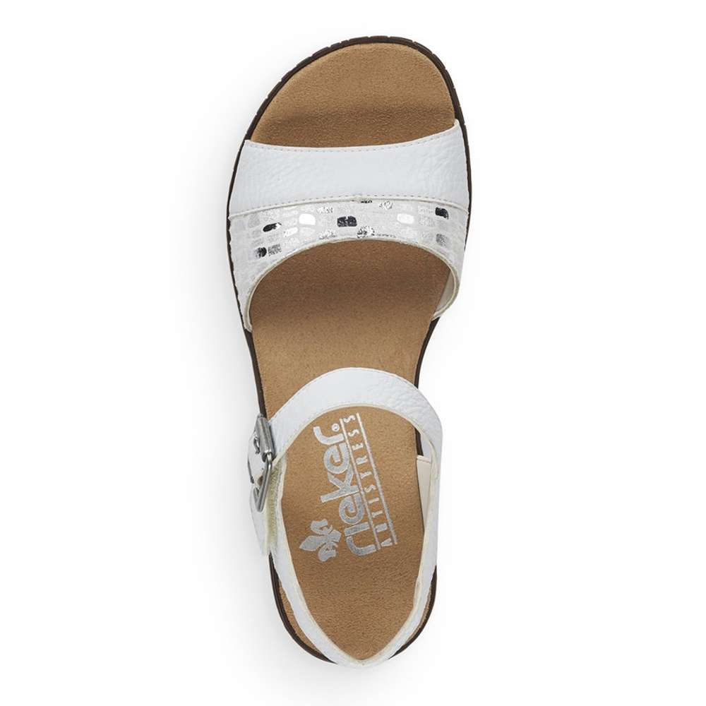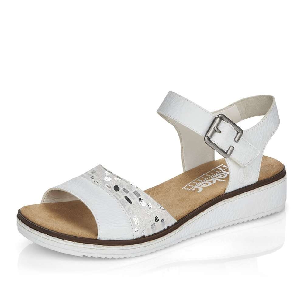 Dámské sandály od značky Rieker Vás nadchnou bílými tóny a lesklým vzorem ve přední části. Obuv je vybavena kotníkovým páskem s ozdobnou přezkou, zapínáním na suchý zip si je jednoduše nastavíte velikost přesně podle Vašich představ.