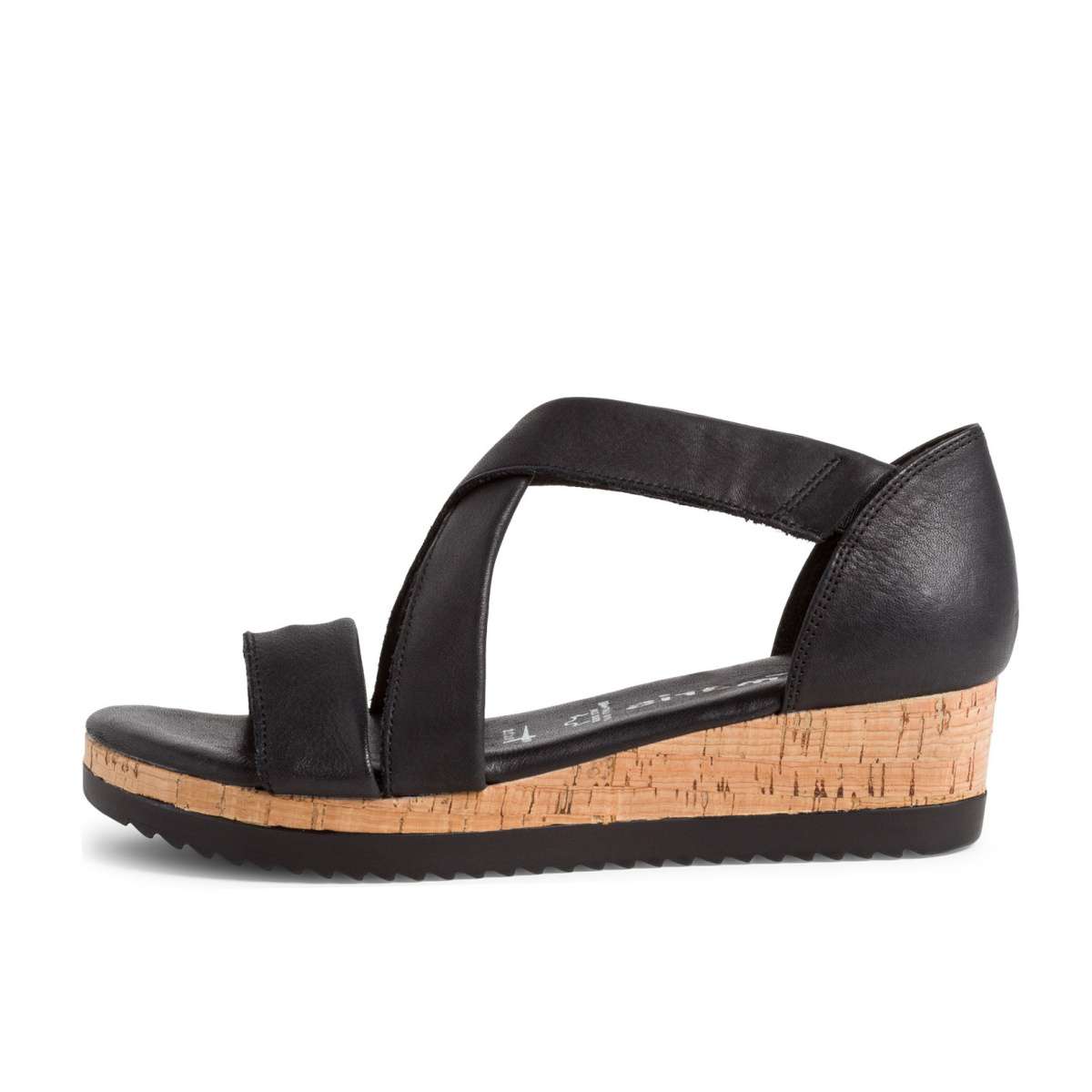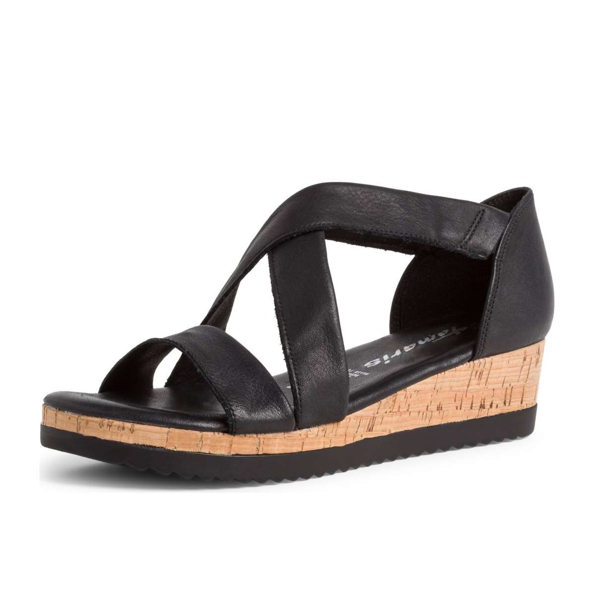 Dámské sandály s plnou patou, šité z pravé kůže značky TAMARIS. Jsou zdobené křížením předních pásků. Pásky přes nárt mají na obou stranách vsazené pružné gumičky pro snadné obutí. Tento model unosíte na procházku městem nebo do práce.