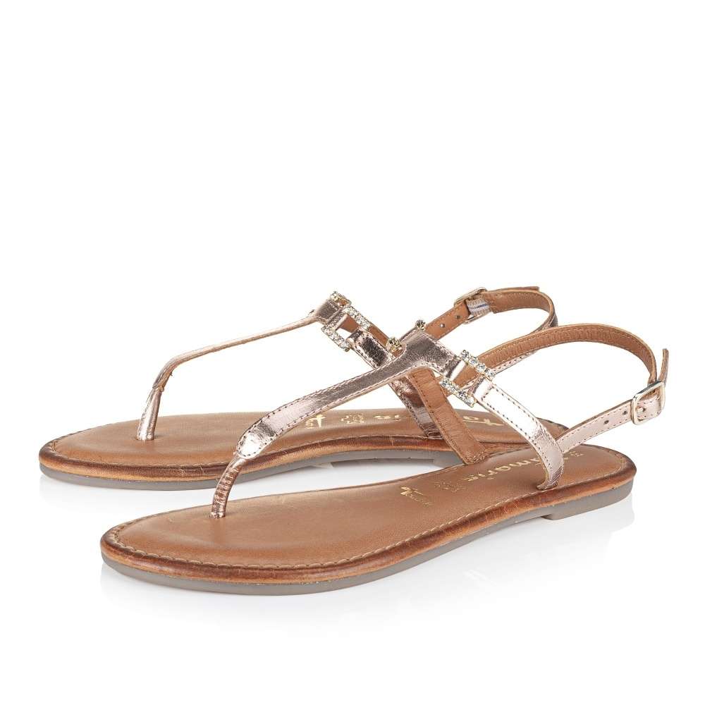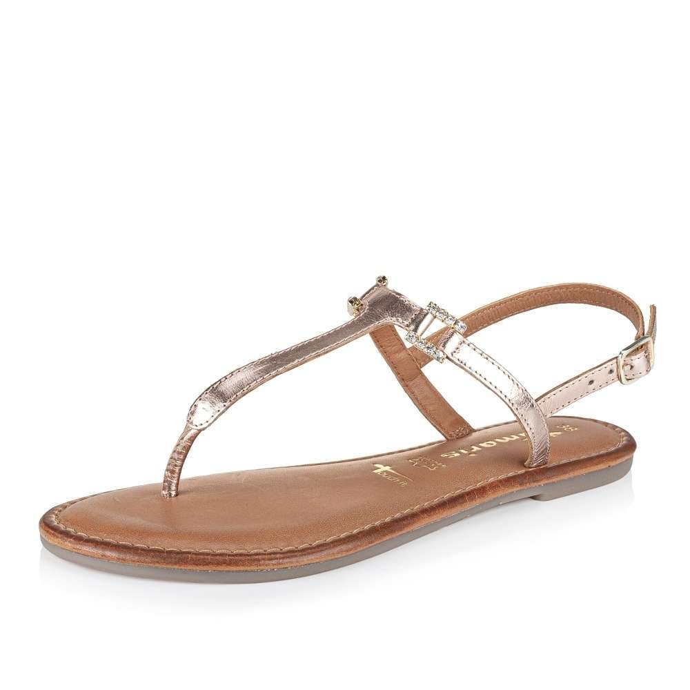 Detailní informace Kožené dámské sandálky značky Tamaris v žabkovém stylu jsou skvělá volba pro letní dny. Obuv Vám bude dokonale sedět díky pásku kolem paty, který je ozdoben funkční kovovou přezkou. Díky pevné podešvi a technologii Touch-it se budete cítit velmi příjemně a pohodlně během celého dne. Pásky na nártu jsou kromě jemného prošívání zdobeny třpytivými spojovacími prvky, které podtrhují krásu boty. S letními šaty vznikne nádherný outfit.
