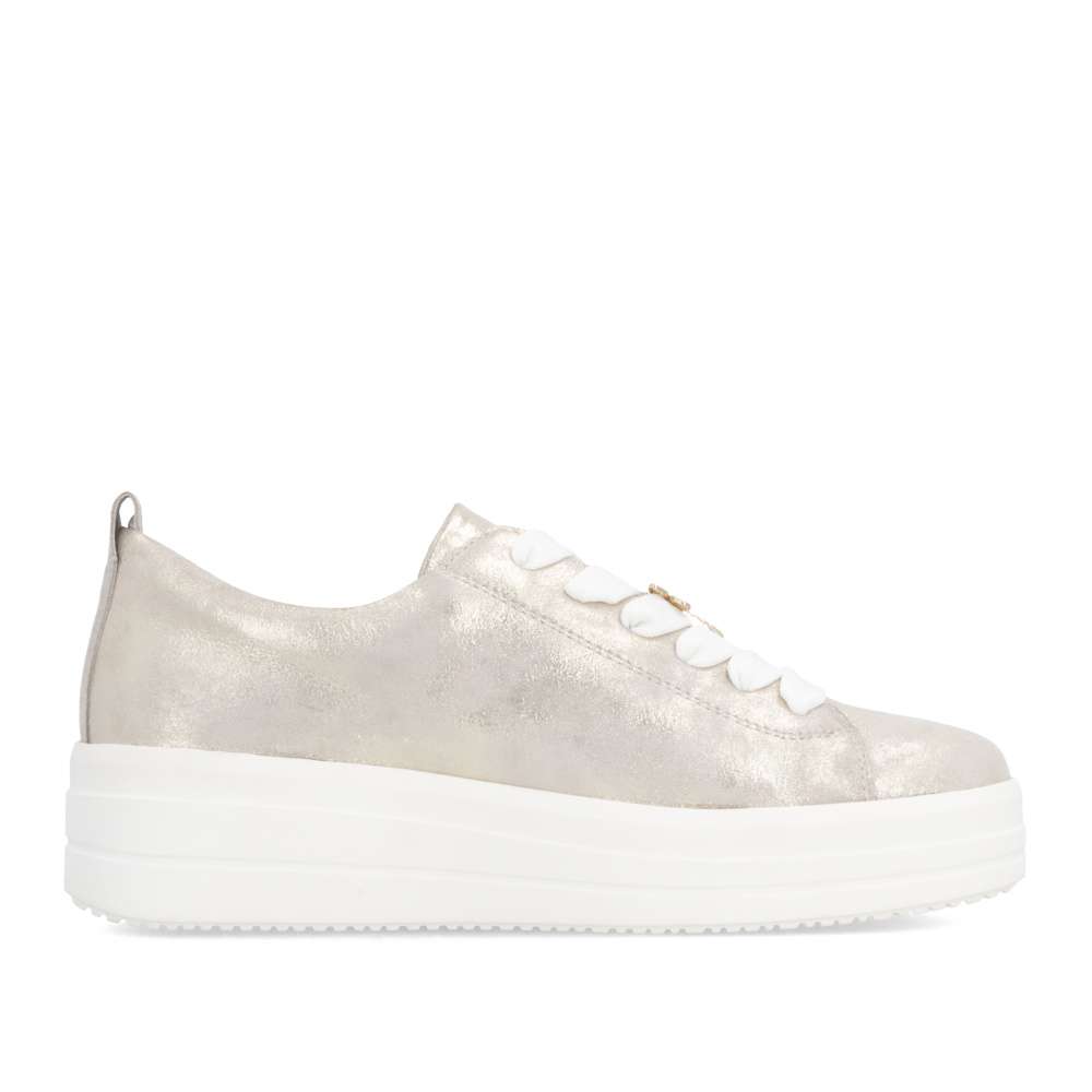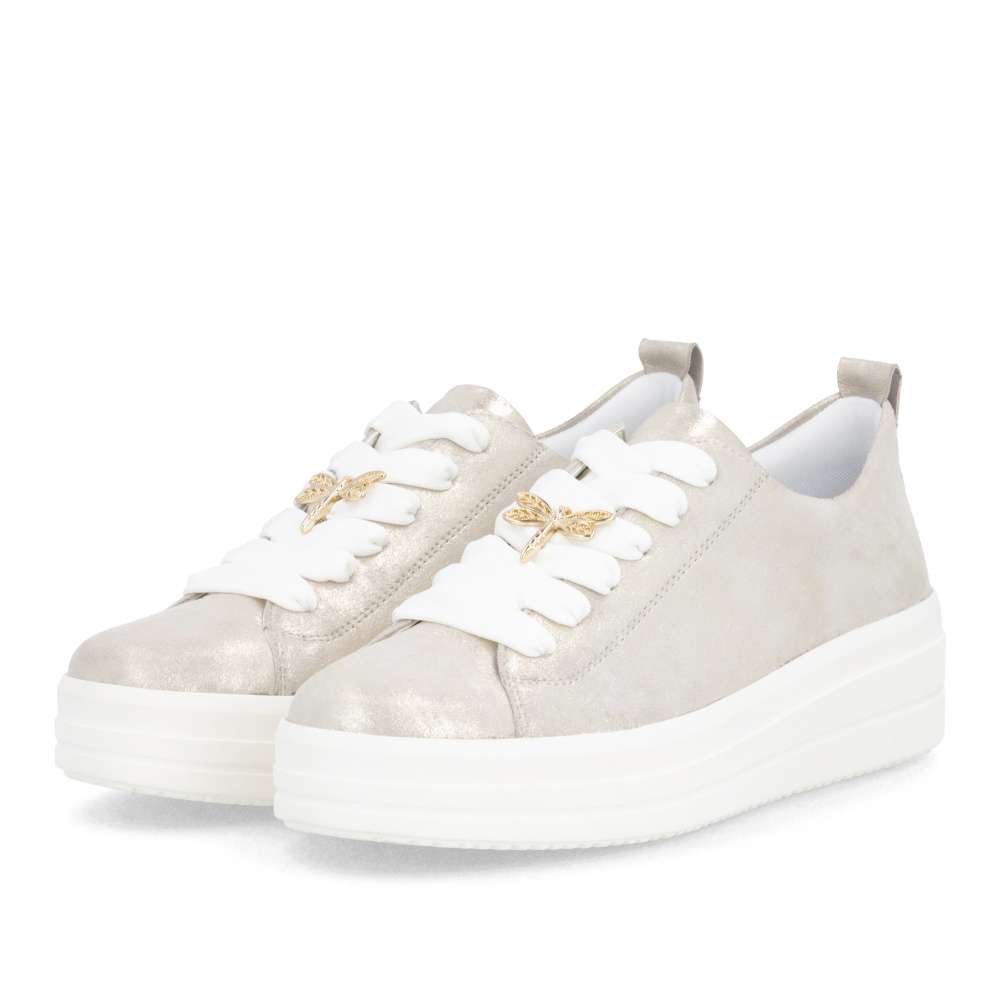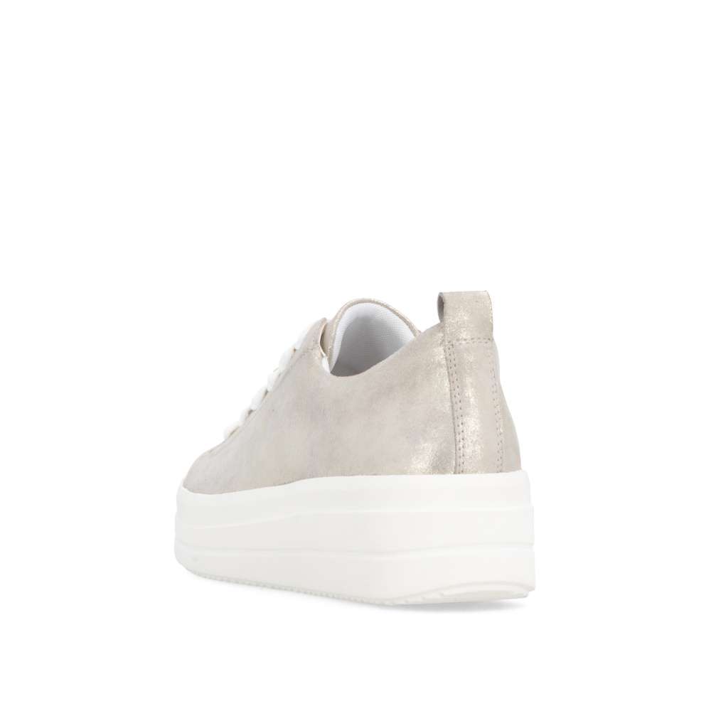 Obuv REMONTE představuje prémiovou řadu značky RIEKER, která se vyznačuje vysokou kvalitou použitých materiálů a precizním zpracováním. Metalický lesk koženého materiálu okamžitě upoutá pozornost a vytváří efekt stylových, zářivých tenisek vhodných pro každodenní nošení. Zajímavým designovým prvkem je efektní aplikace zlaté barvy na šňůrkách v zářivě bílém provedení, která dodává teniskám jemný luxusní akcent. Praktické šněrování umožňuje přesné přizpůsobení tvaru chodidla, zatímco měkká a vyjímatelná stélka zajistí komfort během celého dne, zároveň umožňuje snadnou údržbu nebo výměnu dle individuálních potřeb. Vyšší podešev doplňuje moderní vzhled svým propracovaným designem, ale také zajišťuje stabilitu a jistotu kroku na různých površích. Tyto tenisky jsou ideální pro každodenní nošení, ať už do práce, do města, na procházky, volnočasové aktivity nebo cestování. Díky kombinaci moderního designu, kvalitních materiálů a funkčních detailů se v nich budete cítit pohodlně, stylově a sebevědomě. Technologie: Remonte Soft – unikátní stélka vyrobená z prodyšného materiálu, která svým tvarem a materiálem zajistí pocit pohodlí při celodenním nošení. Lite'n Soft - maximální komfort při nošení vytváří kombinace lehké podešve, velmi příjemných materiálů a komfortní stélky. Tato bota je vybavena vyjímatelnou stélkou.