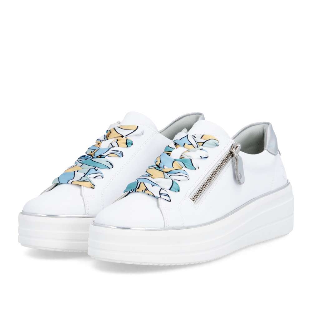 Obuv REMONTE představuje prémiovou řadu značky RIEKER, která se vyznačuje vysokou kvalitou použitých materiálů a precizním zpracováním. Tyto kožené tenisky jsou dokonalou kombinací nadčasové klasiky a moderního stylu značky RIEKER. Bílý svršek bot působí svěže a moderně, zatímco lesklé detaily přidávají obuvi luxusní nádech. Styl šněrování těchto tenisek si můžete libovolně přizpůsobit dle svých preferencí, což umožňuje vytvořit unikátní vzhled přesně dle vašeho vkusu. Šňůrky můžete jednoduše vyměnit za dekorativní stuhu, která dodá botám osobitý a jedinečný charakter. Kombinace zipu a šněrování navíc umožňuje přesné přizpůsobení tvaru boty a snadné nazutí, čímž se zajistí optimální pohodlí při každém kroku. Vyjímatelná stélka je měkká, tvarovaná a přizpůsobí se chodidlu, čímž poskytuje maximální pohodlí i při celodenním nošení. Vyšší podešev doplňuje moderní vzhled svým propracovaným designem, ale také zajišťuje stabilitu a jistotu kroku na různých površích. Tyto tenisky jsou ideální pro každodenní nošení, ať už do práce, do města, na procházky, volnočasové aktivity nebo cestování. Díky kombinaci moderního designu, kvalitních materiálů a funkčních detailů se v nich budete cítit pohodlně, stylově a sebevědomě. Technologie: Remonte Soft – unikátní stélka vyrobená z prodyšného materiálu, která svým tvarem a materiálem zajistí pocit pohodlí při celodenním nošení. Lite'n Soft - maximální komfort při nošení vytváří kombinace lehké podešve, velmi příjemných materiálů a komfortní stélky. Tato bota je vybavena vyjímatelnou stélkou.