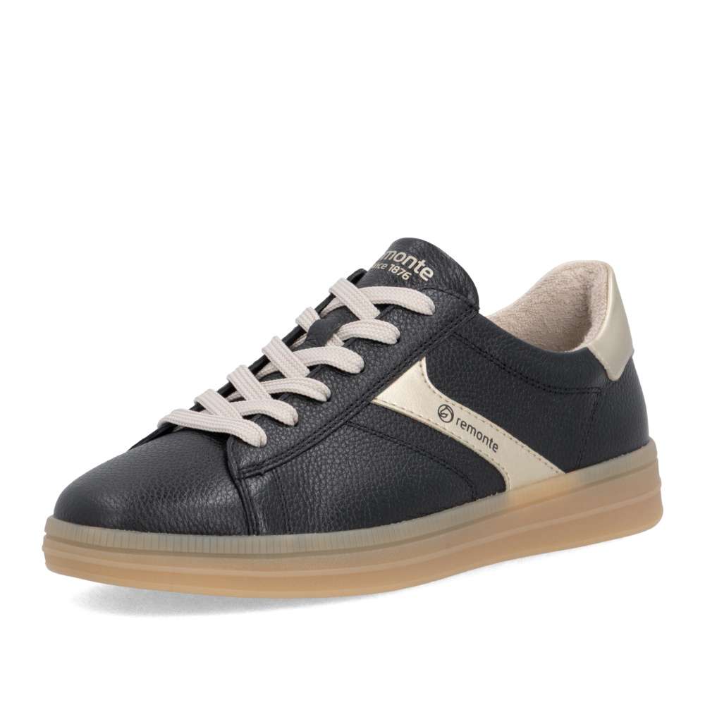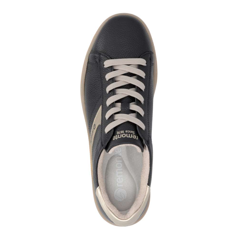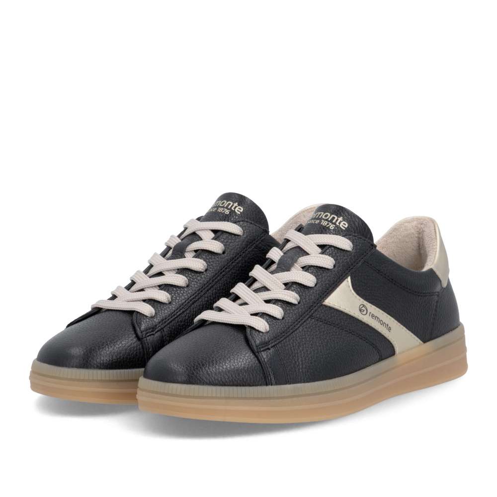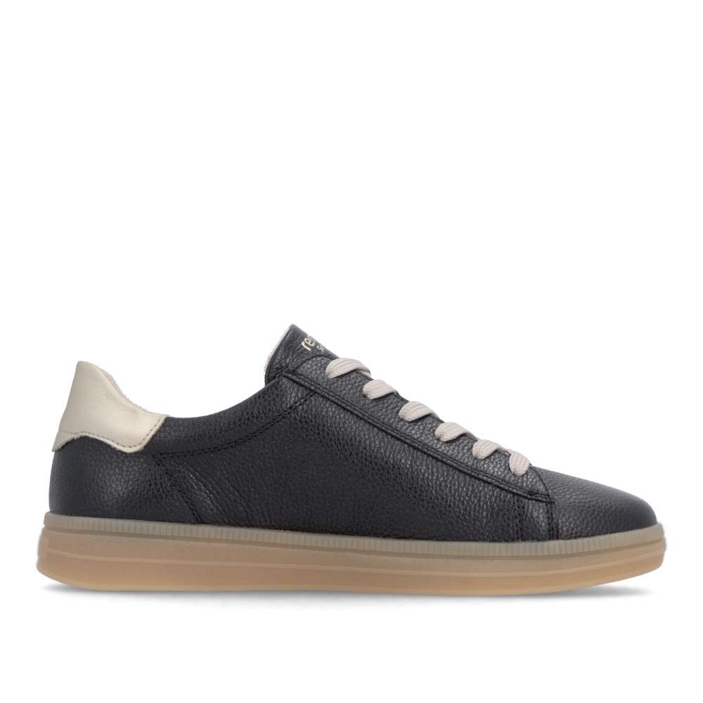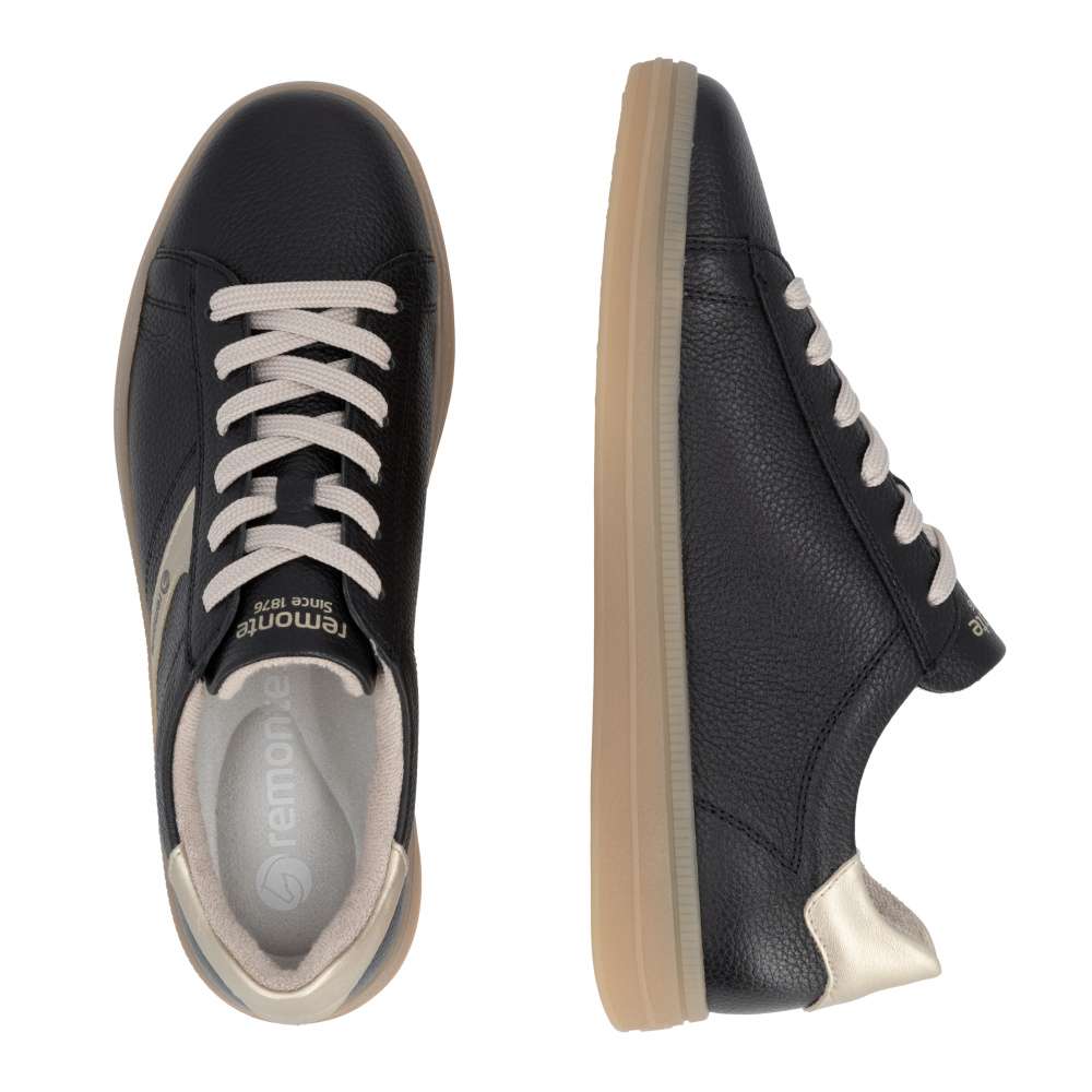 Obuv REMONTE představuje prémiovou řadu značky RIEKER, která se vyznačuje vysokou kvalitou použitých materiálů a precizním zpracováním. Kožený svršek v nadčasové černé barvě působí univerzálně a dekorují jej metalické aplikace dodávající obuvi atraktivní akcent, zatímco ikonické logo značky zvýrazňuje jejich prémiový charakter. Výrazné, ale vkusné detaily dělají z tohoto modelu univerzální kousek, který jednoduše zapadne do každého šatníku. Klasické šněrování zajišťuje pohodlné nazouvání a umožňuje přesné přizpůsobení tvaru chodidla, díky čemuž poskytují tenisky stabilitu a přirozený pohyb během chůze. Měkká, vyjímatelná stélka přináší vysoký komfort a je navržena tak, aby podporovala chodidlo i během dlouhých dnů, a její jednoduchá vyjímatelnost umožňuje snadné čištění či výměnu. Podešev je stabilní, odolná a zároveň pružná, což zajišťuje vyváženou oporu a pohodlí při každém kroku. Tyto tenisky jsou výbornou volbou pro ženy, které hledají kombinaci moderního vzhledu, kvalitního provedení a maximálního pohodlí. Svým univerzálním designem doplní každý outfit – od volnočasového až po městský – a stanou se oblíbeným společníkem při každodenním nošení. Technologie: Remonte Soft – unikátní stélka vyrobená z prodyšného materiálu, která svým tvarem a materiálem zajistí pocit pohodlí při celodenním nošení. Tato obuv je vybavena vyjímatelnou stélkou.