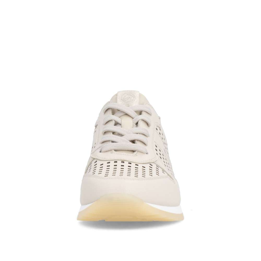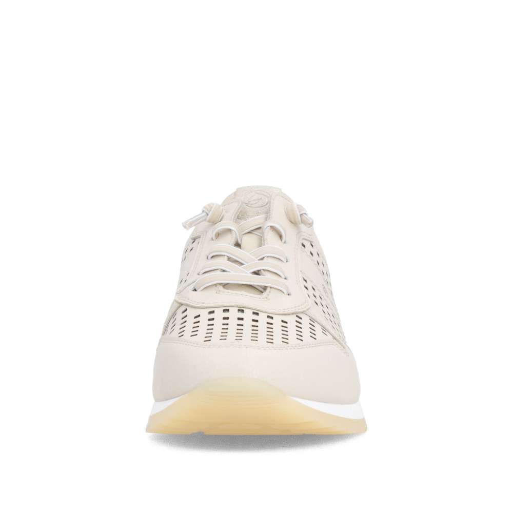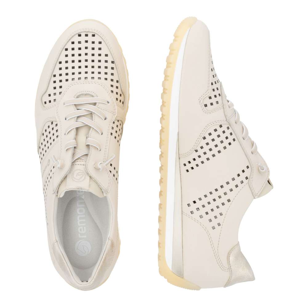 Obuv REMONTE představuje prémiovou řadu značky RIEKER, která se vyznačuje vysokou kvalitou použitých materiálů a precizním zpracováním. Tyto dámské tenisky představují dokonalé spojení moderní estetiky, praktických řešení a celodenního pohodlí, díky čemuž se rychle stanou vaším oblíbeným kouskem v šatníku. Na první pohled zaujmou perforovaným vzorem béžového koženého svršku, který zajistí odvětrávání během teplých dnů, zatímco vkusná loga značky a barevně kontrastní aplikace dodávají botám stylový vzhled. Mimořádně praktické je dvojité řešení šněrování – podle preference si můžete zvolit pružnou gumičku pro rychlé a pohodlné nazutí bez zavazování nebo klasické šňůrky, které umožňují přesné přizpůsobení tvaru nohy. O dokonalý komfort se stará měkká, tvarovaná a vyjímatelná stélka, která poskytuje optimální oporu noze. Širší střih těchto bot přináší maximální pohodlí i ženám se širším chodidlem, jelikož nabízí více prostoru. Propracovaný design podešve dokonale doplňuje celkový vzhled tenisek a navíc svojí flexibilitou doplňuje pohodlí tím, že podporuje přirozený pohyb chodidla. Ať už hledáte pohodlnou obuv do práce, pro volný čas nebo jako stylový doplněk k vašemu každodennímu outfitu, tyto tenisky nabízí komfort a módní nadčasovost v jednom.