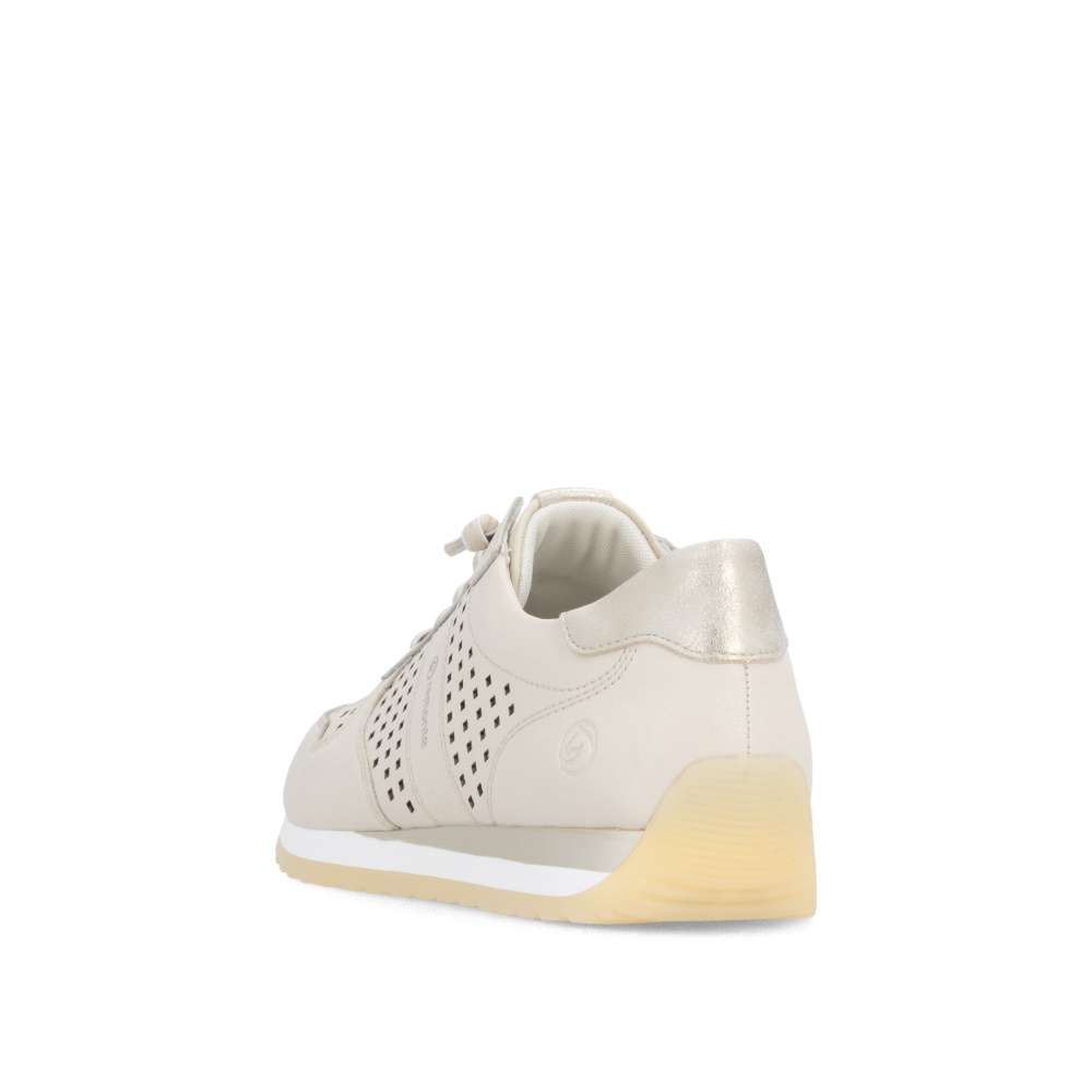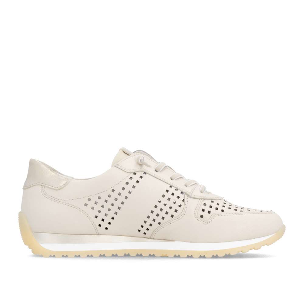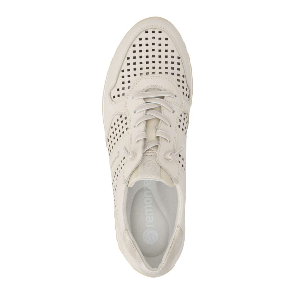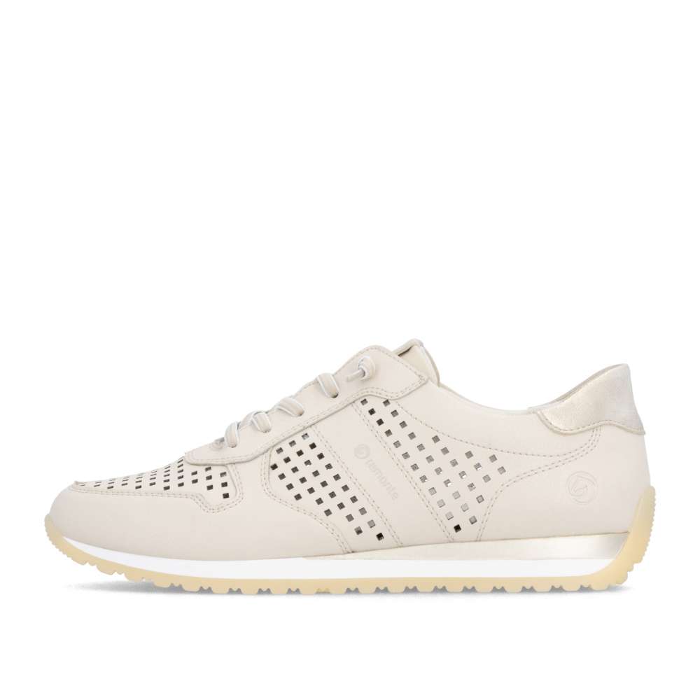 Obuv REMONTE představuje prémiovou řadu značky RIEKER, která se vyznačuje vysokou kvalitou použitých materiálů a precizním zpracováním. Tyto dámské tenisky představují dokonalé spojení moderní estetiky, praktických řešení a celodenního pohodlí, díky čemuž se rychle stanou vaším oblíbeným kouskem v šatníku. Na první pohled zaujmou perforovaným vzorem béžového koženého svršku, který zajistí odvětrávání během teplých dnů, zatímco vkusná loga značky a barevně kontrastní aplikace dodávají botám stylový vzhled. Mimořádně praktické je dvojité řešení šněrování – podle preference si můžete zvolit pružnou gumičku pro rychlé a pohodlné nazutí bez zavazování nebo klasické šňůrky, které umožňují přesné přizpůsobení tvaru nohy. O dokonalý komfort se stará měkká, tvarovaná a vyjímatelná stélka, která poskytuje optimální oporu noze. Širší střih těchto bot přináší maximální pohodlí i ženám se širším chodidlem, jelikož nabízí více prostoru. Propracovaný design podešve dokonale doplňuje celkový vzhled tenisek a navíc svojí flexibilitou doplňuje pohodlí tím, že podporuje přirozený pohyb chodidla. Ať už hledáte pohodlnou obuv do práce, pro volný čas nebo jako stylový doplněk k vašemu každodennímu outfitu, tyto tenisky nabízí komfort a módní nadčasovost v jednom.