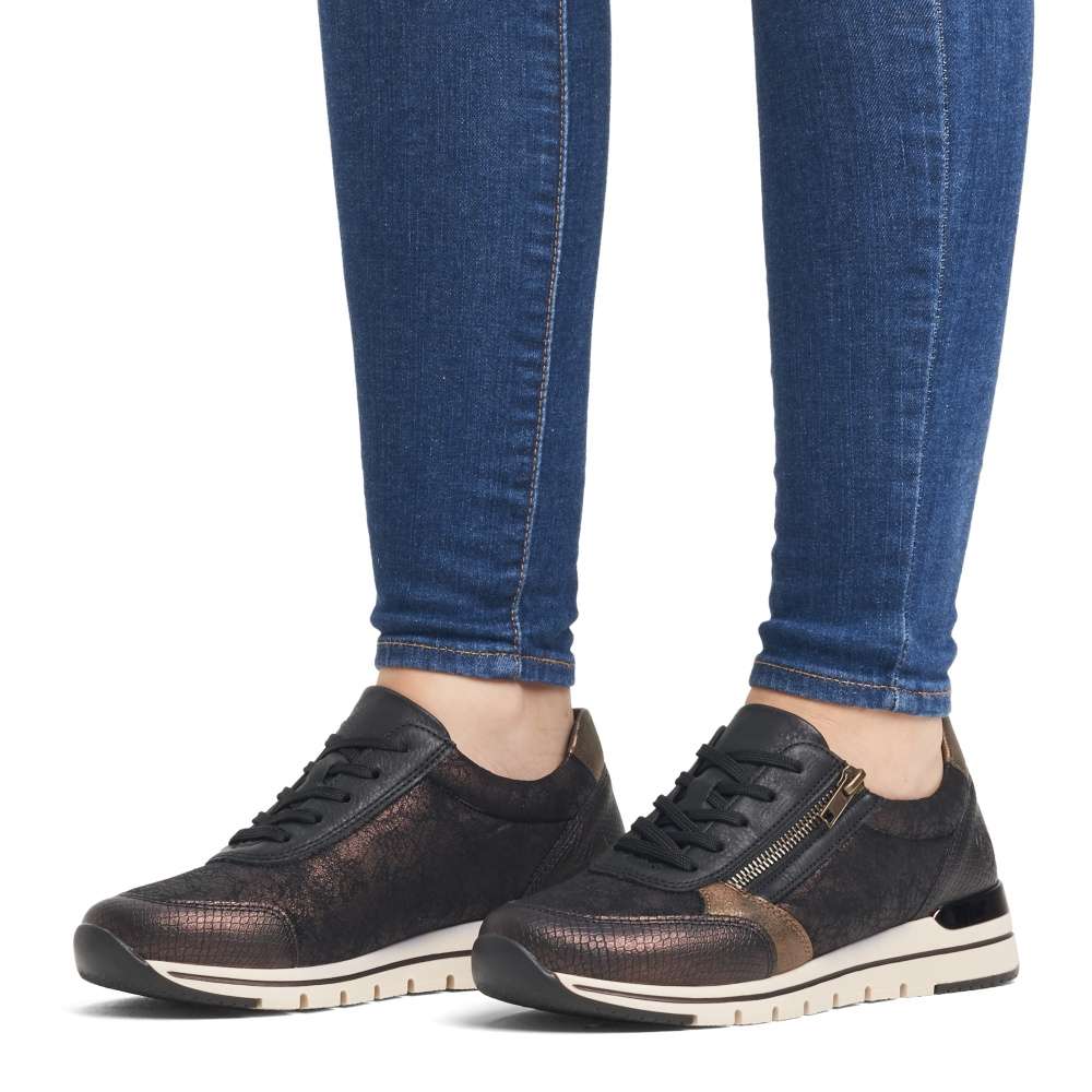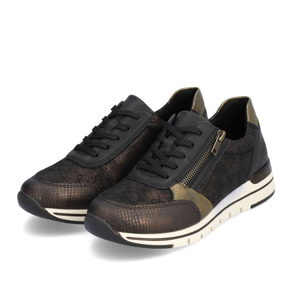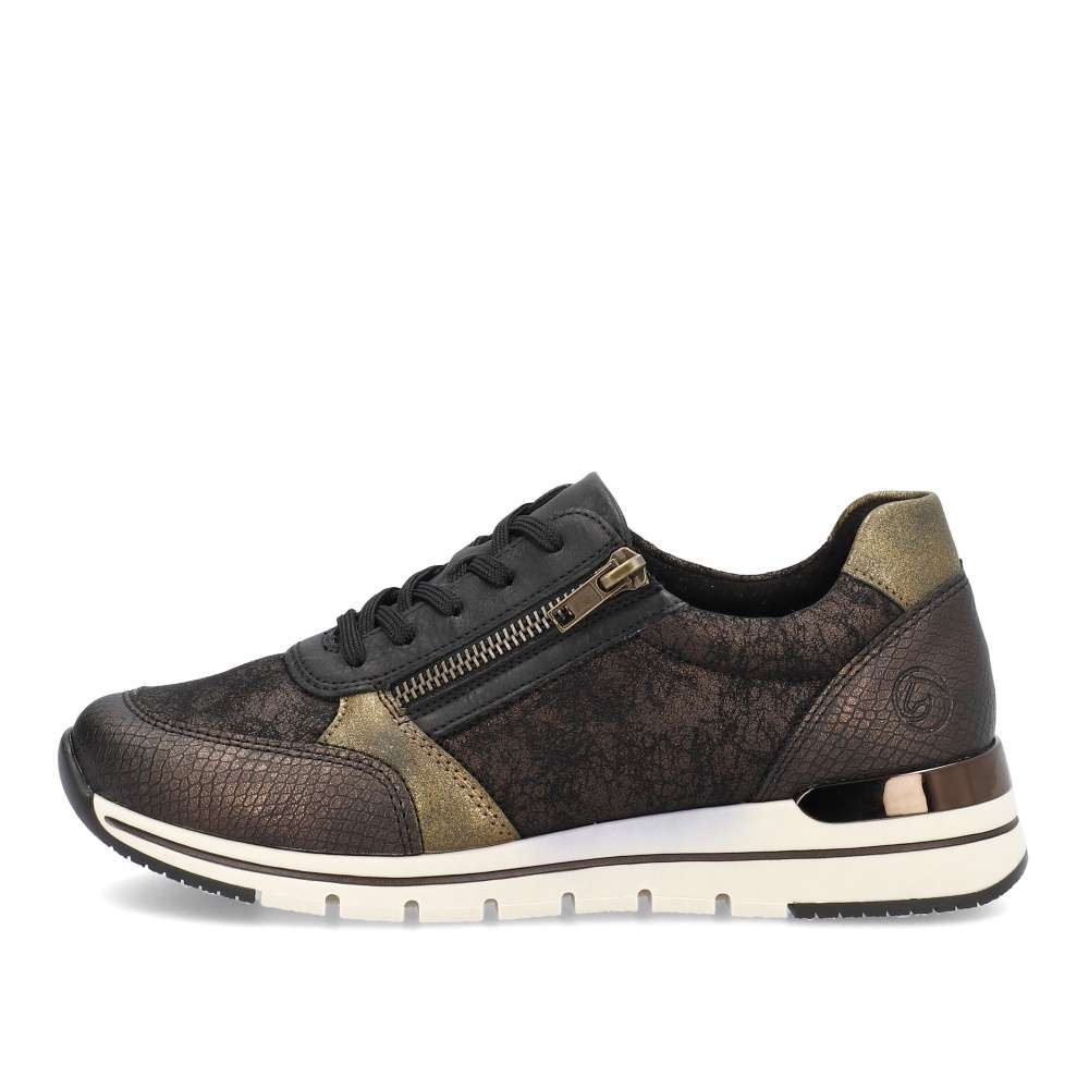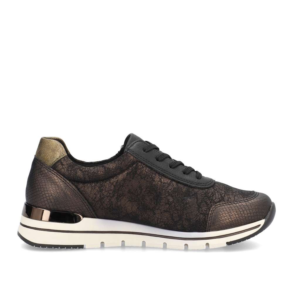 Obuv REMONTE – jedná se o vyšší řadu značky RIEKER, tato obuv se vyznačuje vynikající kombinací svrchních materiálů. V této krásné tenisce se budete cítit vždy příjemně. Svršek je složen z více spolu ladících částí, od hnědé přes měděnou až po zlatou. To vše je doplněno jemným prošíváním, funkčním zipem na nártu a šněrováním. Stélka je tvarovaná a změkčuje každý Váš došlap, navíc je vyjímatelná. Kvalitní syntetická podešev je ozdobena tenkým proužkem v metalické barvě. Celkové přepracování boty vám dodá pocit lehkosti a budete se cítit skvěle na každém kroku. Boty z řady Remonte Vám zajistí maximální komfort a pohodlí při celodenním nošení. Technologie: Remonte Soft – unikátní stélka vyrobená z prodyšného materiálu, která svým tvarem a materiálem zajistí pocit pohodlí při celodenním nošení. Tato bota je vybavena vyjímatelnou stélkou.