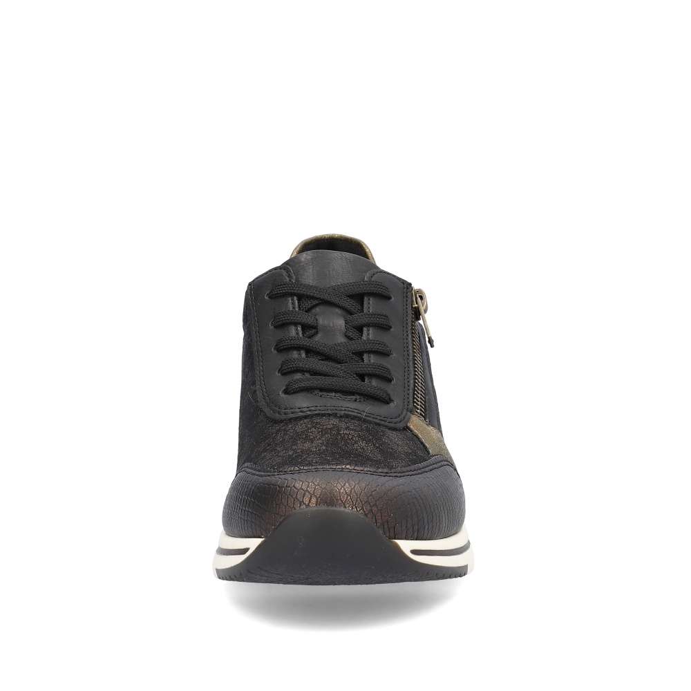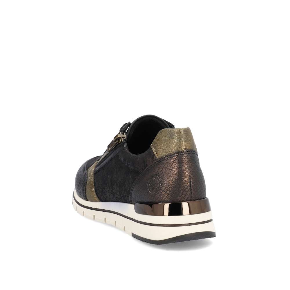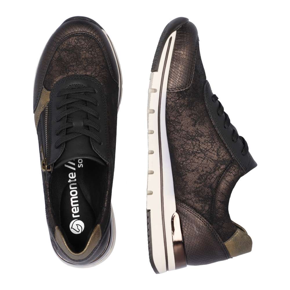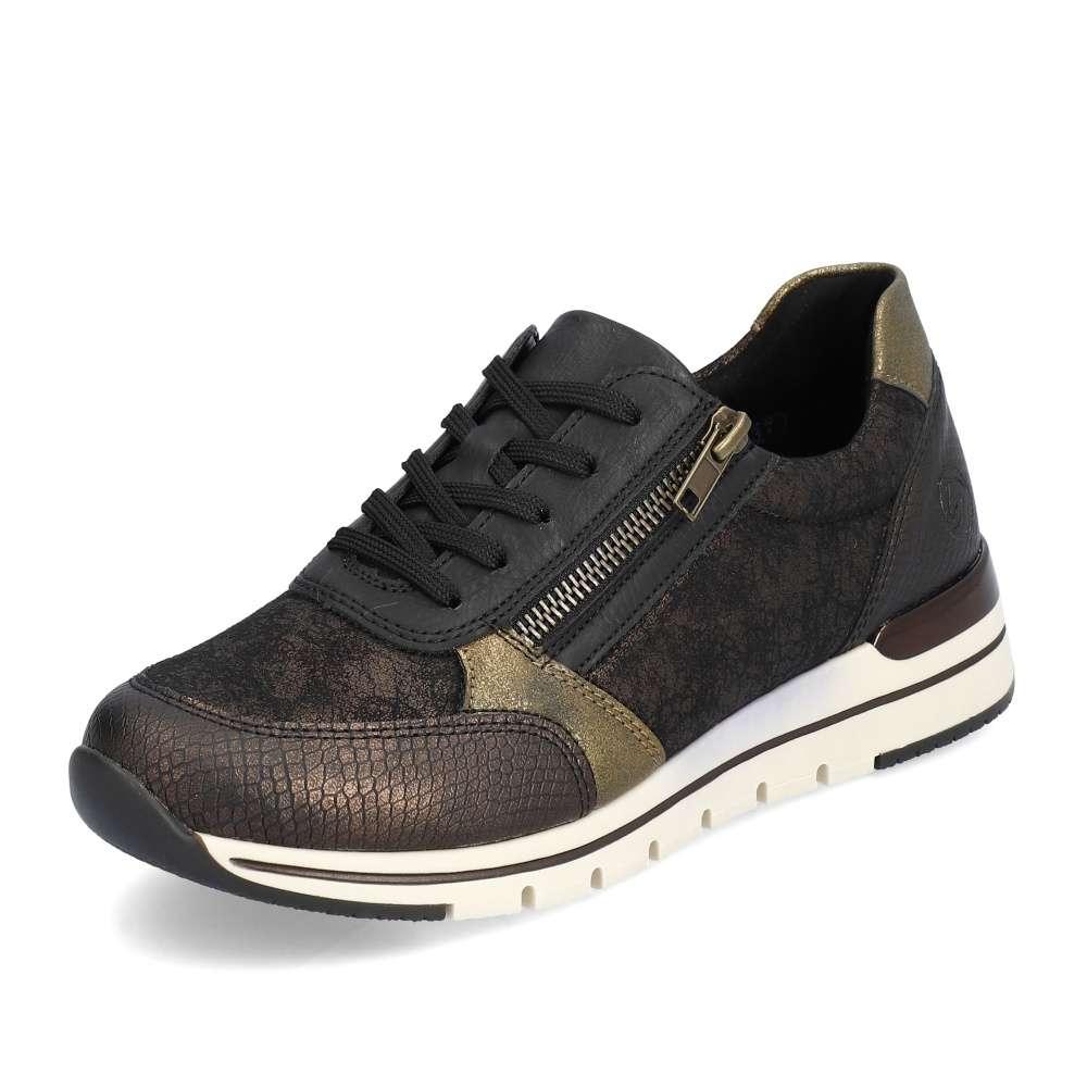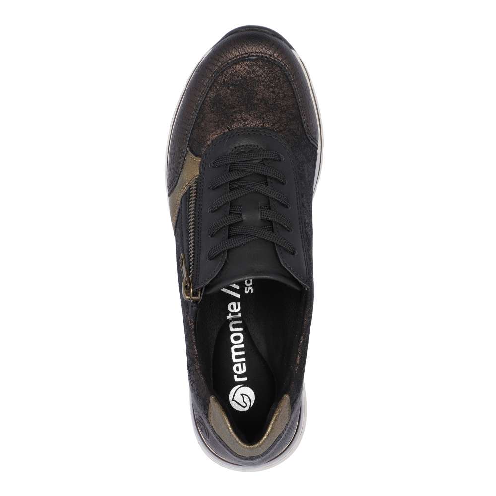 Obuv REMONTE – jedná se o vyšší řadu značky RIEKER, tato obuv se vyznačuje vynikající kombinací svrchních materiálů. V této krásné tenisce se budete cítit vždy příjemně. Svršek je složen z více spolu ladících částí, od hnědé přes měděnou až po zlatou. To vše je doplněno jemným prošíváním, funkčním zipem na nártu a šněrováním. Stélka je tvarovaná a změkčuje každý Váš došlap, navíc je vyjímatelná. Kvalitní syntetická podešev je ozdobena tenkým proužkem v metalické barvě. Celkové přepracování boty vám dodá pocit lehkosti a budete se cítit skvěle na každém kroku. Boty z řady Remonte Vám zajistí maximální komfort a pohodlí při celodenním nošení. Technologie: Remonte Soft – unikátní stélka vyrobená z prodyšného materiálu, která svým tvarem a materiálem zajistí pocit pohodlí při celodenním nošení. Tato bota je vybavena vyjímatelnou stélkou.