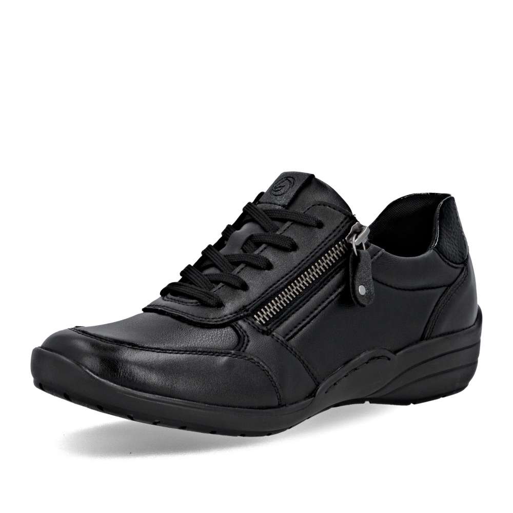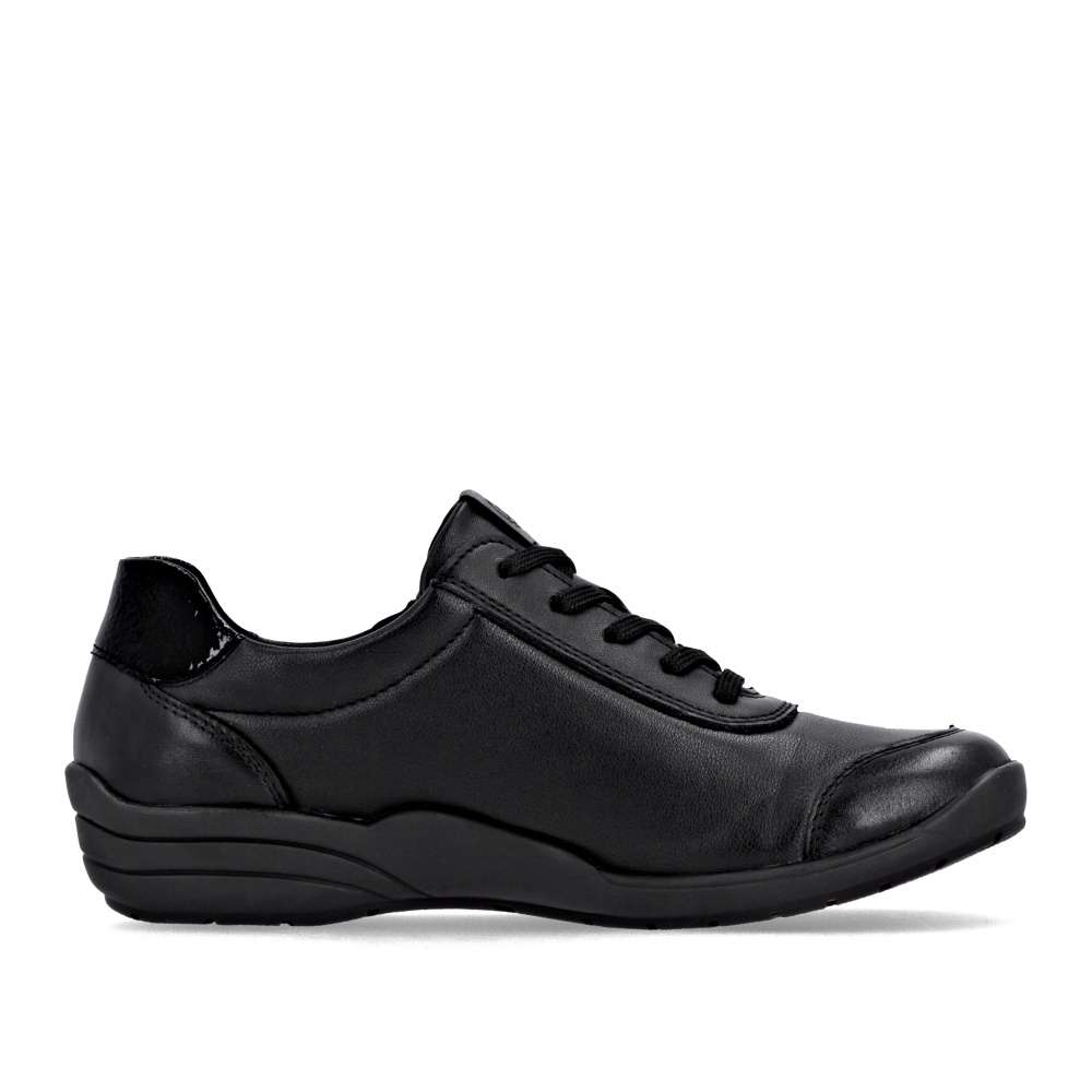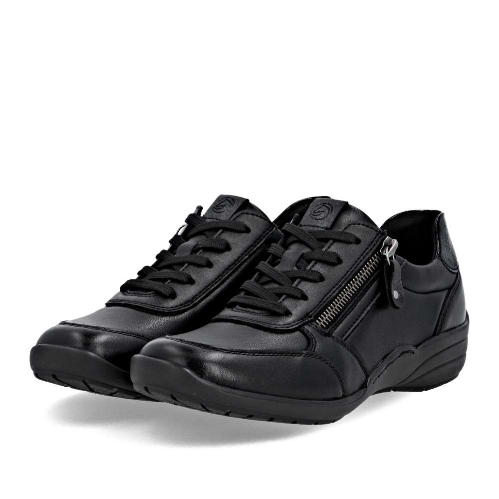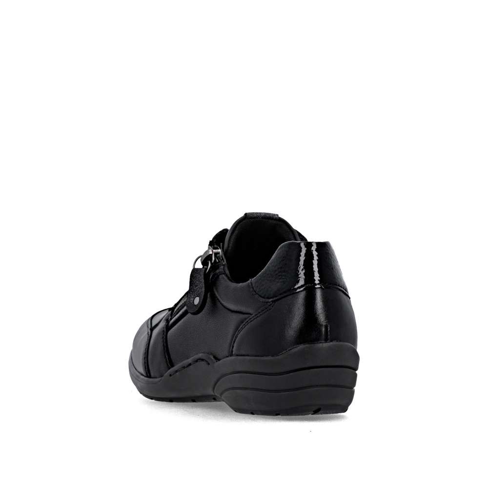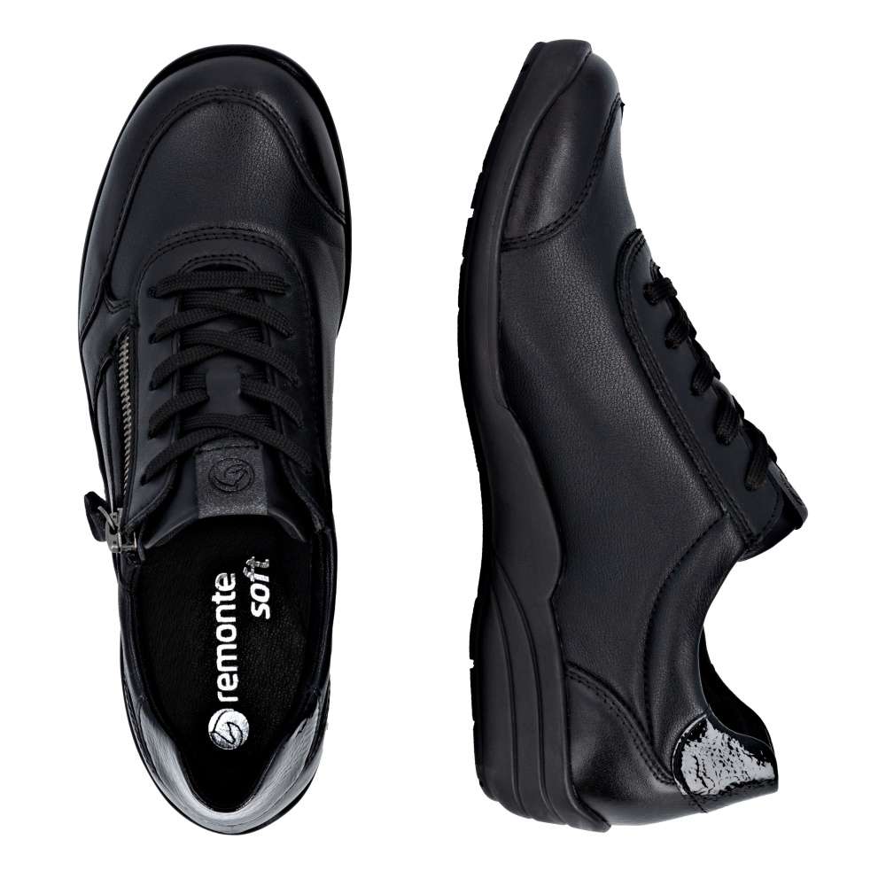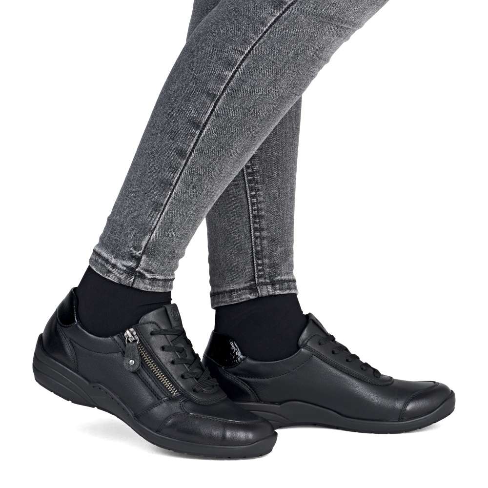 Detailní informace Obuv REMONTE – jedná se o vyšší řadu značky RIEKER, tato obuv se vyznačuje vynikající kombinací svrchních materiálů. Tato dámská teniska značky RIEKER je spojením moderního designu a pohodlí, které oceníte každý den. Černý svršek zdobí zajímavé linie prošití a lesklý prvek v části paty. Praktické šněrování spolu s funkčním zipem na nártu umožňují snadné obutí i individuální přizpůsobení podle potřeby. Celodenní komfort poskytne kožená vyjímatelná stélka. Díky svému jedinečnému vzhledu se tyto tenisky skvěle hodí k různým outfitům – ať už do práce, na nákupy nebo volný čas.