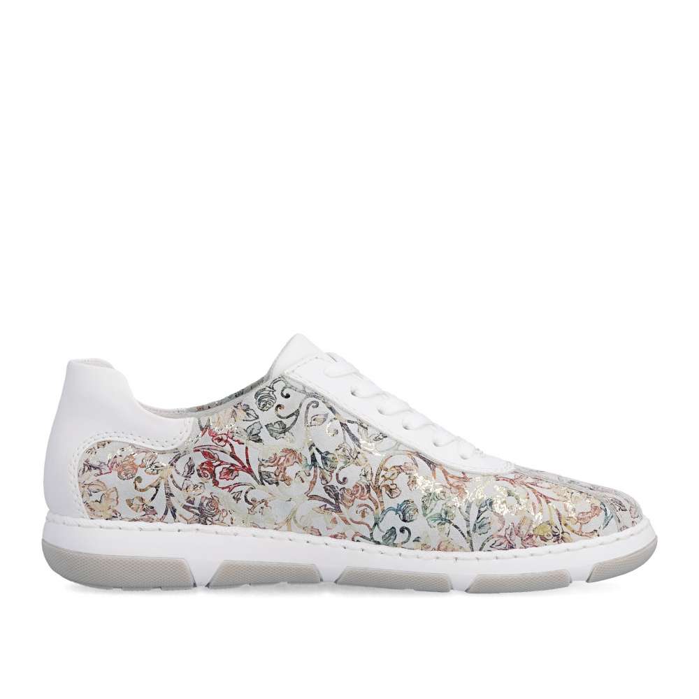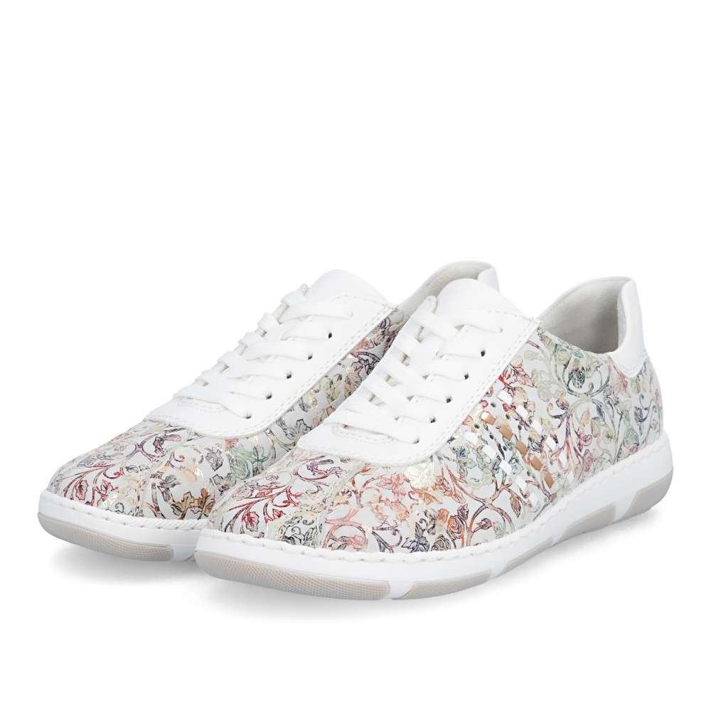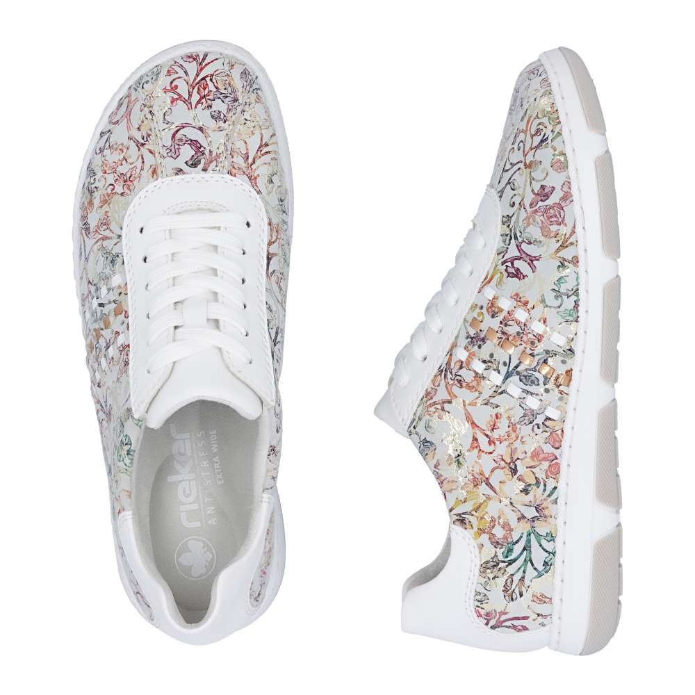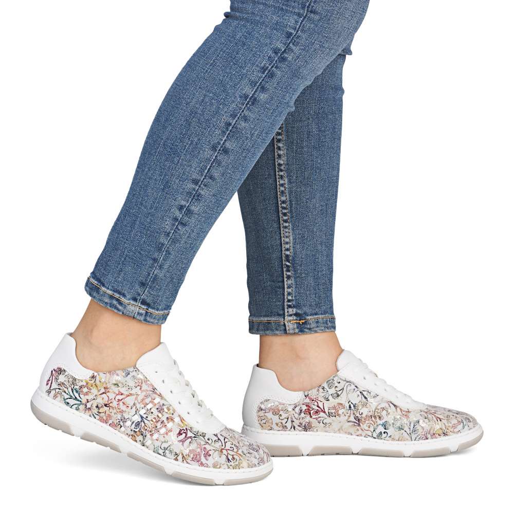 Tyto stylové tenisky od značky Rieker budou skvělým doplňkem do každého botníku. Svršek s barevným květinovým vzorem je obohacen o kontrastní bílé části, které poskytují obuvi svěží a moderní vzhled. Šněrování Vám umožní snadné a rychlé přizpůsobení obuvi, dle požadavků. Vyjímatelná měkká stélka a širší střih bot dodává pohodlí při nošení, což je důležité pro dlouhodobou pohodu při chůzi. Tyto boty si zamilujete a již prostě nebude chtít nosit žádné jiné.