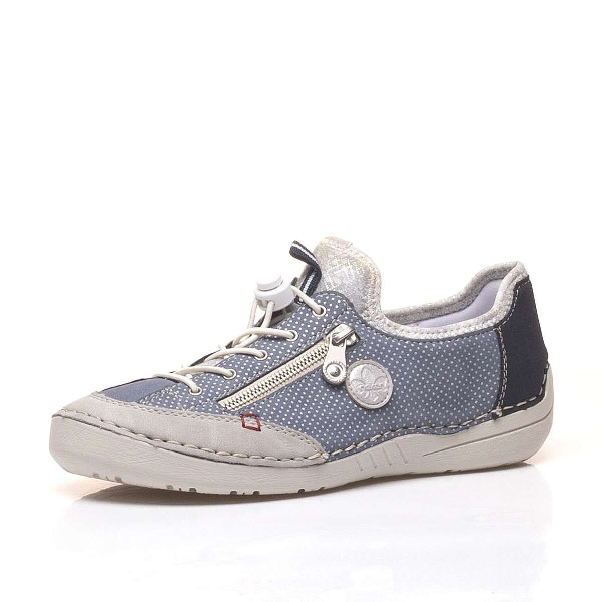 Dámská obuv v modré barvě s ozdobným zipem na boční straně, značky RIEKER.
