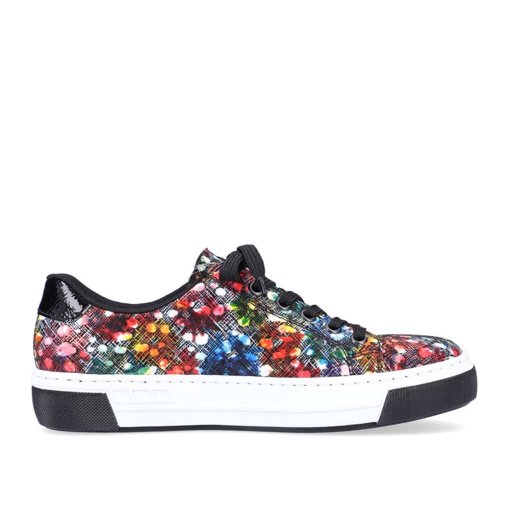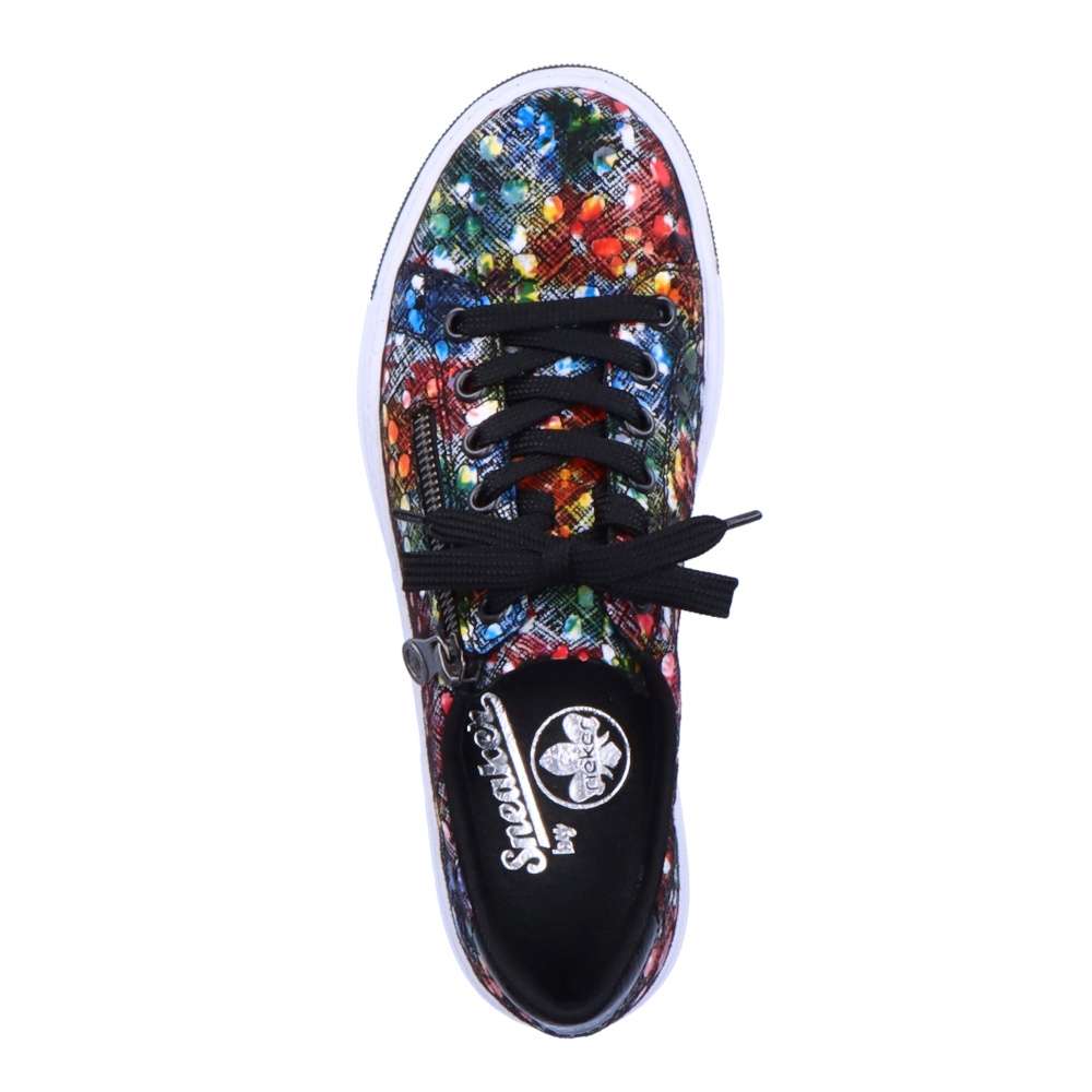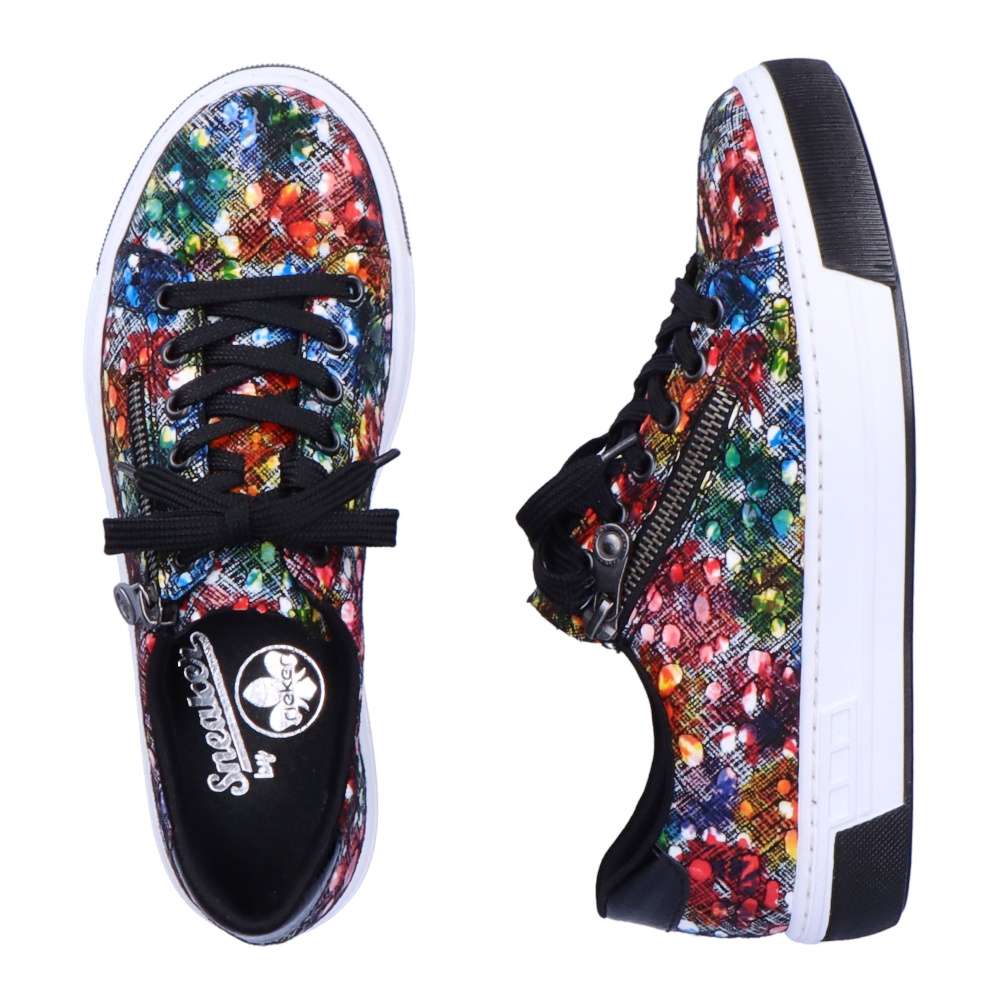 Dámské tenisky známé značky Rieker zaujmou svým jedinečným vzhledem. Vícebarevný svršek je vyroben z kombinace materiálů. Díky tkaničkám na šněrování si obuv můžete upravit přesně podle Vašich představ. Jistě také oceníte měkkou stélku, která dodá běžné chůzi pohodlnost a komfort. Vyšší podešev zpříjemní kroky po nerovných plochách. Tato obuv se bude skvěle kombinovat jak s šaty, tak kalhotami. Technologie: Antistress – podešev je díky této technologii lehká, flexibilní, absorbuje nárazy při došlapu a snadno se přizpůsobí každé noze.