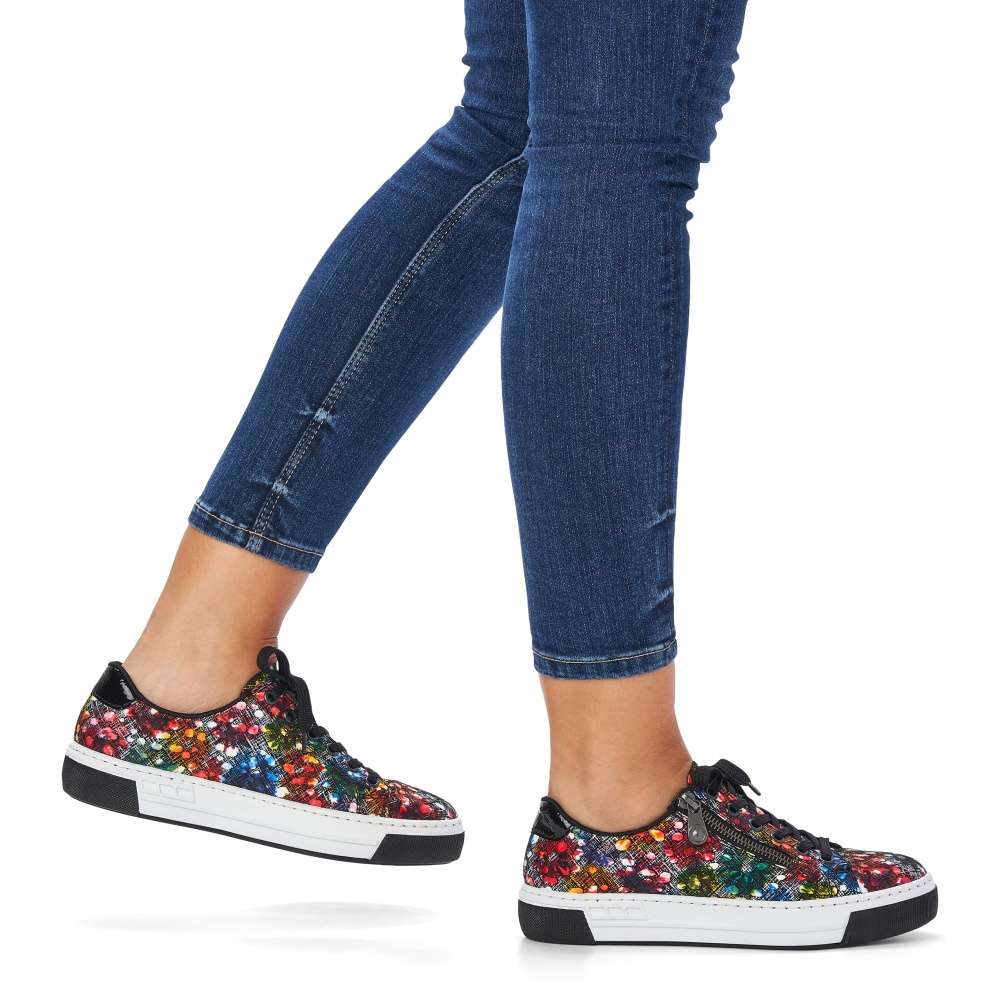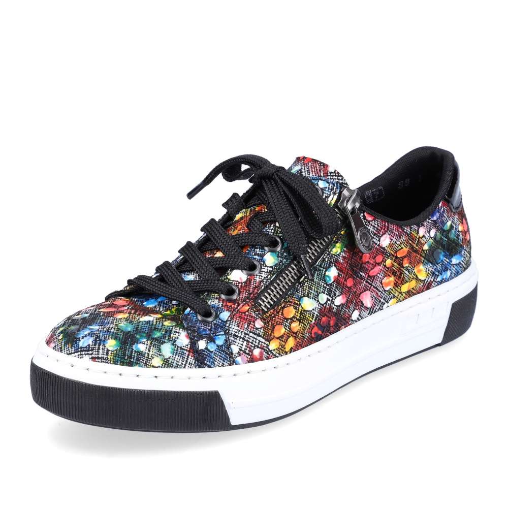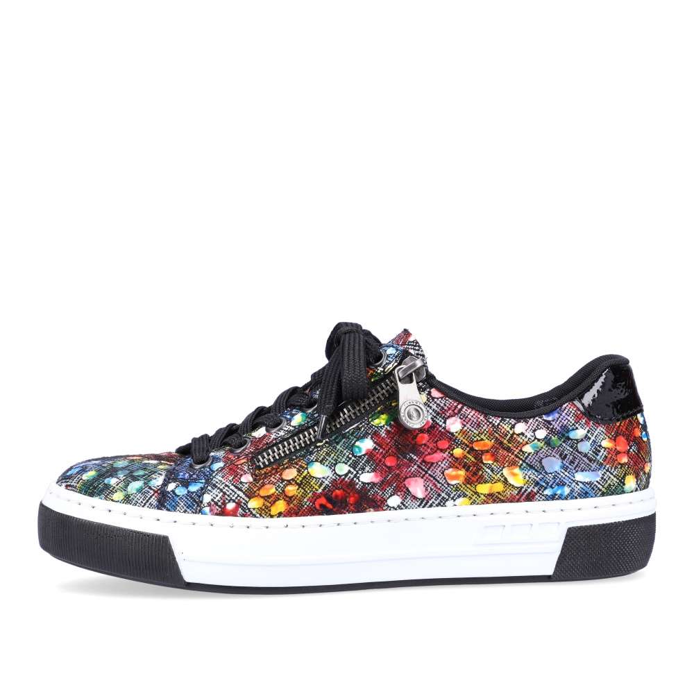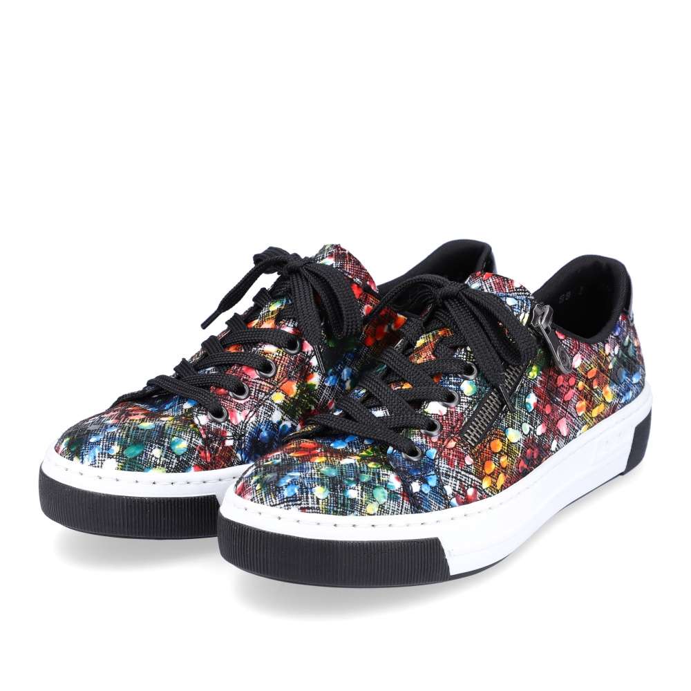 Dámské tenisky známé značky Rieker zaujmou svým jedinečným vzhledem. Vícebarevný svršek je vyroben z kombinace materiálů. Díky tkaničkám na šněrování si obuv můžete upravit přesně podle Vašich představ. Jistě také oceníte měkkou stélku, která dodá běžné chůzi pohodlnost a komfort. Vyšší podešev zpříjemní kroky po nerovných plochách. Tato obuv se bude skvěle kombinovat jak s šaty, tak kalhotami. Technologie: Antistress – podešev je díky této technologii lehká, flexibilní, absorbuje nárazy při došlapu a snadno se přizpůsobí každé noze.