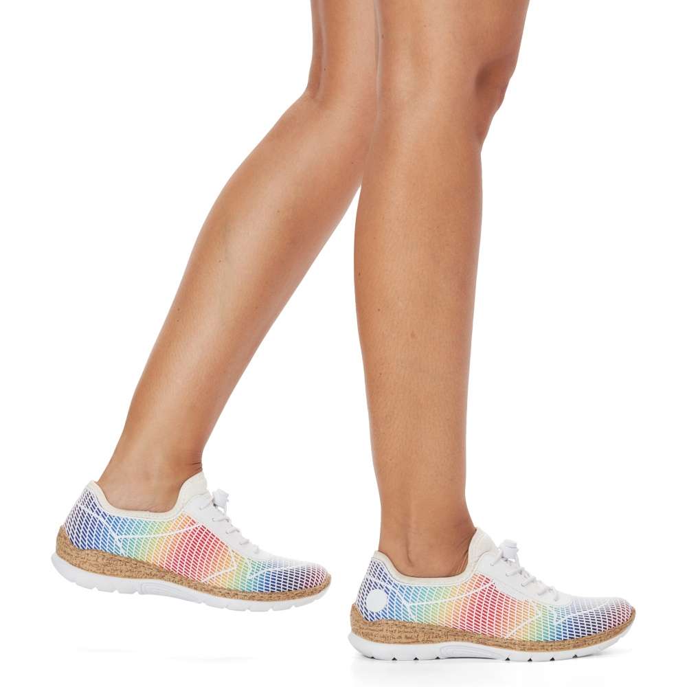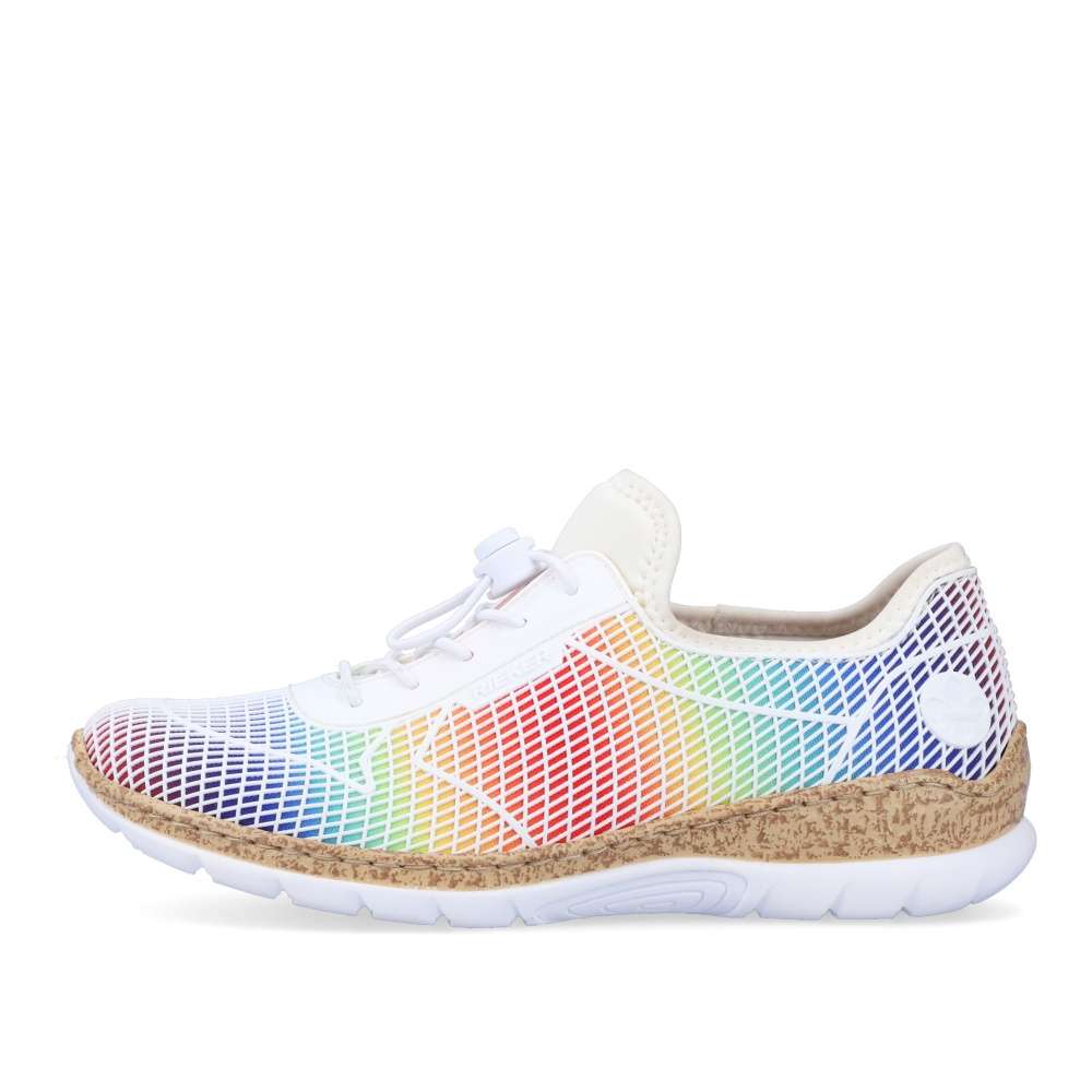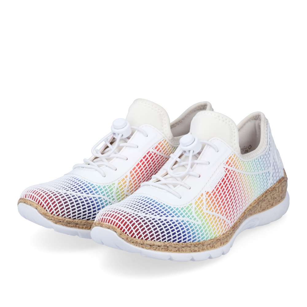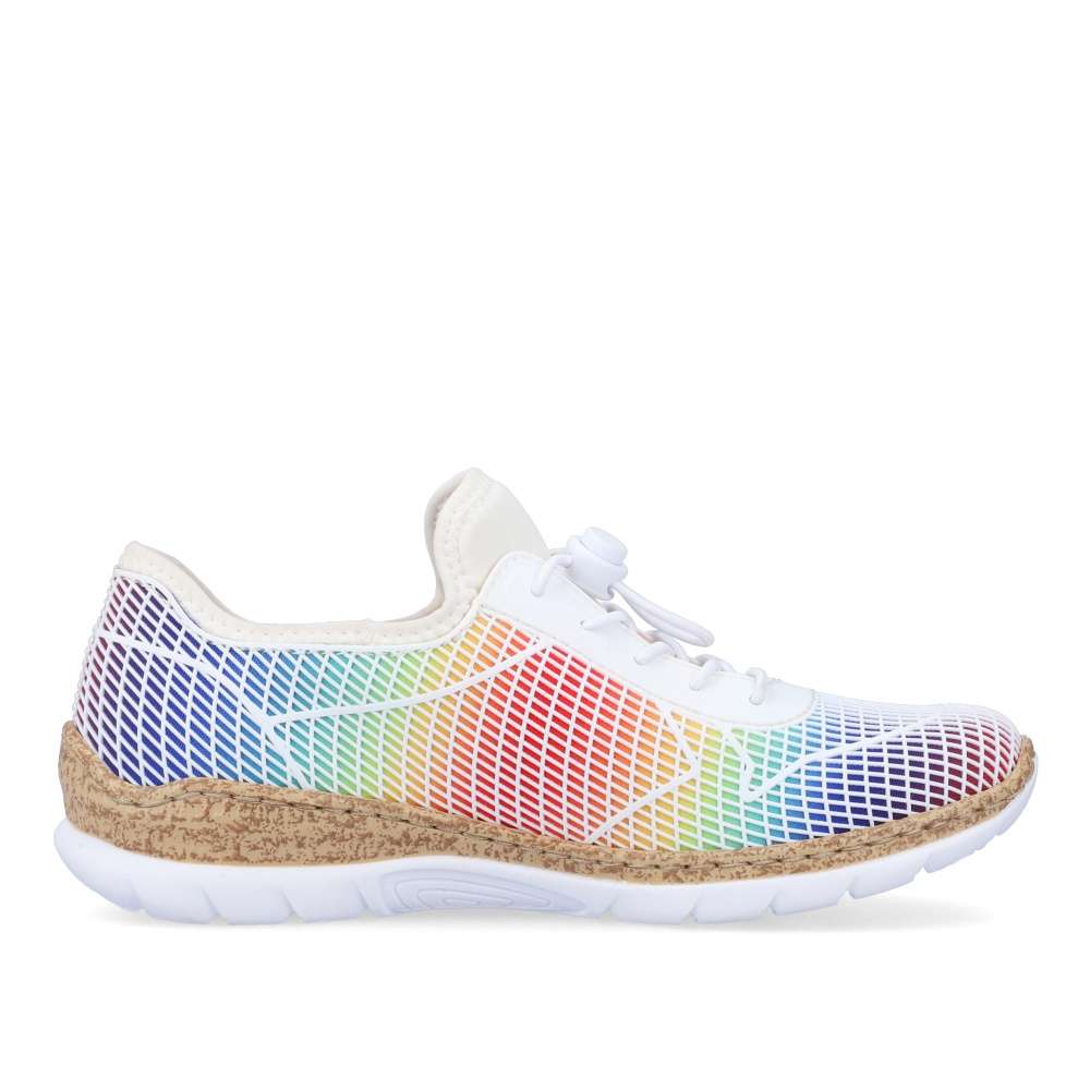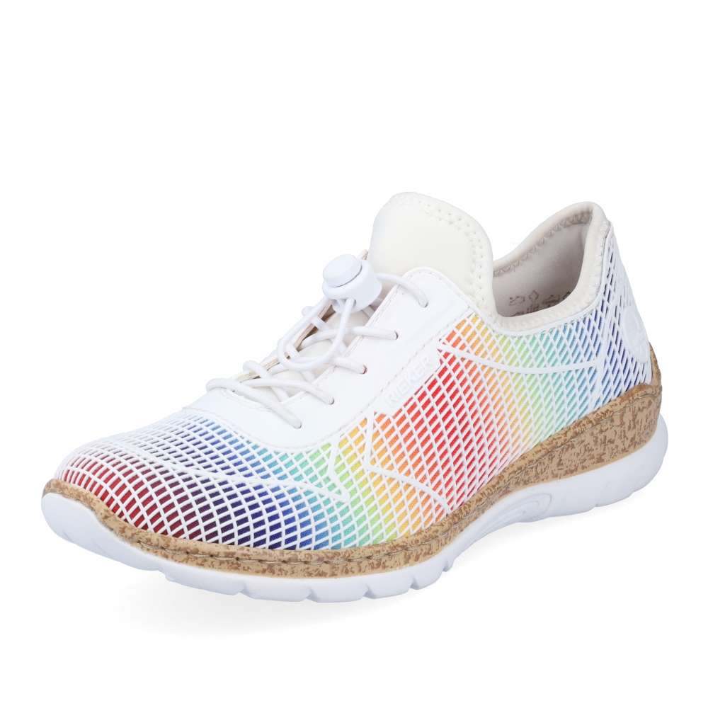 Detailní informace Elegantní, ale zároveň sportovní jsou tyto polobotky značky RIEKER. Duhový svršek je doplněn bílou mřížkou, logem značky či pružným lemem horního okraje obuvi. Snadno si obuv nazujete a přizpůsobíte díky šněrování pružnou gumičkou, které lze snadno utáhnout či povolit. Unikátní textilní stélka z paměťové pěny změkčí došlap a přizpůsobí se tvaru Vašeho chodidla. Podešev v horní části s imitací korku je vyrobená s technologií Antistress díky níž je lehká a flexibilní. Tento vysoce komfortní vzor je vhodný pro každodenní nošení ke každému outfitu.