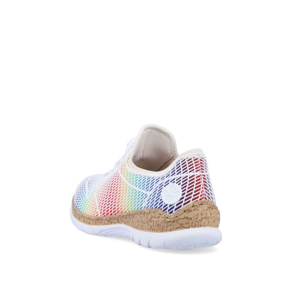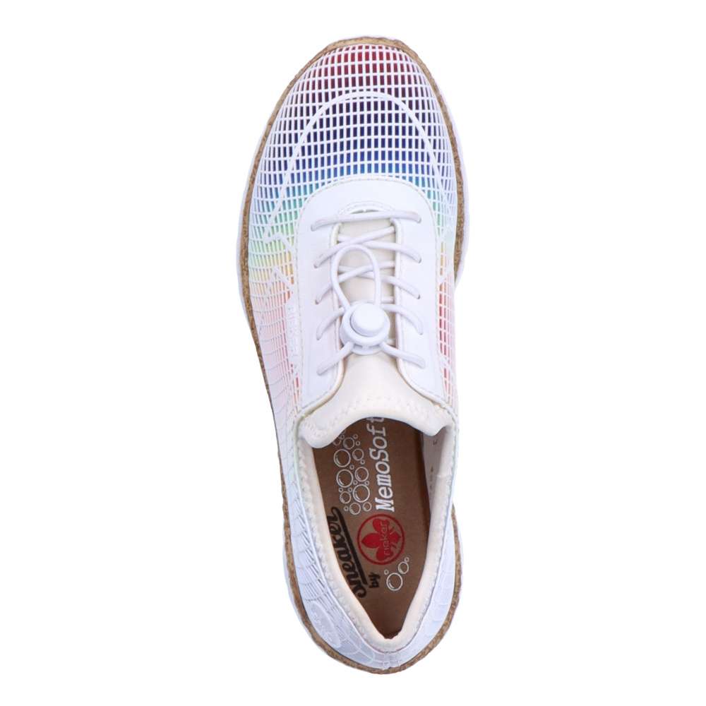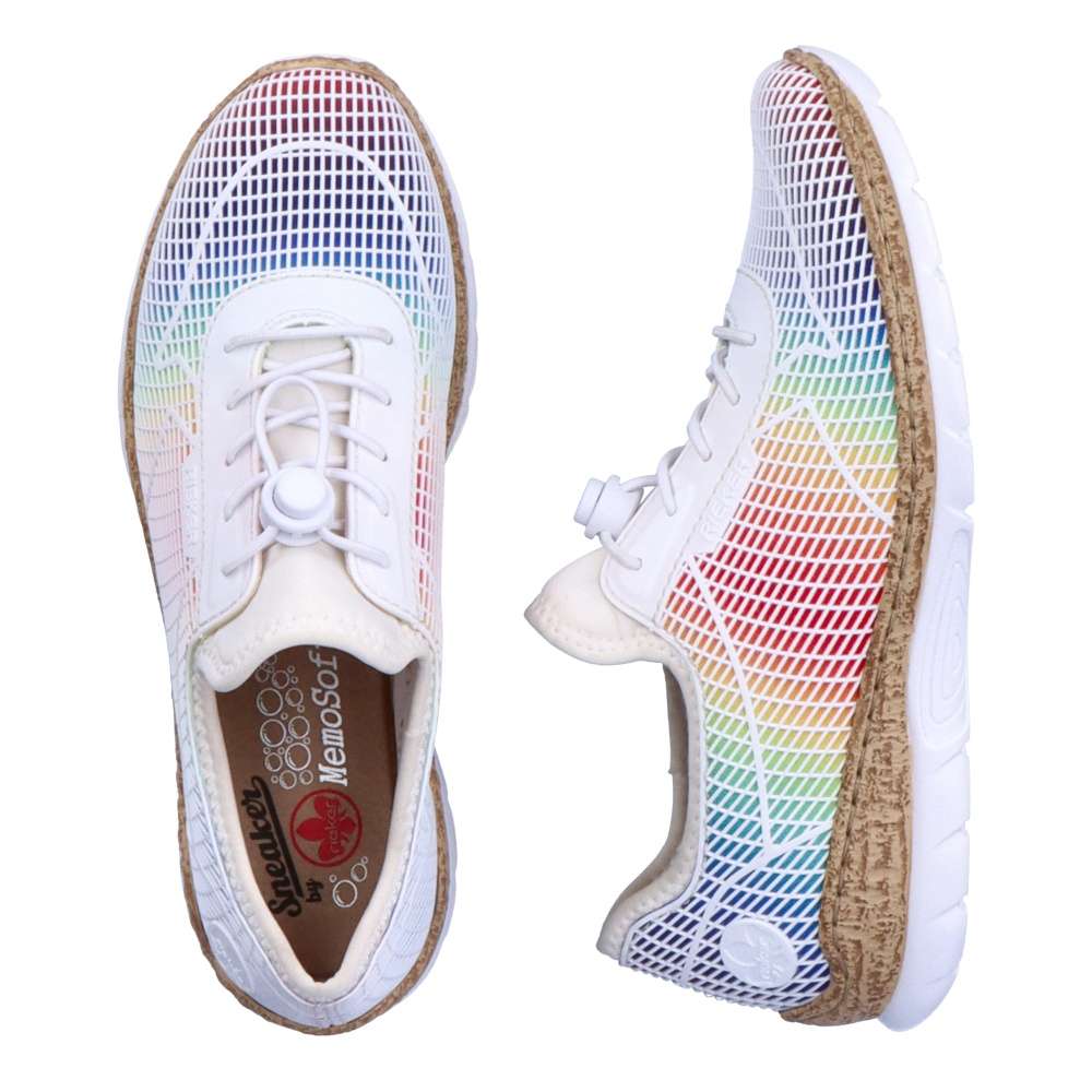Elegantní, ale zároveň sportovní jsou tyto polobotky značky RIEKER. Duhový svršek je doplněn bílou mřížkou, logem značky či pružným lemem horního okraje obuvi. Snadno si obuv nazujete a přizpůsobíte díky šněrování pružnou gumičkou, které lze snadno utáhnout či povolit. Unikátní textilní stélka z paměťové pěny změkčí došlap a přizpůsobí se tvaru Vašeho chodidla. Podešev v horní části s imitací korku je vyrobená s technologií Antistress díky níž je lehká a flexibilní. Tento vysoce komfortní vzor je vhodný pro každodenní nošení ke každému outfitu. Technologie: Antistress – podešev je díky této technologii lehká, flexibilní, absorbuje nárazy při došlapu a snadno se přizpůsobí každé noze. MemoSoft – unikátní stélka z paměťové pěny, která změkčuje došlap, ale také se maximálně přizpůsobí tvaru Vašeho chodidla.