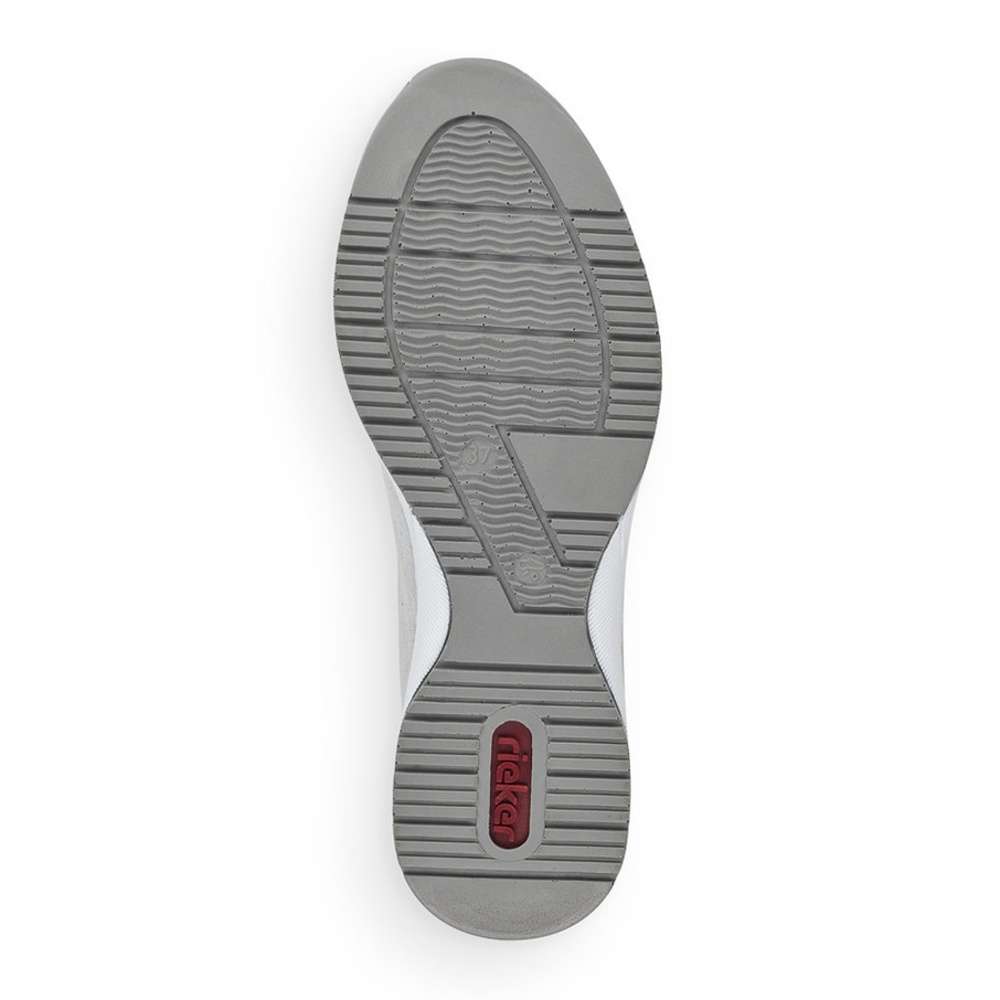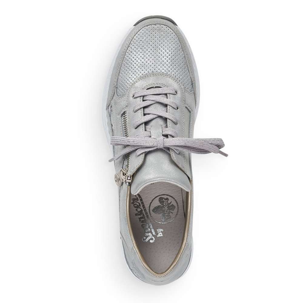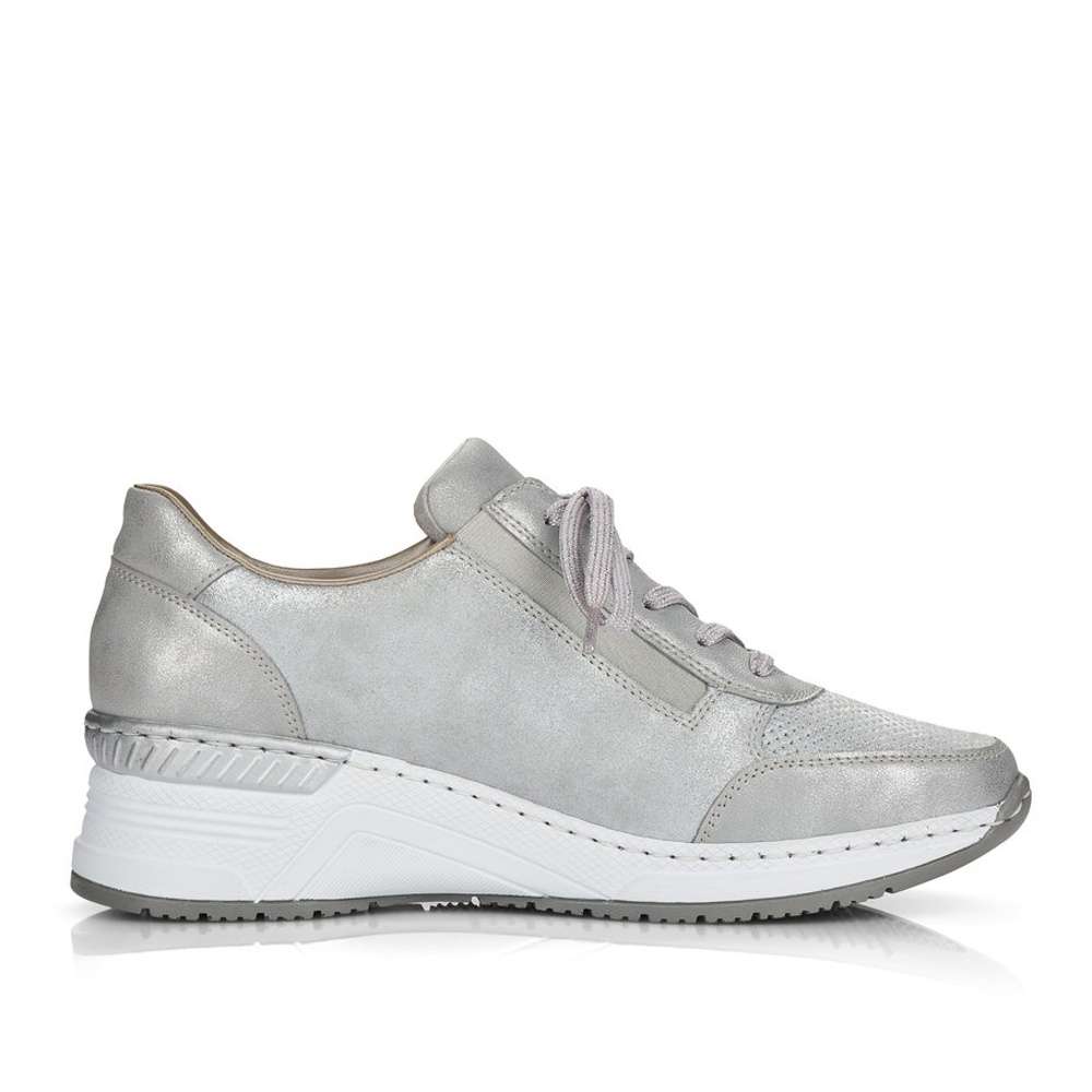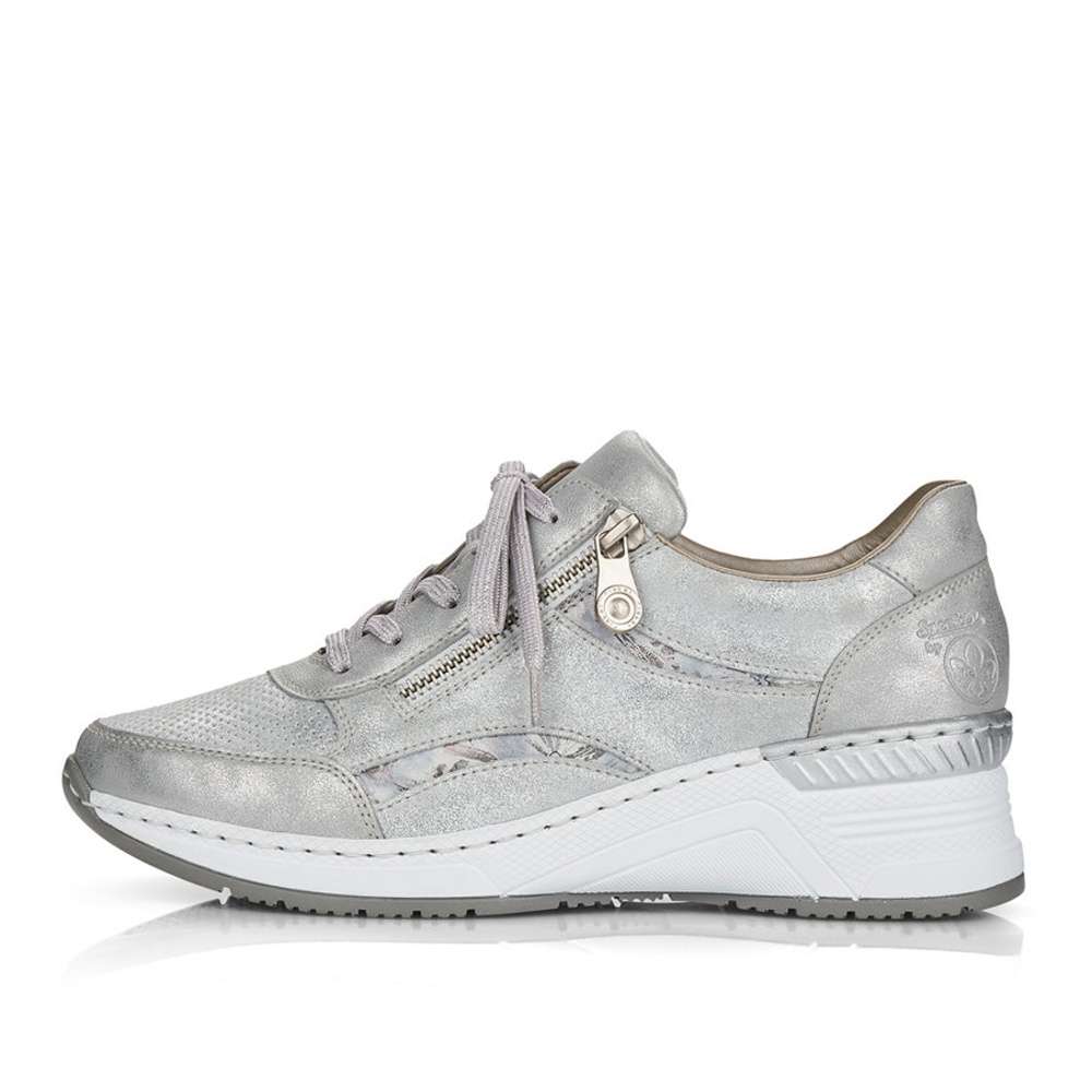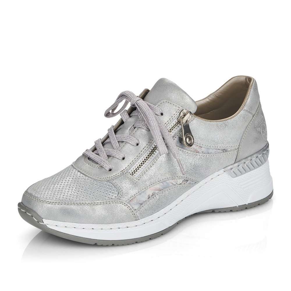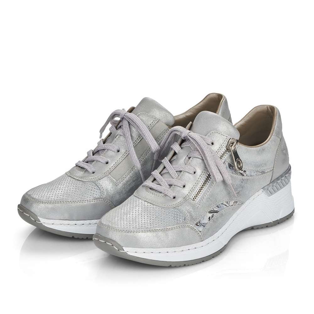 Šedé tenisky od značky RIEKER, které mají částečnou perforaci, která neprochází celou tloušťku materiálu jsou ozvláštněny o květinové detaily. Obutí Vám usnadní funkční zip a pružná vsazená gumička po boku. Kvalitní stélka Vám zaručí pohodlí a komfort i při celodenním nošení. Kamkoliv si vyjdete bude se za Vámi každý otáčet a Vy se budete cítit skvěle.