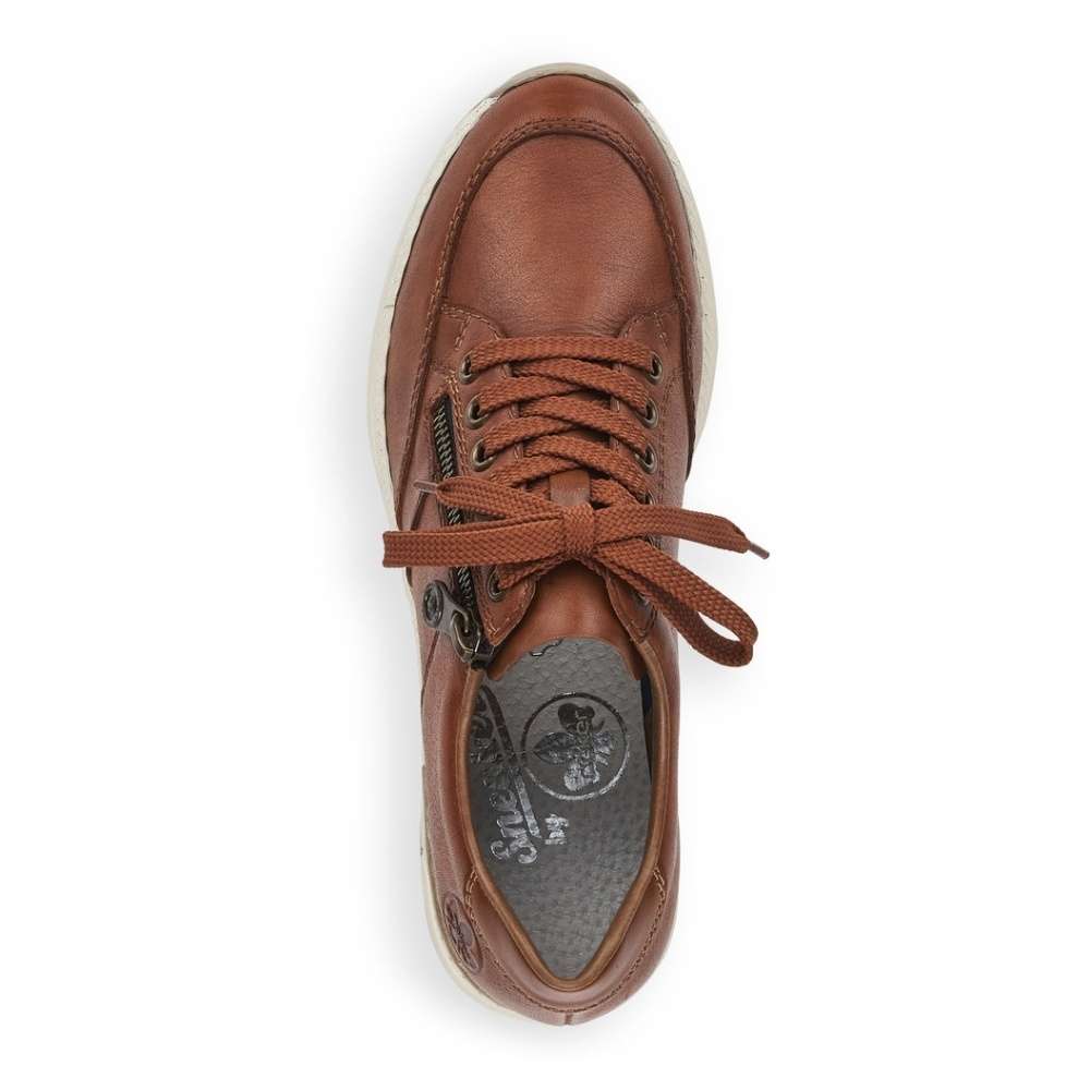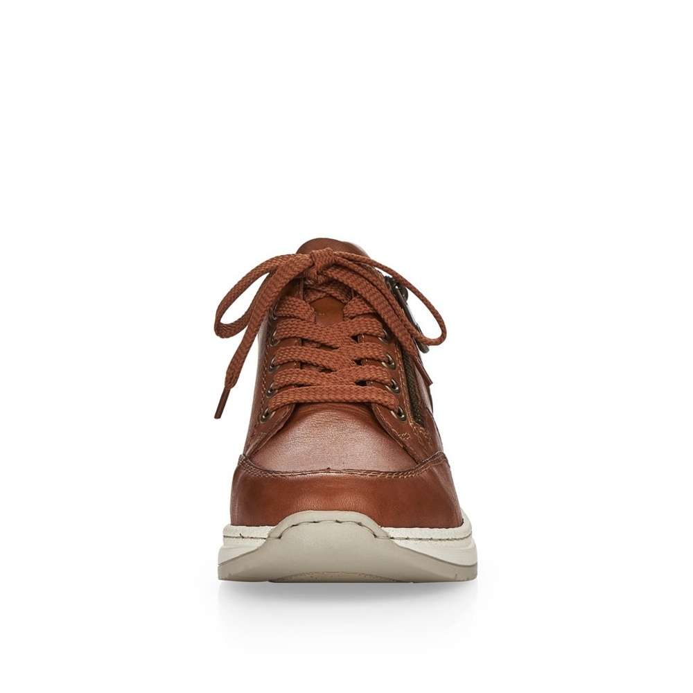 Detailní informace Elegantní provedení tohoto modelu značky RIEKER dělá z této obuvi tu správnou volbu na pochůzky městem. Hladký kožený svršek hnědé barvy je jemně prošitý a na patě ozdoben vytlačeným logem značky. Snadné nazouvání a přizpůsobení dle požadavků zajistí funkční zip společně se šněrováním tkaničkami. Měkká kožená stélka je vyjímatelná a vyšší podešev zdobena lesklým pruhem je se svrškem spojena šitím, díky kterému je obuv lehká a flexibilní. Jednoduchost tohoto modelu z něj dělá tu správnou volbu ke všem outfitům.