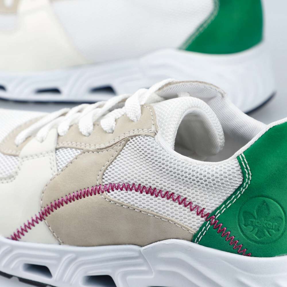 Detailní informace Těmito dámskými teniskami od značky Rieker neuděláte krok vedle. Svršek obuvi je složen z několika různě barevných částí, které spolu krásně ladí a utváří tak dokonalý vzhled této obuvi. Šněrováním si obuv snadno přizpůsobíte dle svých představ a pohodlí na každém kroku zajistí měkká stélka, která se dá snadno vyjmout a tím pádem i vyměnit. Tento model vynosíte na procházku městem, do práce a bude ideální volbou ke kalhotám i sukni.
