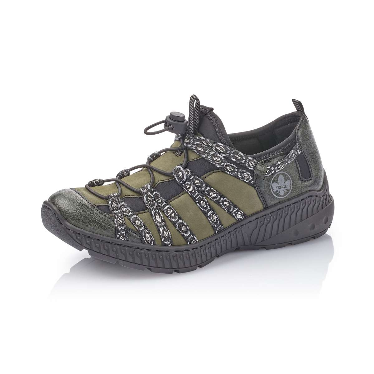 Vycházková obuv sportovního stylu značky Rieker je v krásném provedení zelené barvy a místo dírek pro tkaničky, je zde uchycení přes zdobné pásky. Pro snadné obutí slouží šněrování pomocí pružných gumiček, které lze decentně utáhnout. S tímto modelem rozhodně zazáříte ať už na procházce přírodou nebo při sportovním využití.