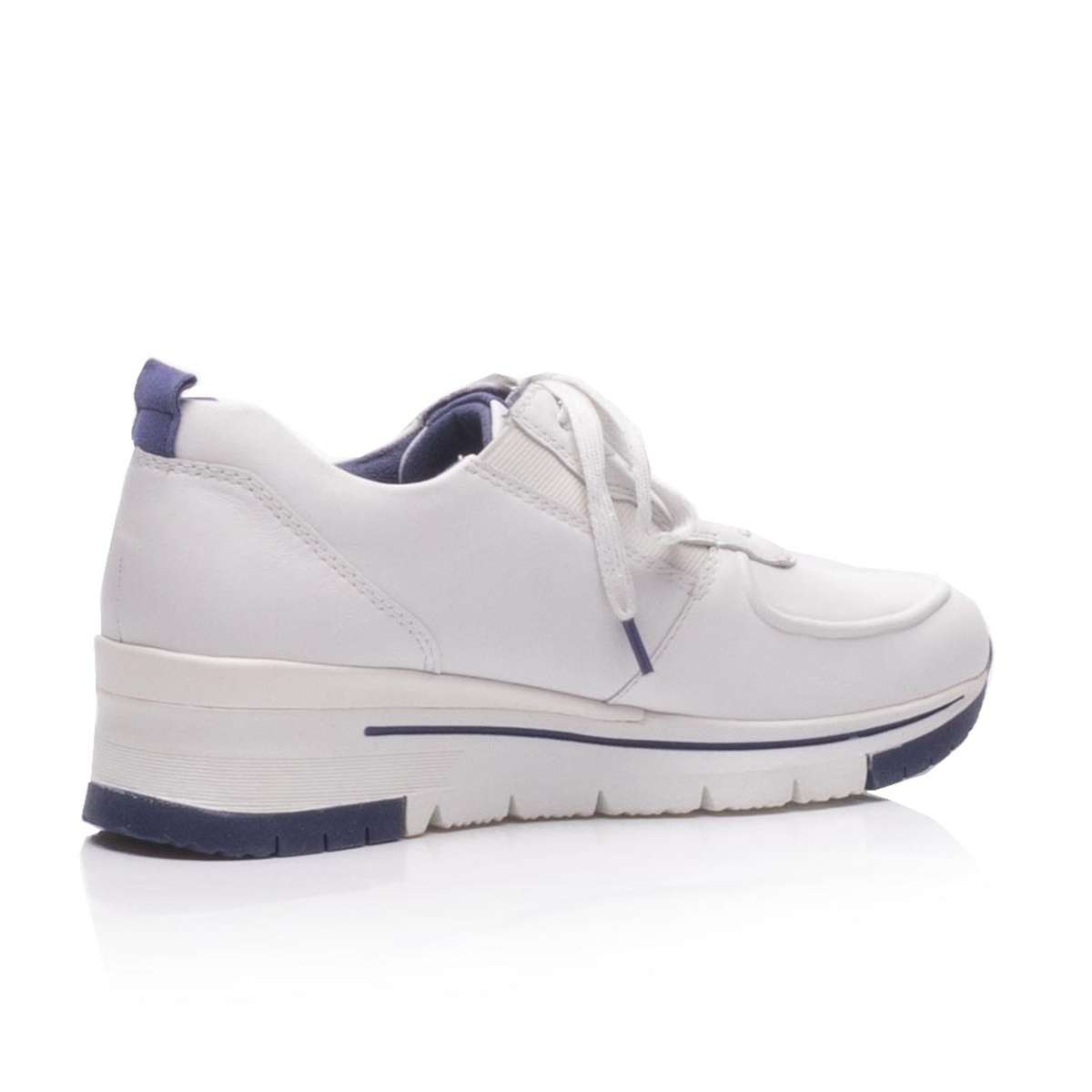 Dámské tenisky jsou šité z pravé kůže v bílé barvě doladěné pak jsou modrými doplňky a stříbrným vláknem v tkaničce. Na vnitřní straně je pružná gumička pro snadné obutí a přizpůsobení přímo k Vaší noze. Vyšší podešev a úžasně měkká stélka se Vám postarají o pohodlný a příjemný každý krok. Tento model užijete vždy a všude, ať už k volnočasovým či pracovním povinnostem.