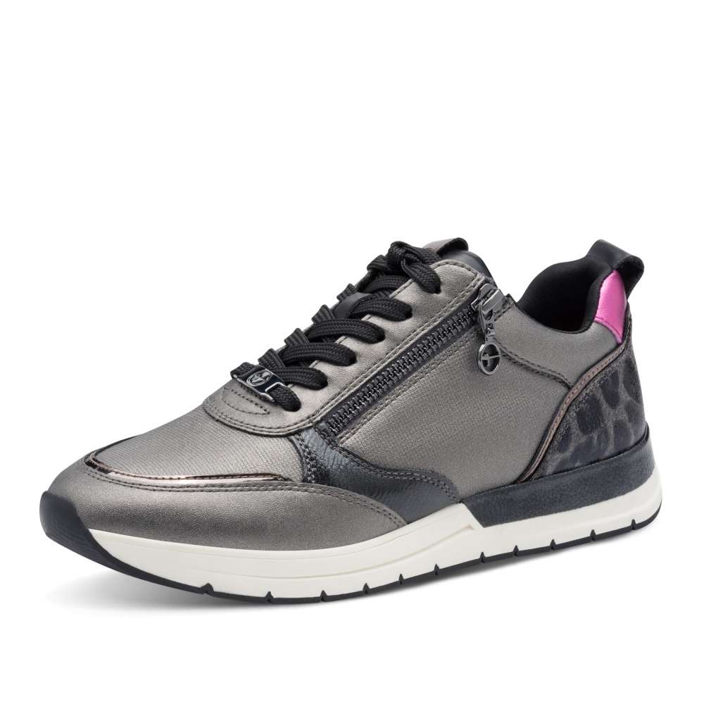 Detailní informace Tyto tenisky značky Tamaris v sobě spojují jedinečný design a maximální pohodlí. Svršek tvoří kombinace různých materiálů, zvířecího vzoru a odlesků, které dodávají obuvi výrazný a moderní vzhled. Stylový zip a ozdobné šněrování nejen zaujmou na pohled, ale i usnadní obutí a vyjímatelná měkká stélka spolu s lehce zvýšenou podešví zajistí celodenní komfort. Tento model je skvělou volbou pro ženy, které chtějí být originální a cítit se skvěle každý den.