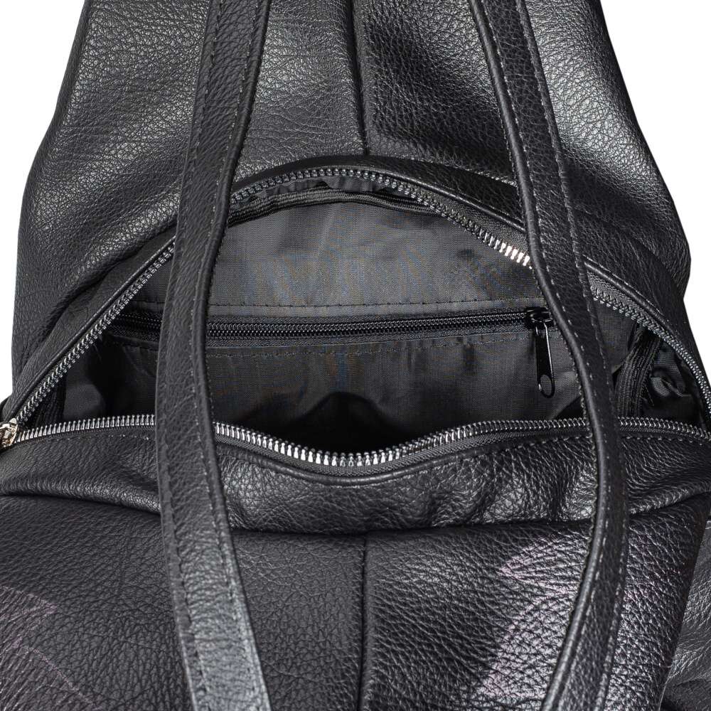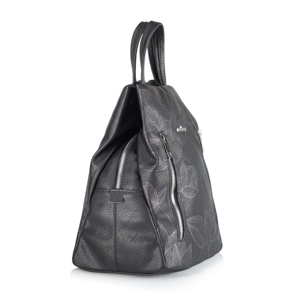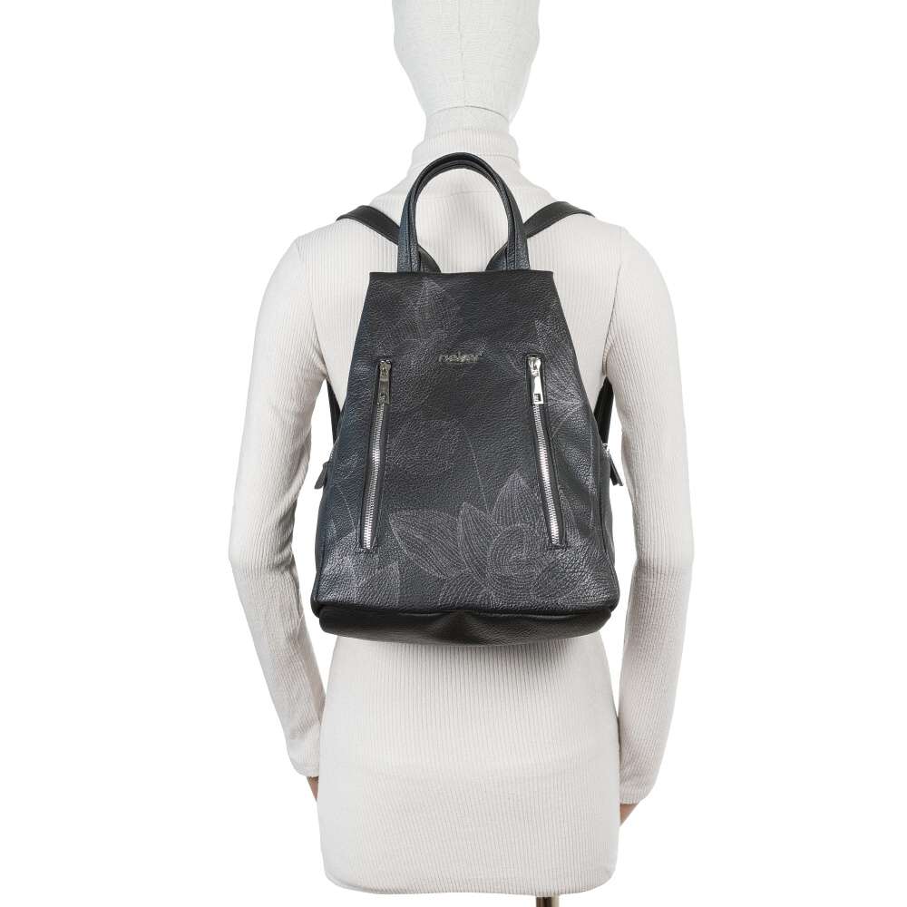 Černý svršek zdobený unikátním potiskem květin okouzlí svým půvabem každou z vás, originální vzhled doplňují dva výrazné zipy uzavírající malé kapsičky umístěné na přední části. Logo značky ve stříbrné barvě dodává vzhledu punc originality. Batoh má hlavní kapsu uzavřenou zipem a obsahuje dvě menší kapsičky pro lepší organizaci drobností. Maximální pohodlí při nošení na zádech je zajištěno dvěma délkově nastavitelnými popruhy a praktické jsou také dva kratší popruhy pro nošení v ruce. Tento batoh není jen módním doplňkem, ale také praktickým společníkem pro každodenní použití. Jeho stylový design a funkčnost jej dělají skvělou volbou pro různé aktivity, ať už jde o cestování, do práce nebo pro volný čas. Rozměry: cca V 35 cm x Š 27 cm x H 19 cm Vnitřní uspořádání: batoh není dělený. Batoh má délkově nastavitelné popruhy.