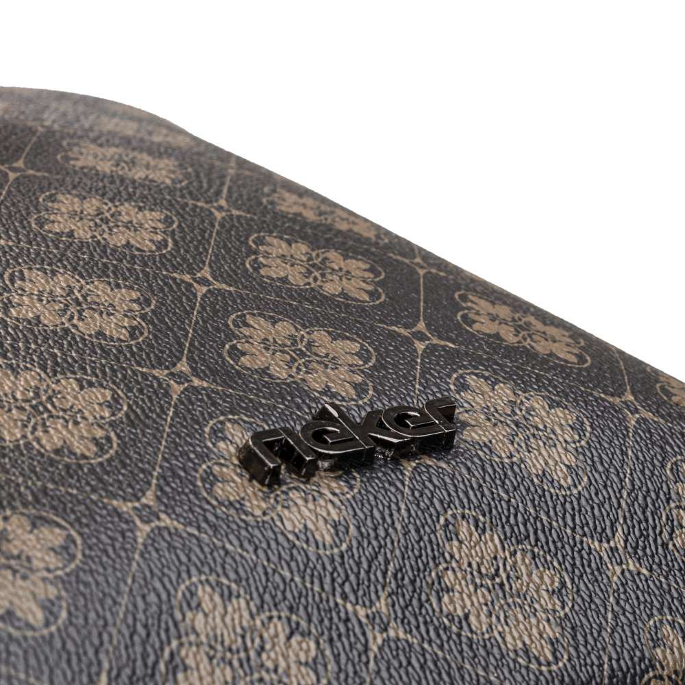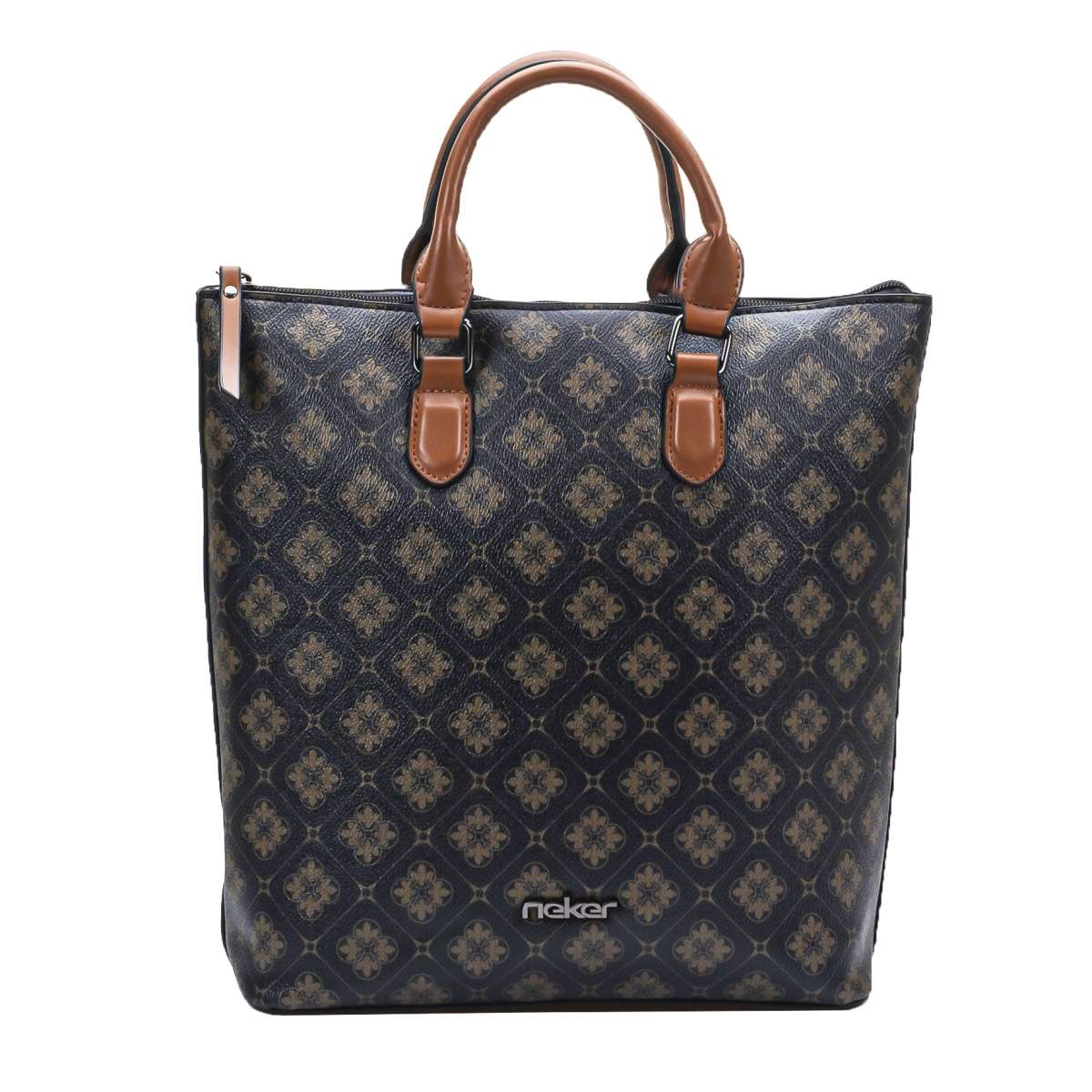 Jednoduchý černý svršek doplněný hnědými doplňky je zdoben potiskem logem značky a na přední straně kovovým nápisem Rieker.