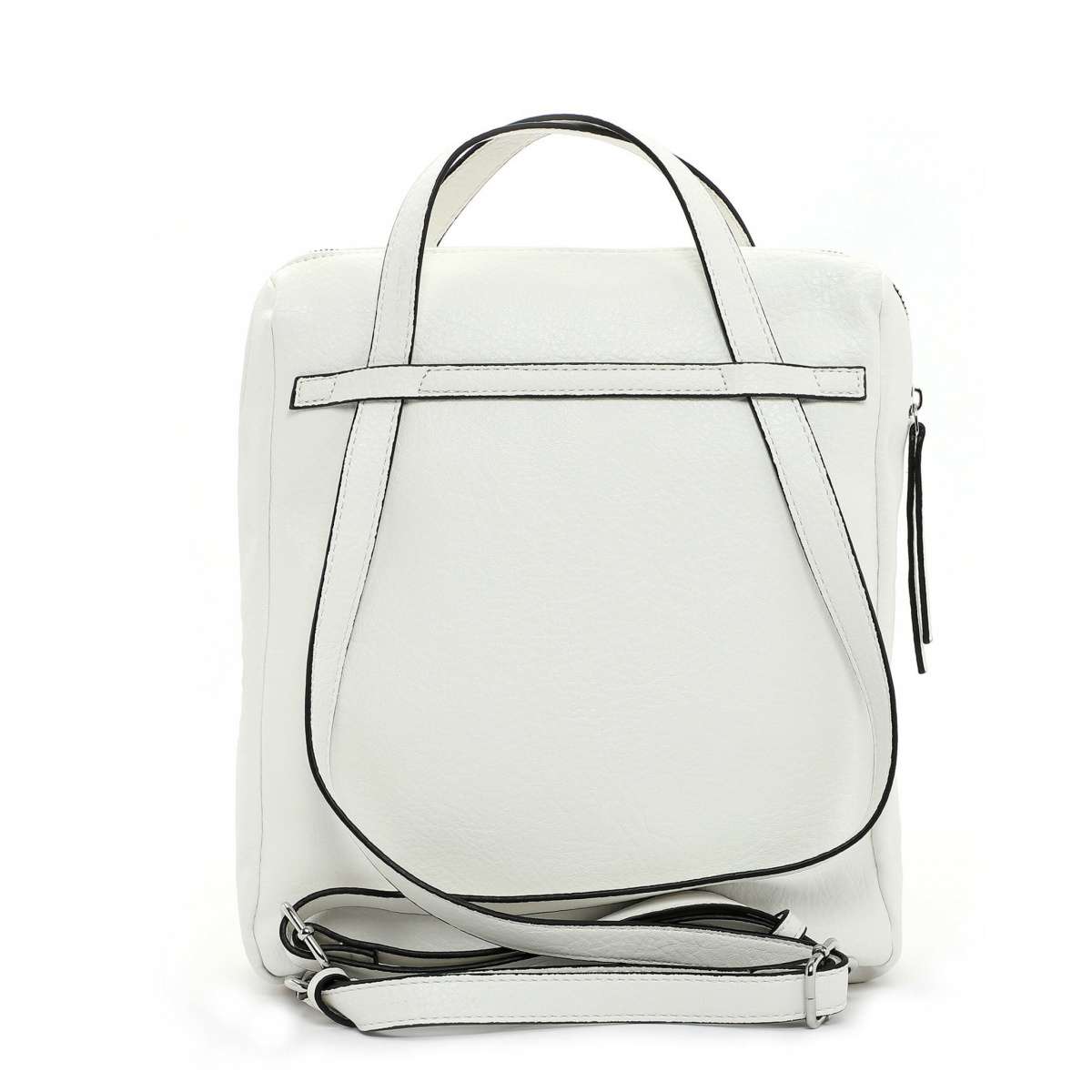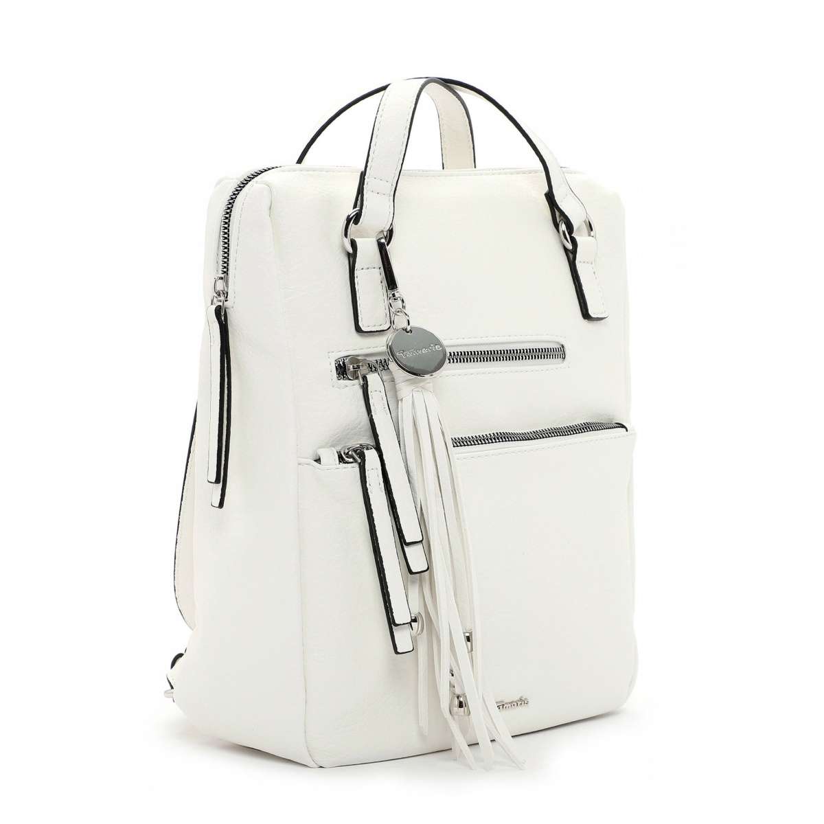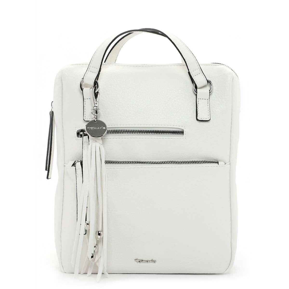 Dámský batůžek značky TAMARIS Vás nadchne svou jednoduchou elegancí a praktičností, jelikož z něj můžete mít zároveň stylovou kabelku. Přední strana je ozdobena dvěma praktickými kapsami a odepínatelným přívěskem s třásněmi. Uzavírání je na zip, po jehož rozepnutí se Vám otevře vnitřní prostor, kde najdete jednu kapsičku na zip a další dvě na drobnosti. Batoh má dva délkově regulovatelné zadní popruhy a dvě delší ucha na nošení v ruce. S tímto modelem budete vypadat úžasně za každé situace.
