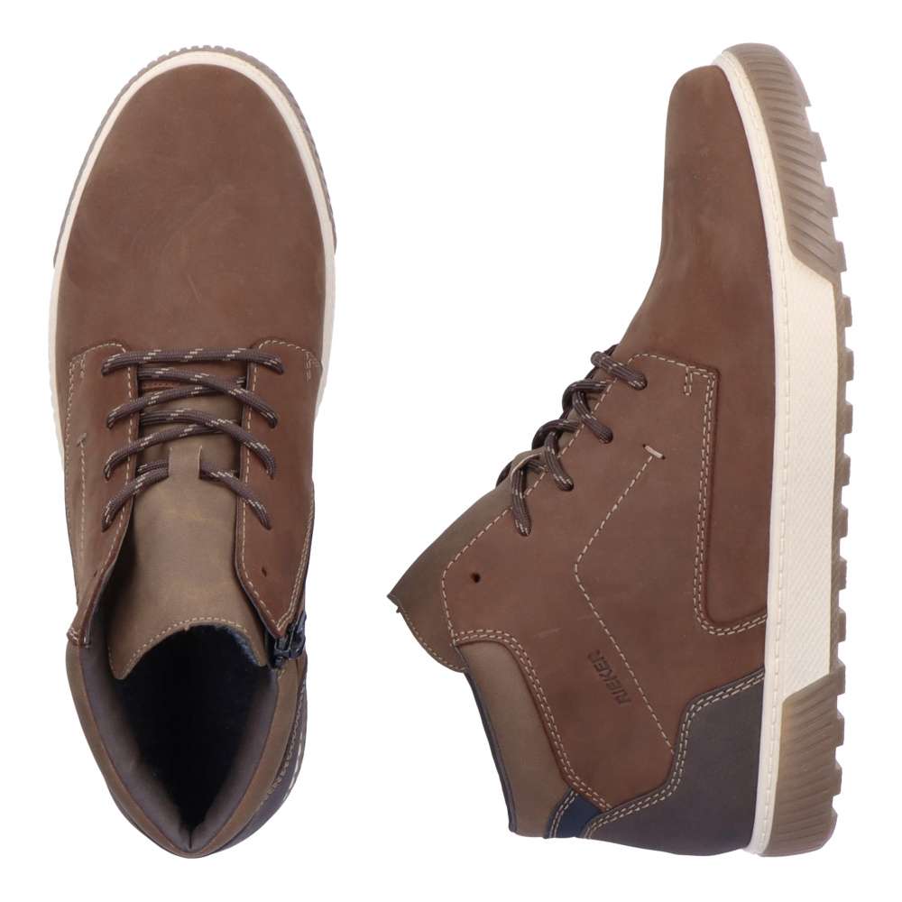Tyto zajímavé pánské kotníky ve stylu tenisek jsou od značky RIEKER a oblíbíte si je už po prvním obutí. Příjemný materiál hnědé barvy má výrazné prošívání světlou nití a zdobnou patní část. Ke snadnému nazutí poslouží tkaničky na šněrování, díky kterým si boty lehce přizpůsobíte na své chodidlo. Měkká stélka Vám zaručí pohodlí po celý den. Neváhejte a doplňte si botník tímto vkusným modelem. Technologie: Antistress – podešev je díky této technologii lehká, flexibilní, absorbuje nárazy při došlapu a snadno se přizpůsobí každé noze.